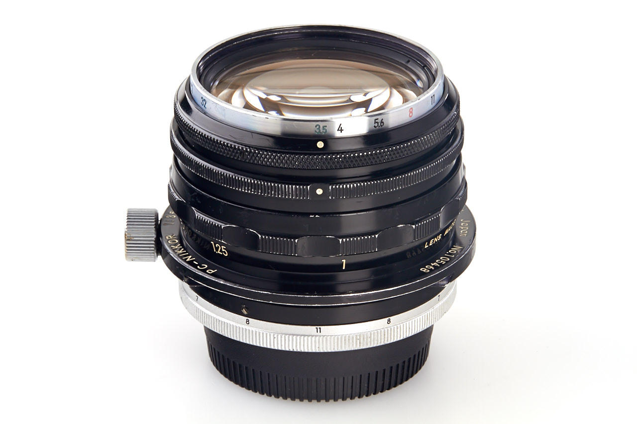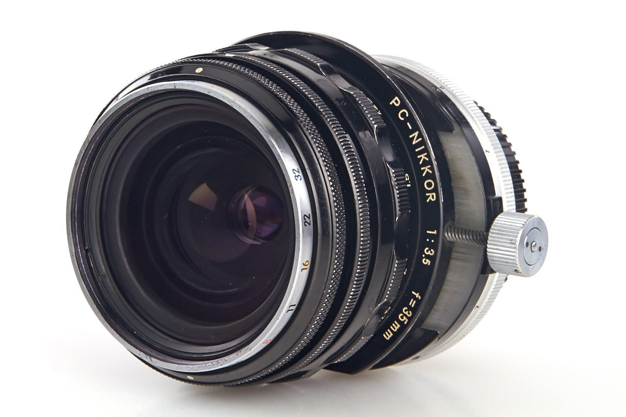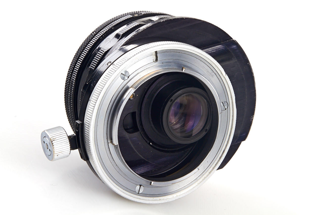 first version of this special Nikkor for architectural photography with an early Nikon F, in good condition with clean and clear glass, smooth and fully working slider, marked with ‚Nippon Kogaku Japan‘, with original hood, front and rear cap