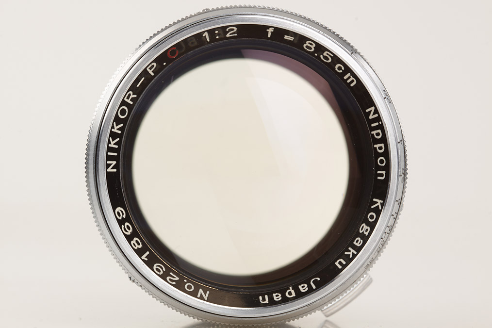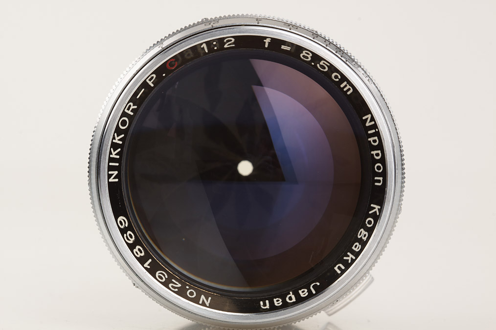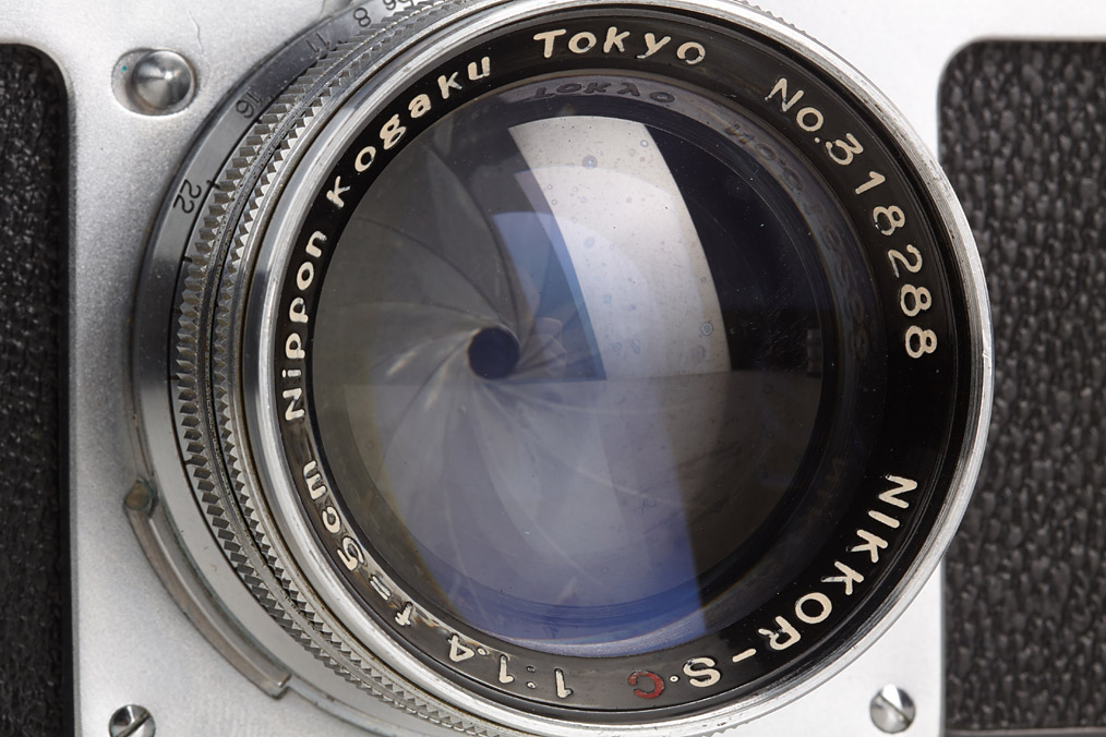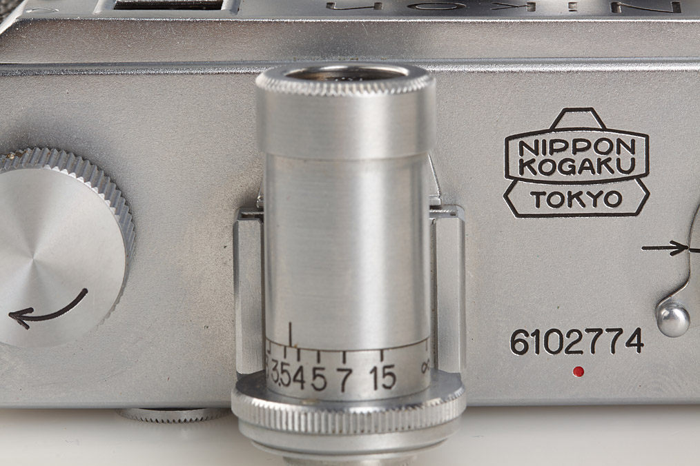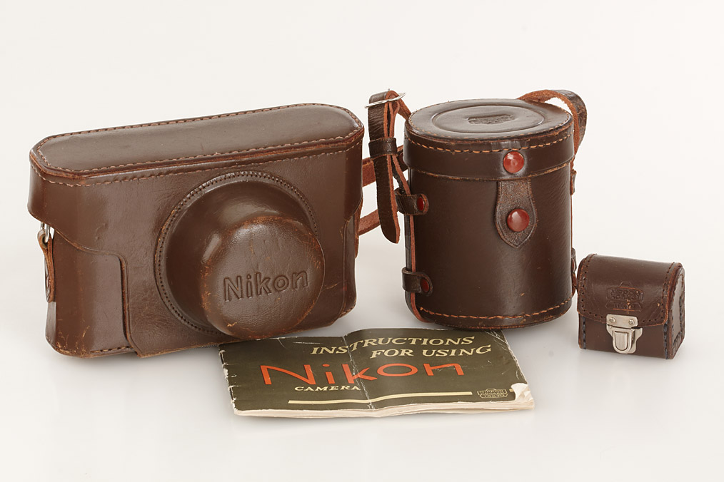 near mint body in good working condition with Nikkor-S.C 1.4/5cm no.318288 (cap), instructions, everready case, and Nikkor-P.C 2/8.5cm no.291869 (clean lenses, hood, caps, keeper) with matching chrome 8.5cm finder (case)