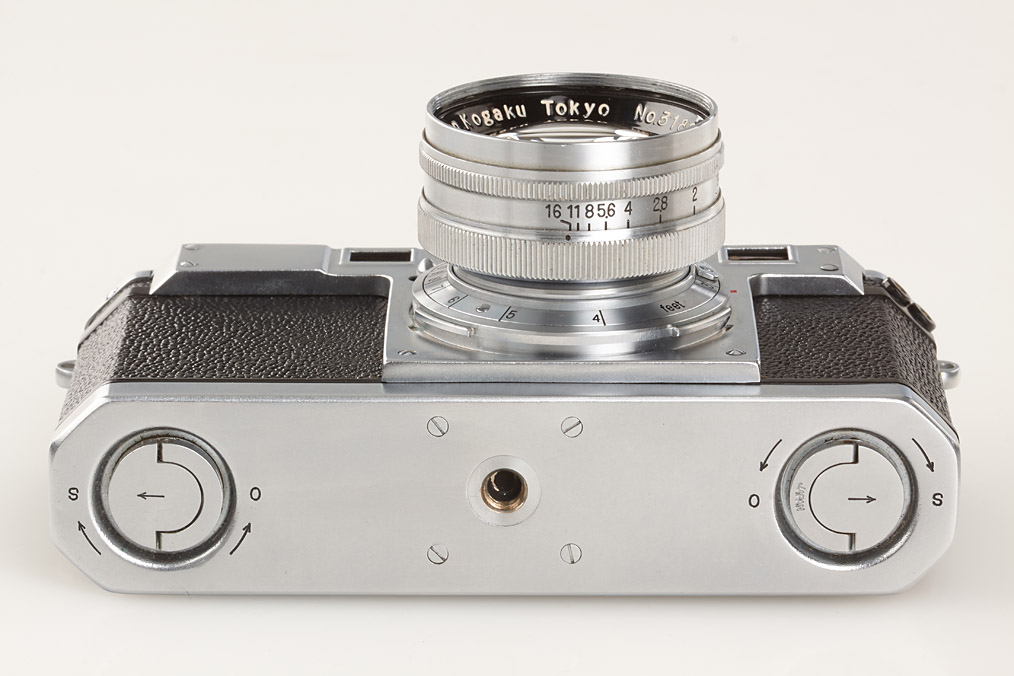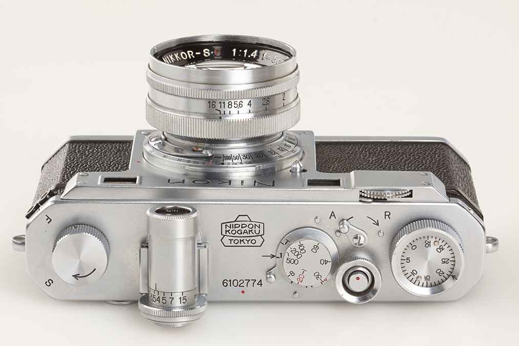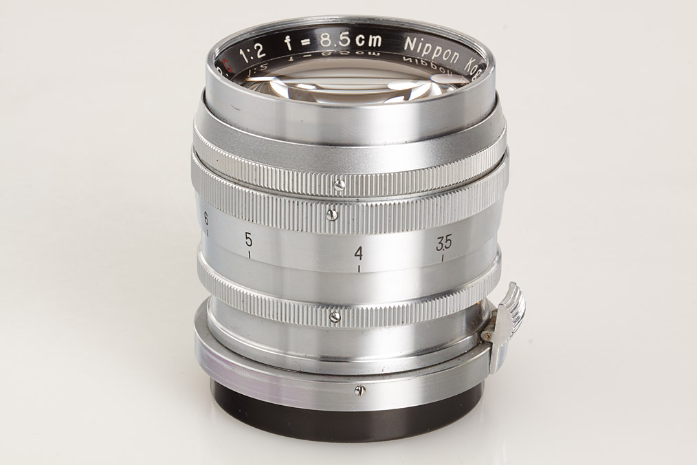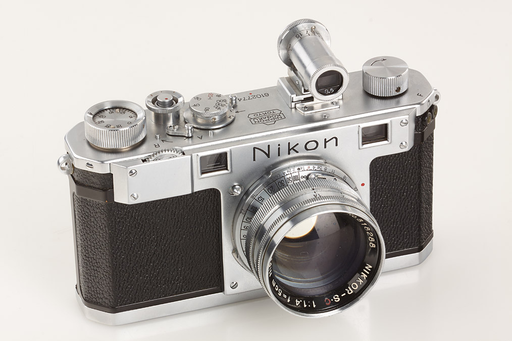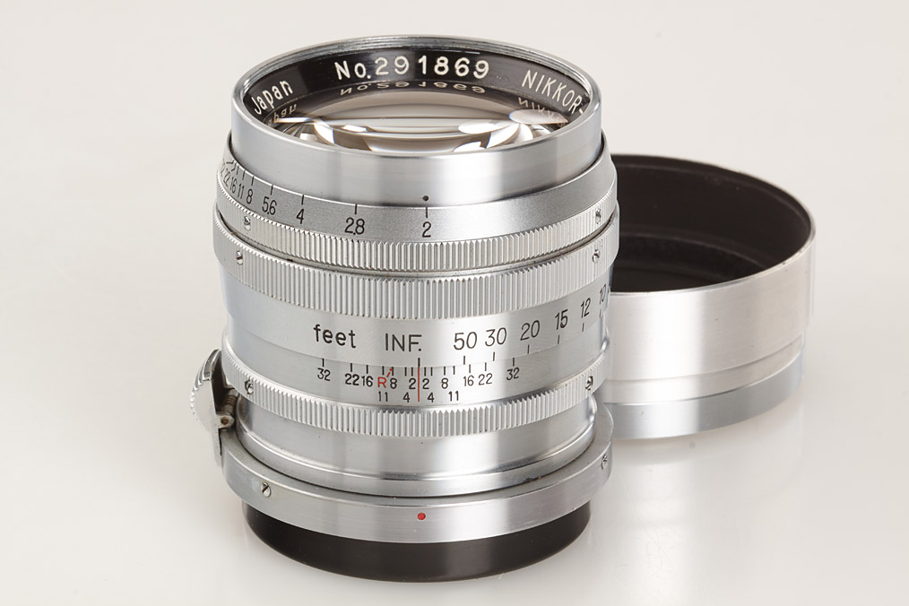 near mint body in good working condition with Nikkor-S.C 1.4/5cm no.318288 (cap), instructions, everready case, and Nikkor-P.C 2/8.5cm no.291869 (clean lenses, hood, caps, keeper) with matching chrome 8.5cm finder (case)