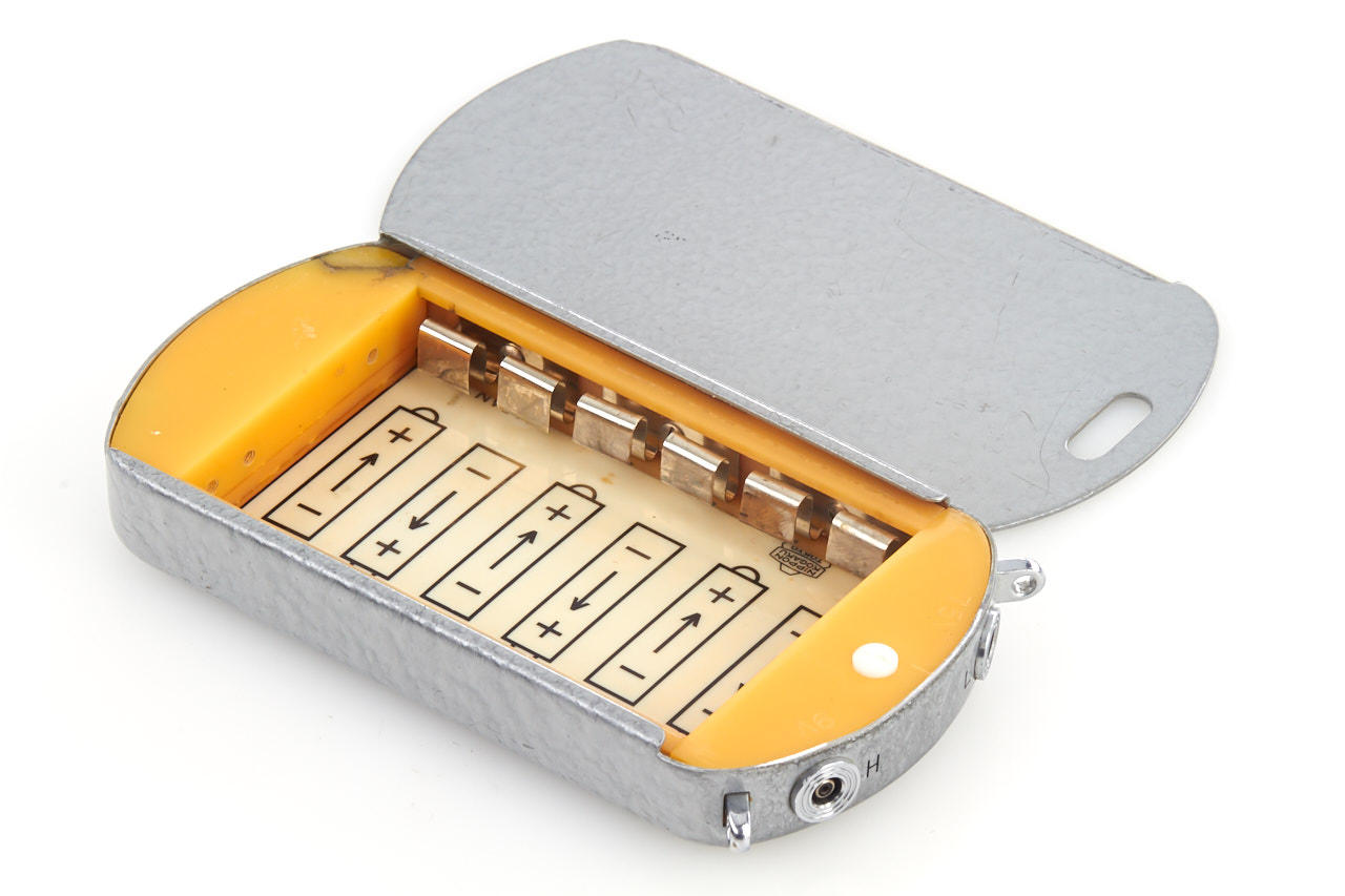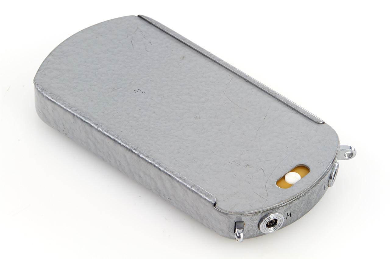 unique prototype of the extremely rare 'Sardine' grey battery pack in hammer tone finish, with three connectors: one unmarked, one marked inside with '7.5V', third marked inside with '9V', for six AA batteries, 'Nippon Kogaku Tokyo' - logo inside, with original grey connecting cable
