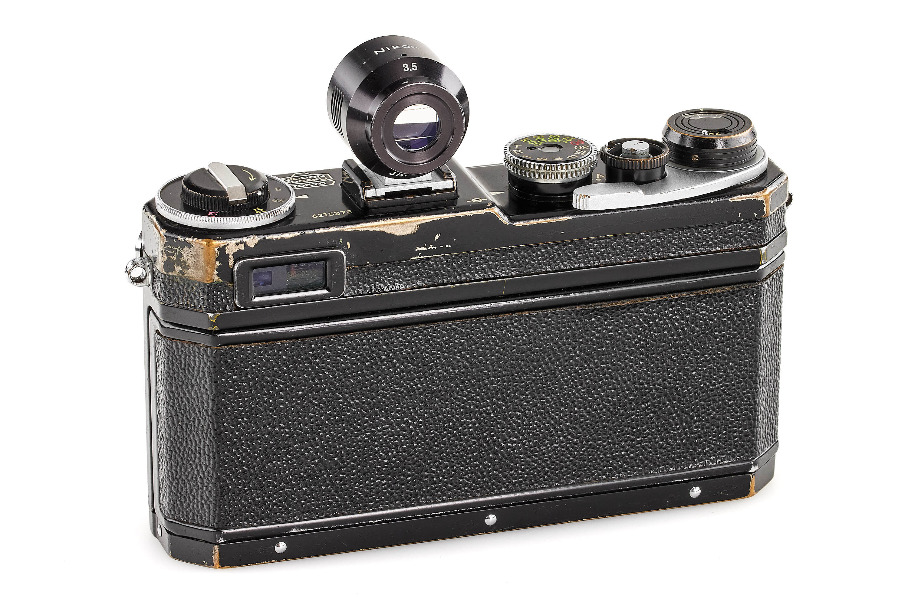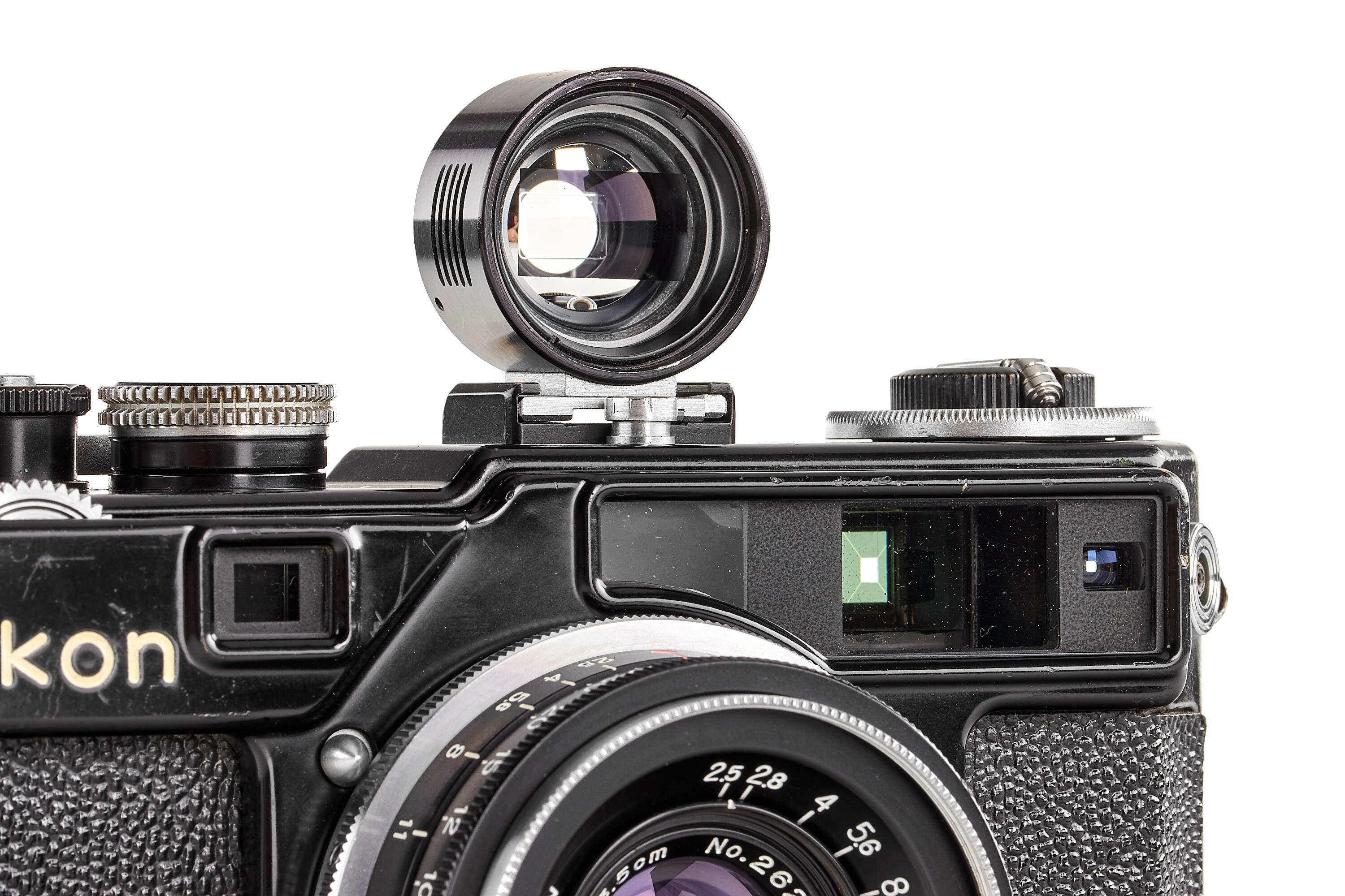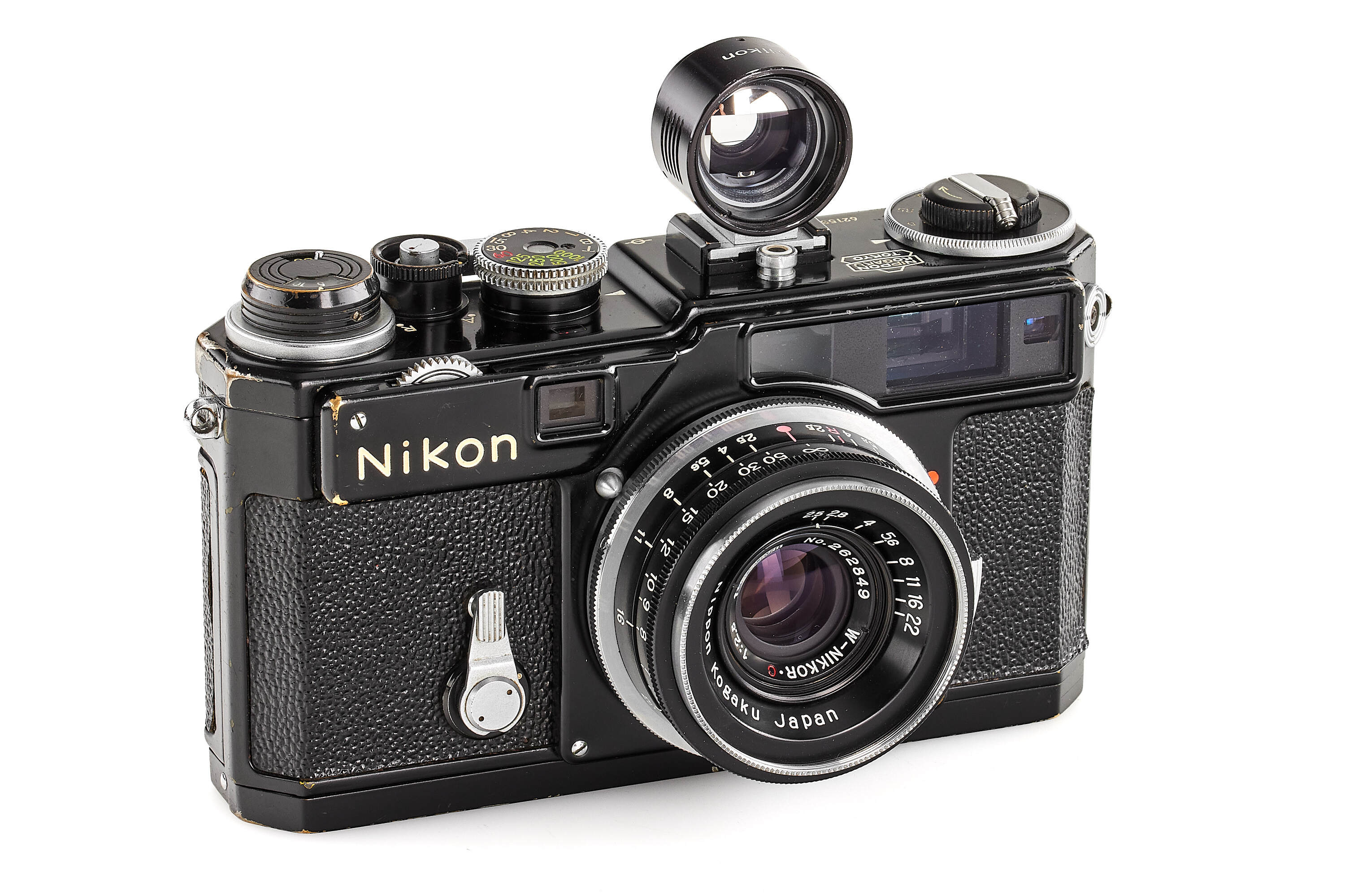 Beautiful original black paint body, in very good condition, with Titanium foil shutter curtains, with 2nd type black W-Nikkor-C 2.5/3.5cm no.262849, with final design finder 3.5cm with 'Nikon' engraving, with late Nikon light-meter, with booster (cracked).