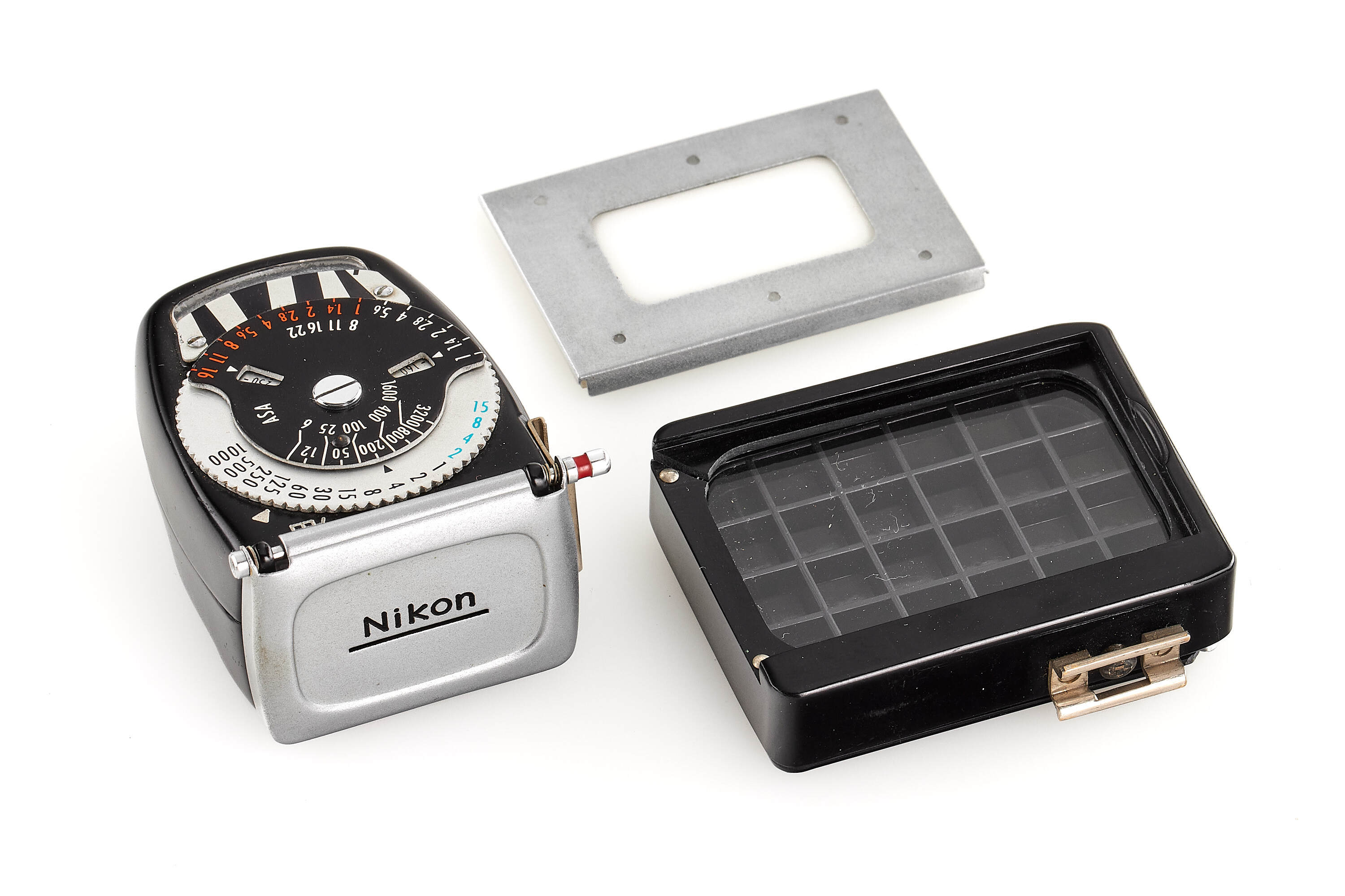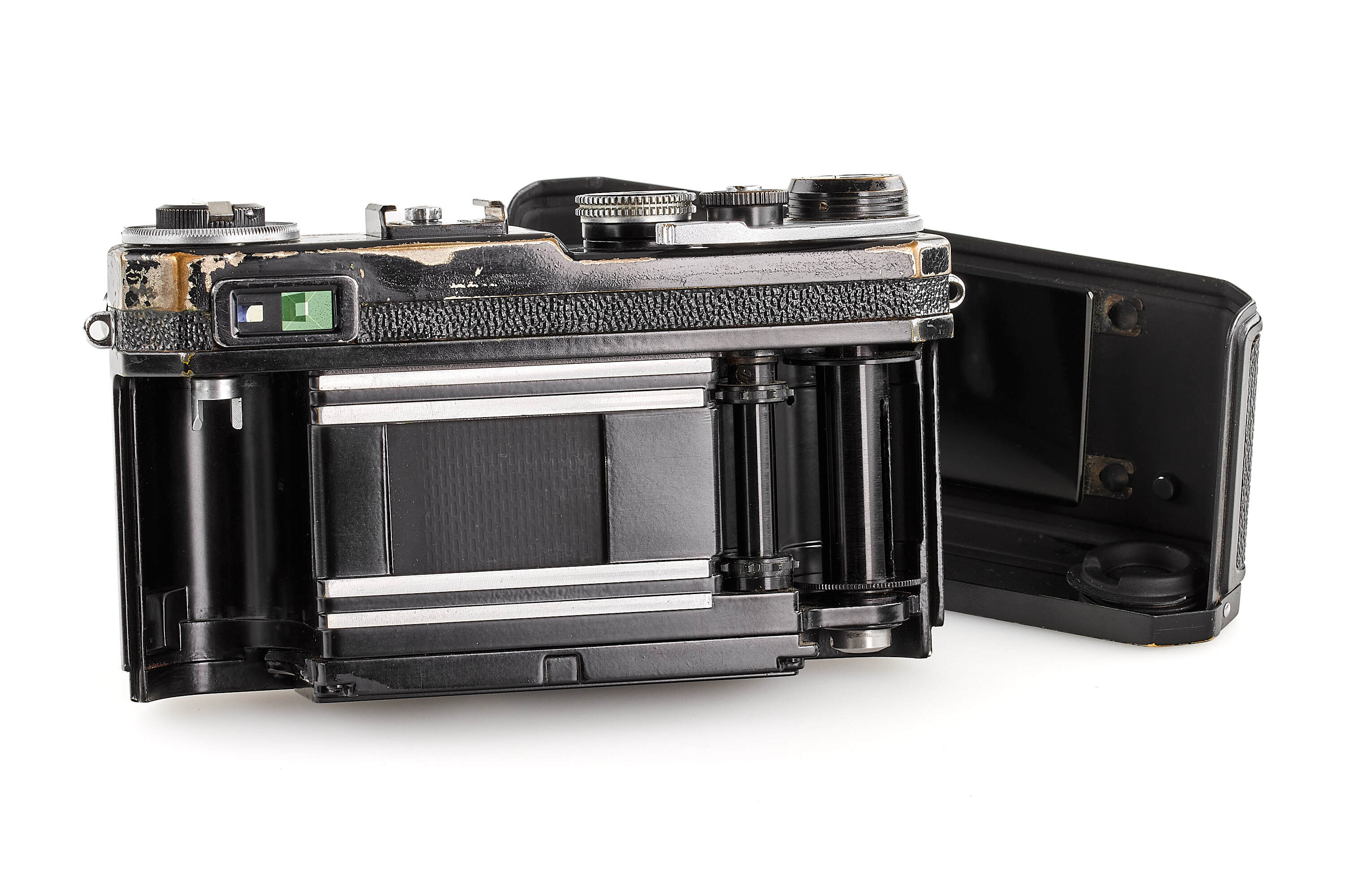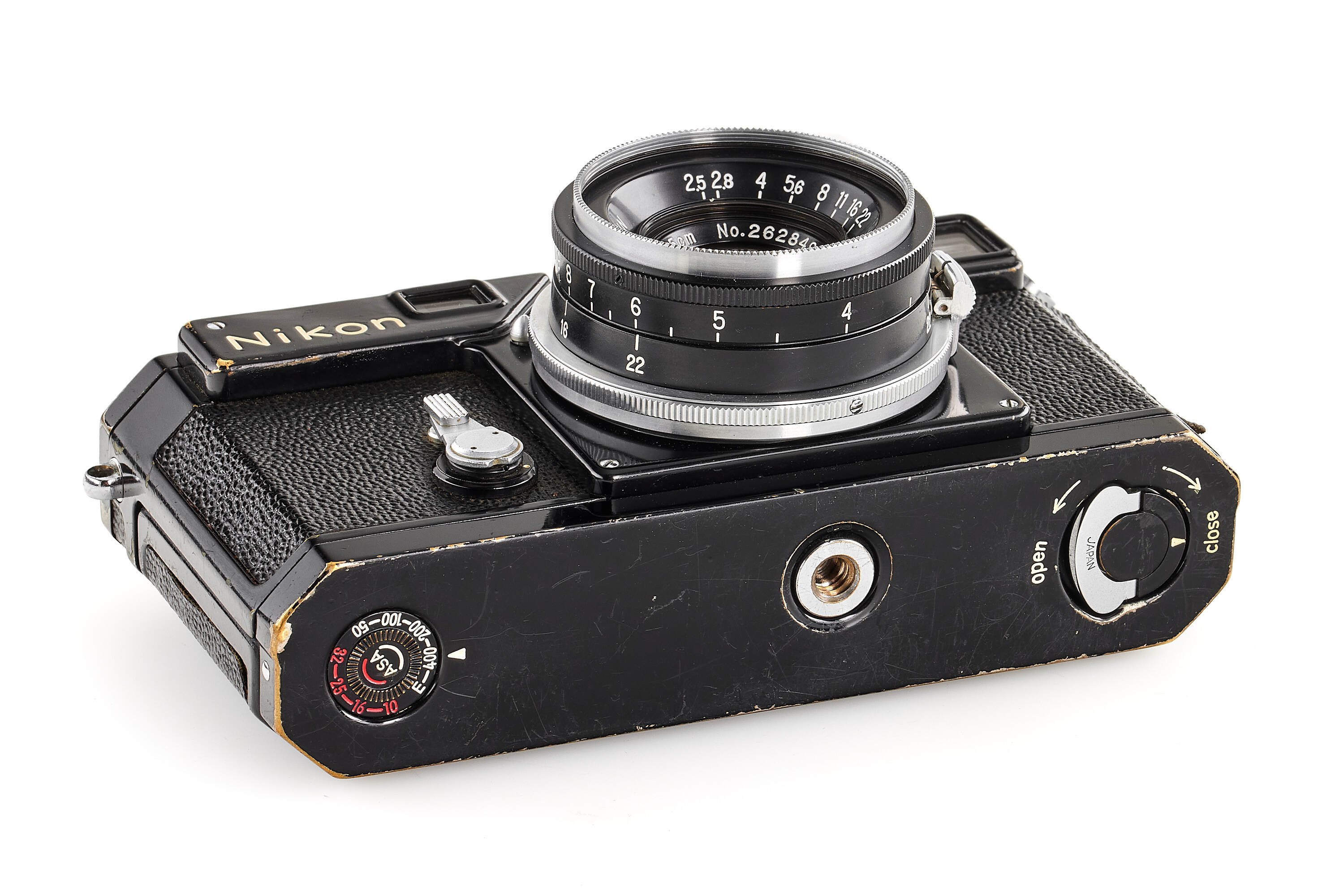 Beautiful original black paint body, in very good condition, with Titanium foil shutter curtains, with 2nd type black W-Nikkor-C 2.5/3.5cm no.262849, with final design finder 3.5cm with 'Nikon' engraving, with late Nikon light-meter, with booster (cracked).