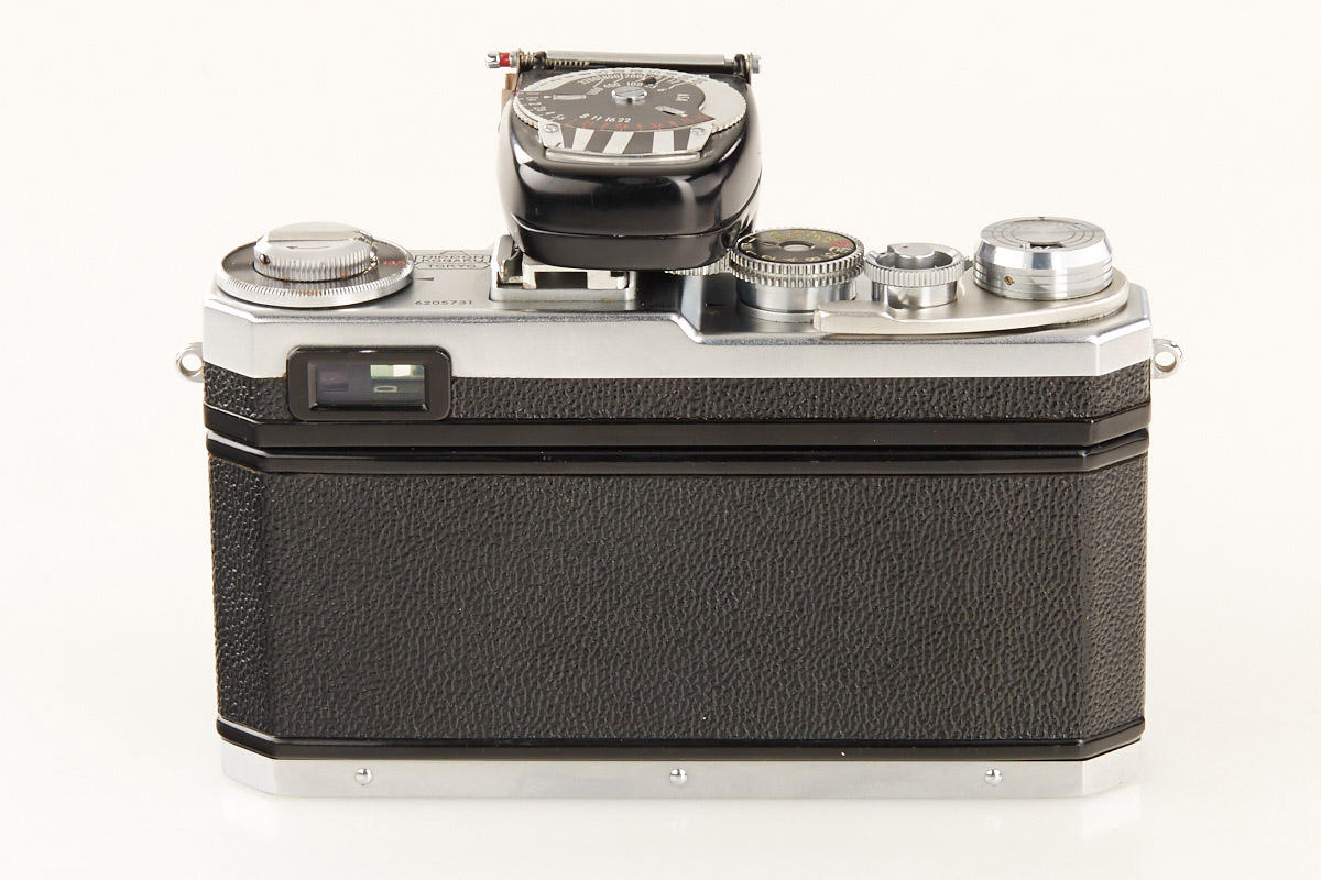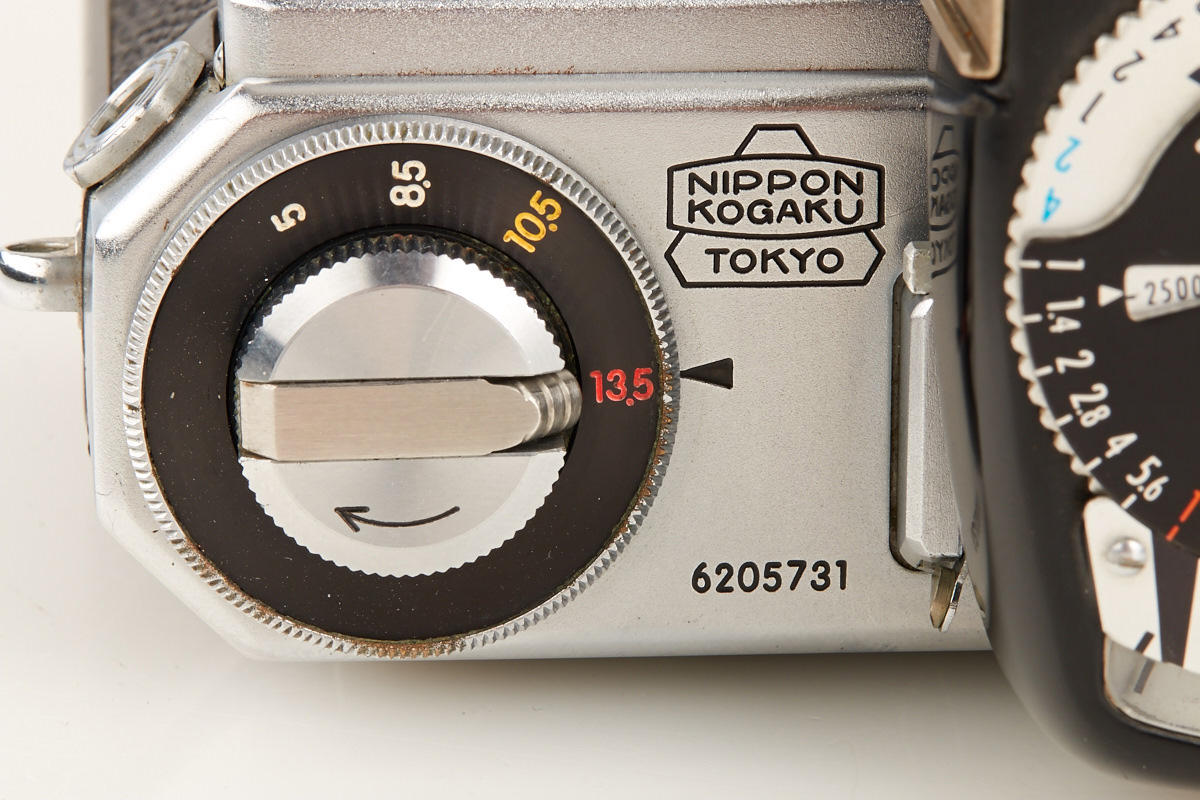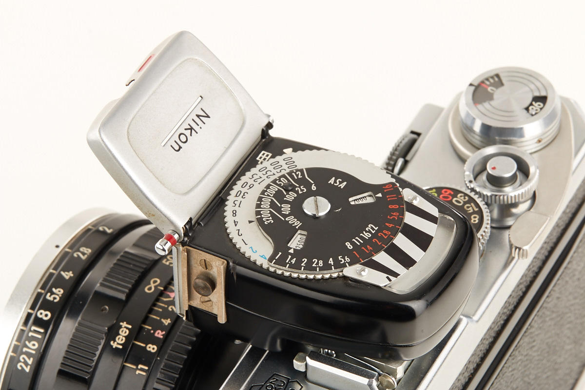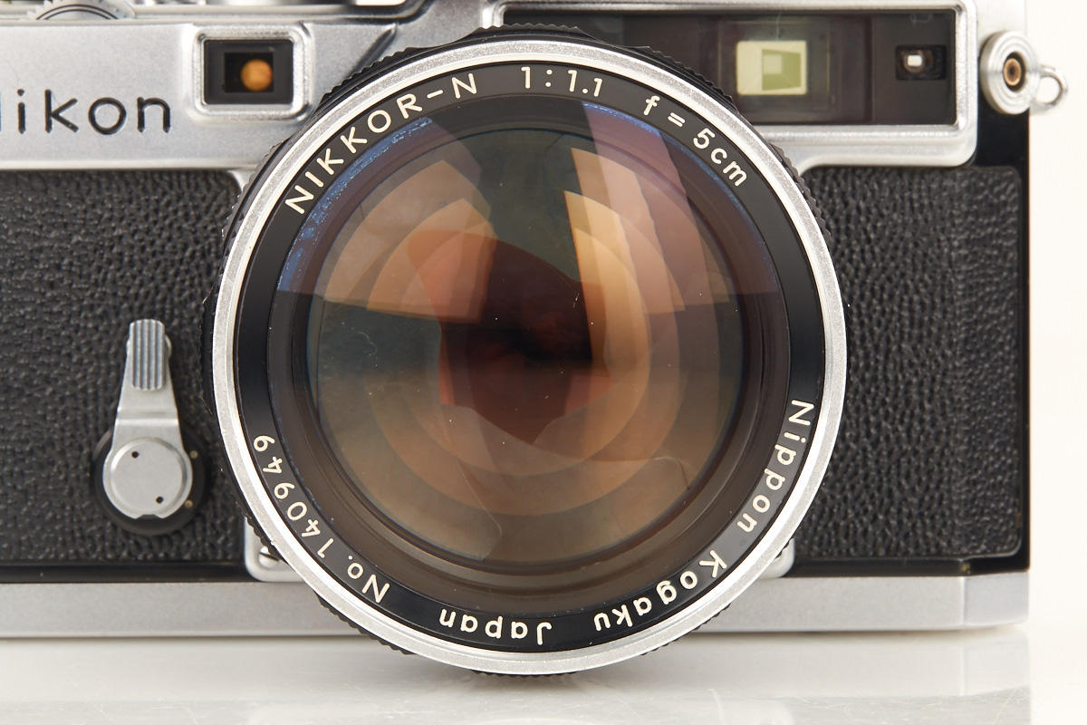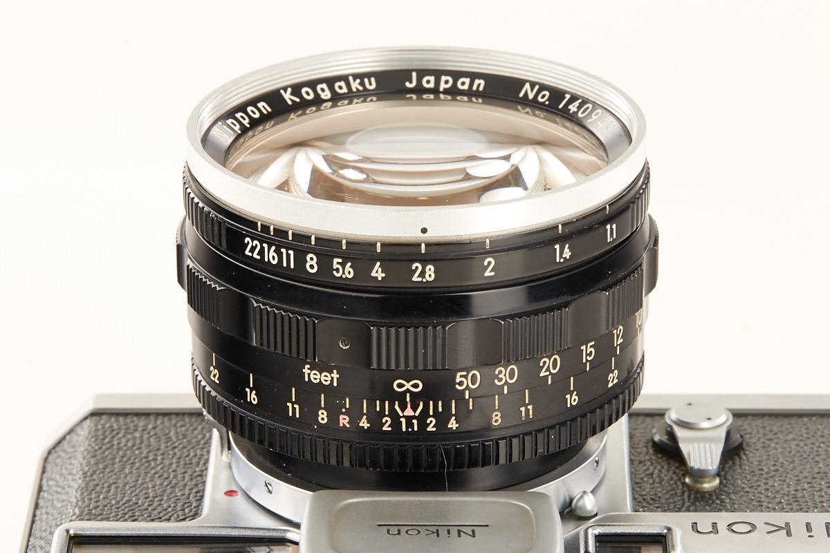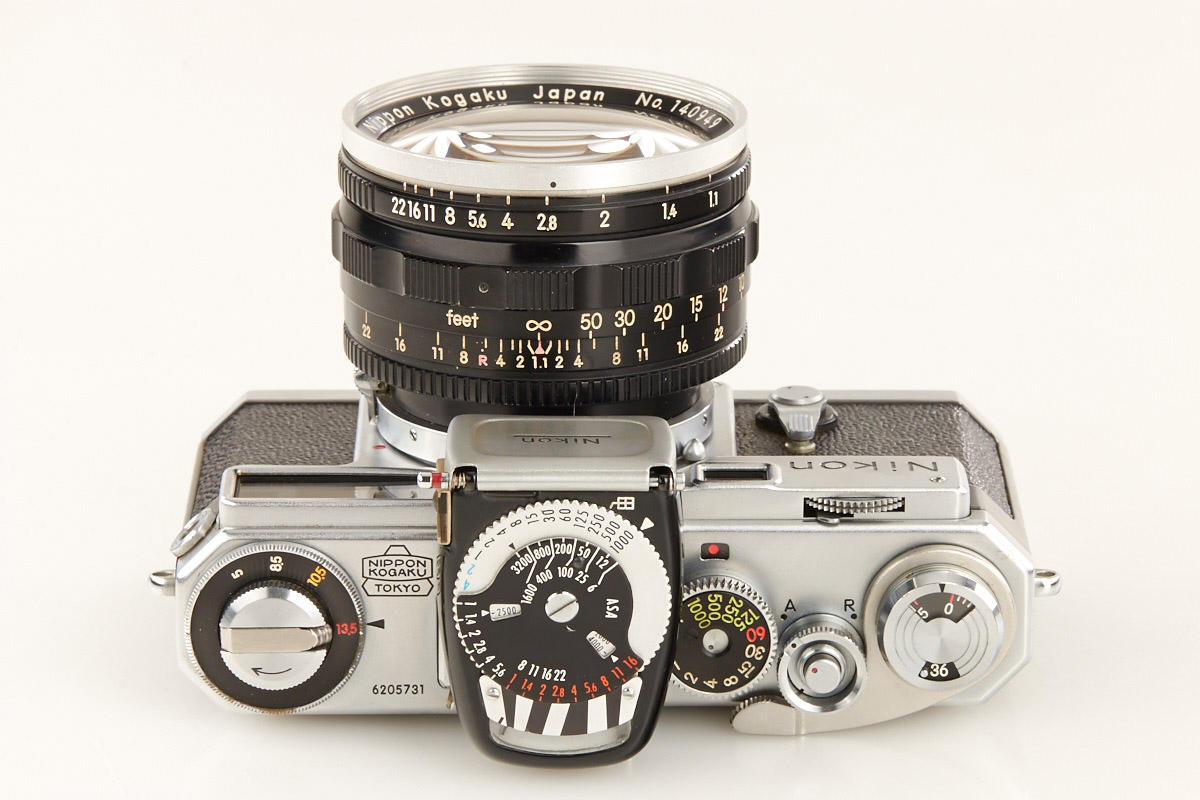 good working body with cloth shutter and fast external mount Nikkor-N 1.1/5cm no.140949 (some cleaning marks, half of aperture blades missing), black/chrome Nikon exposure meter no.9630191 (operable)