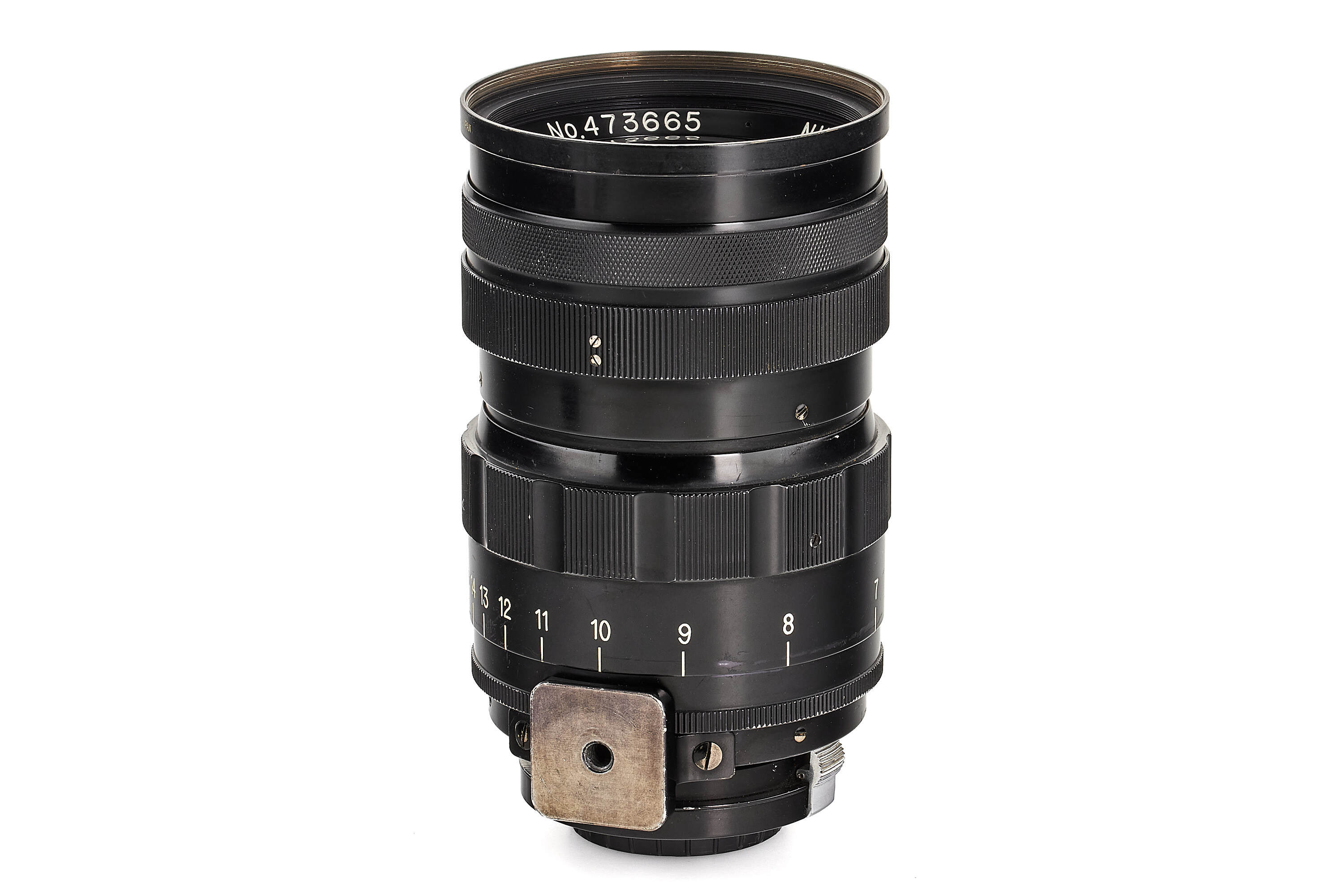 A very early Nikkor 18 cm f/2.5 in S-mount, designed for use with Nikon’s reflex housing on rangefinder bodies. The offered lens is no. 473665, falling within the later production block 473500–474xxx, generally attributed to the mid-1950s. Total production for the S-mount version is estimated at ≈1,200 units, underscoring its rarity. Introduced in November 1953, this fast telephoto provided press and sports photographers with exceptional light-gathering ability. In very fine condition, with clean optics and smooth mechanics—an important and highly collectable milestone in Nikon’s early telephoto development.