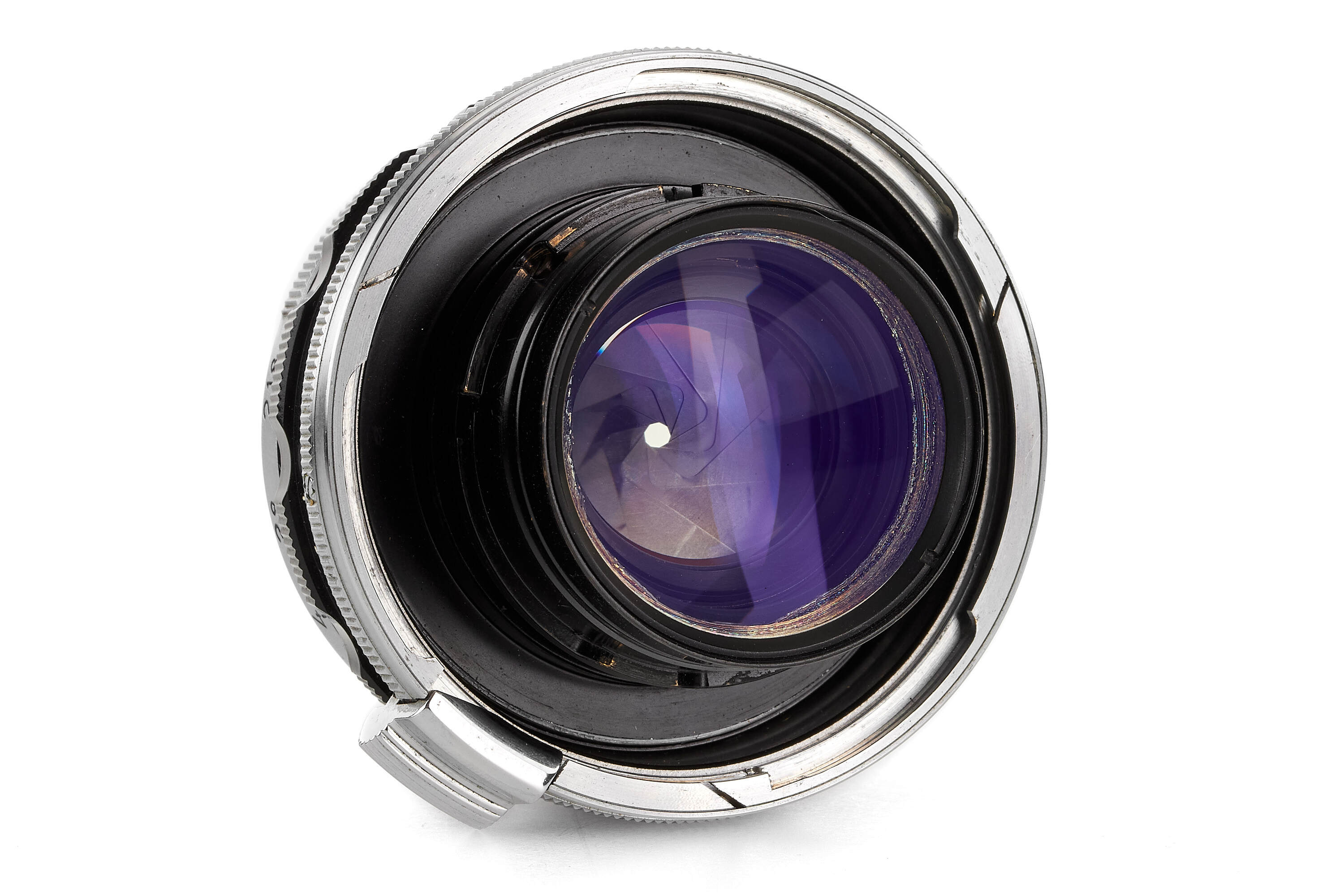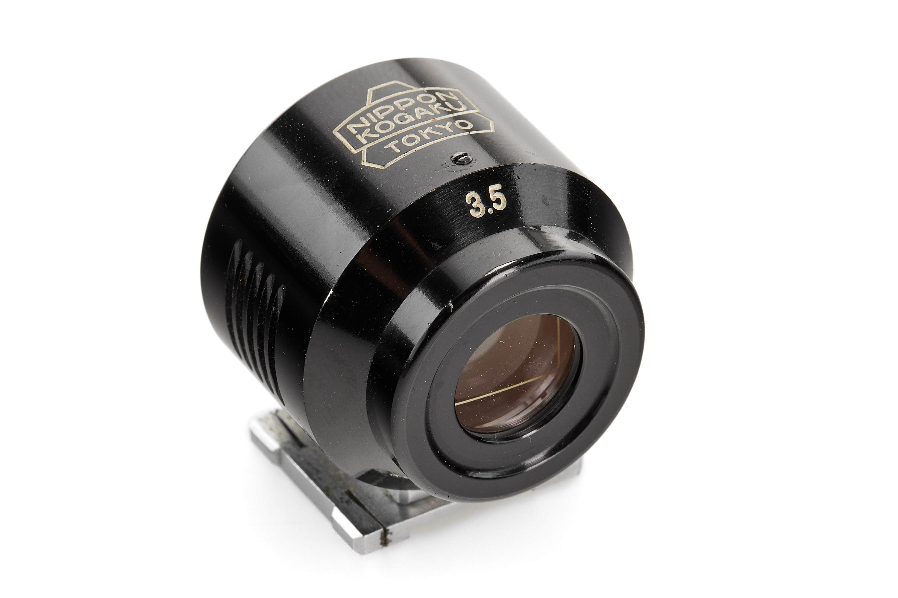 Quite rare wide angle in Nikon rangefinder mount, second version with chrome aperture ring, in mint condition, optics only showing a thin separation on the rear element, with unusual 3.5cm finder with its leather case.