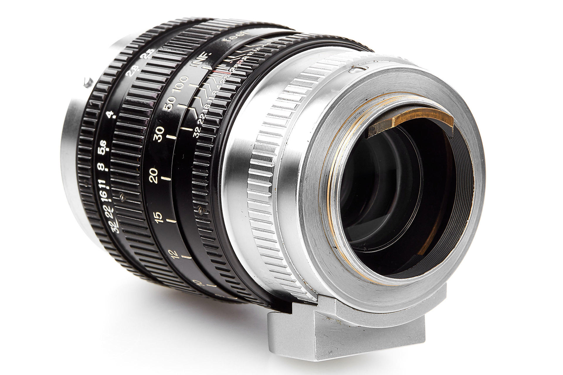 rare first type, in excellent condition, very good optics with only minimal marks on front element, incl. special original black metal hood and front cap, rear cap, the hood with its bayonet mount is unique to this first type lens