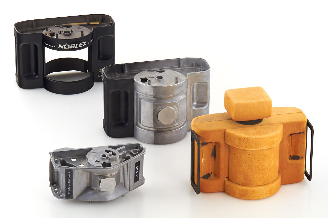 three stages of development of the Noblex Pro 6/150 HS camera: from a hard foam prototype, through raw aluminium cast housing to the empty finished housing, together with a smaller Noblex 135U aluminium cast housing and Noblex folders and sample pictures