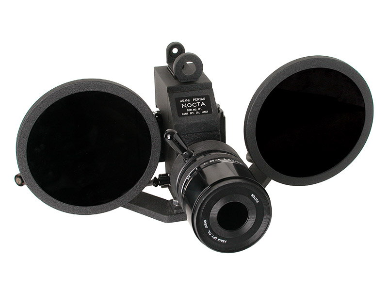 Sehr seltene Ausrüstung für Infrarot-Fotografie, adaptierte Pentax S, schwarz mit Infrarot Spezialobjektiv f=3,3 NDx256, doppelter Infrarot-Blitz, Zubehör, in orig.Holzkiste