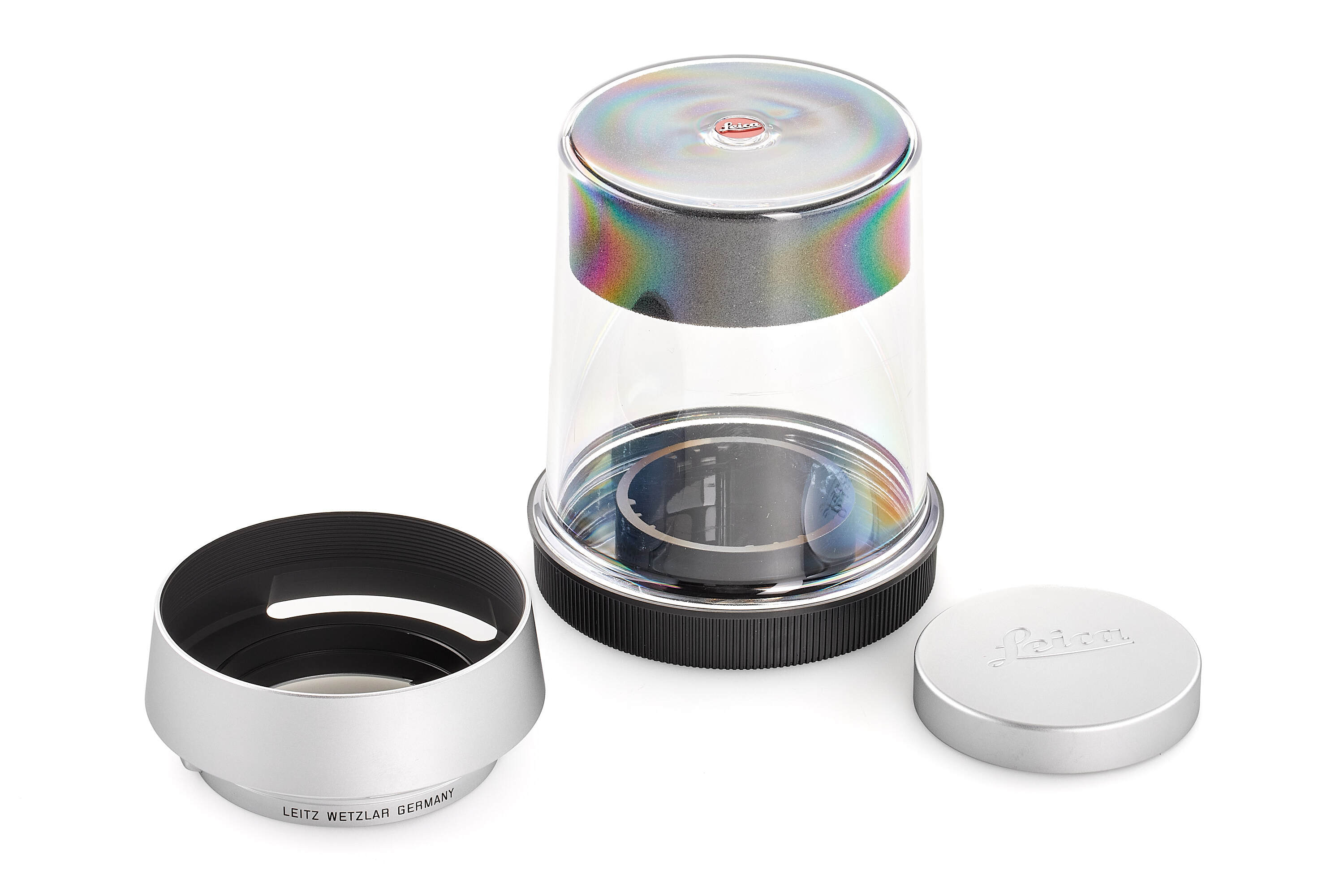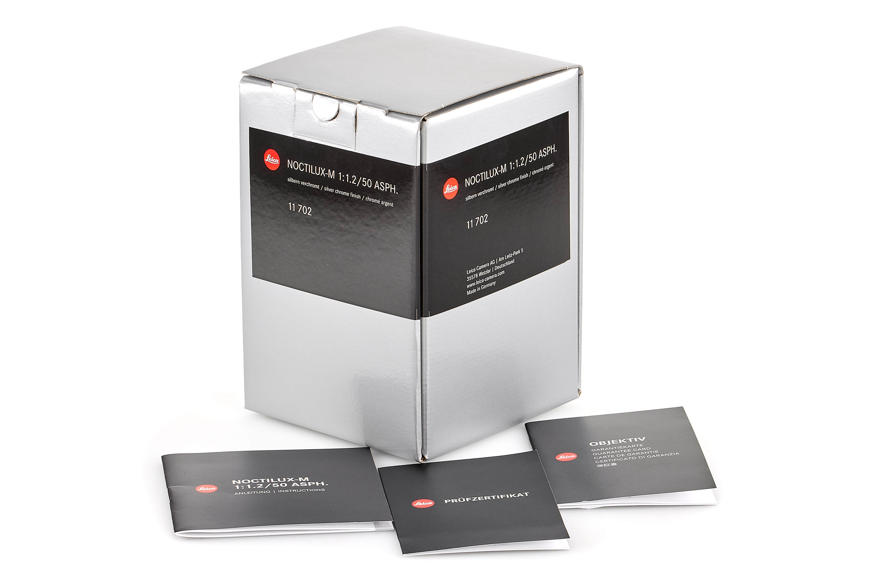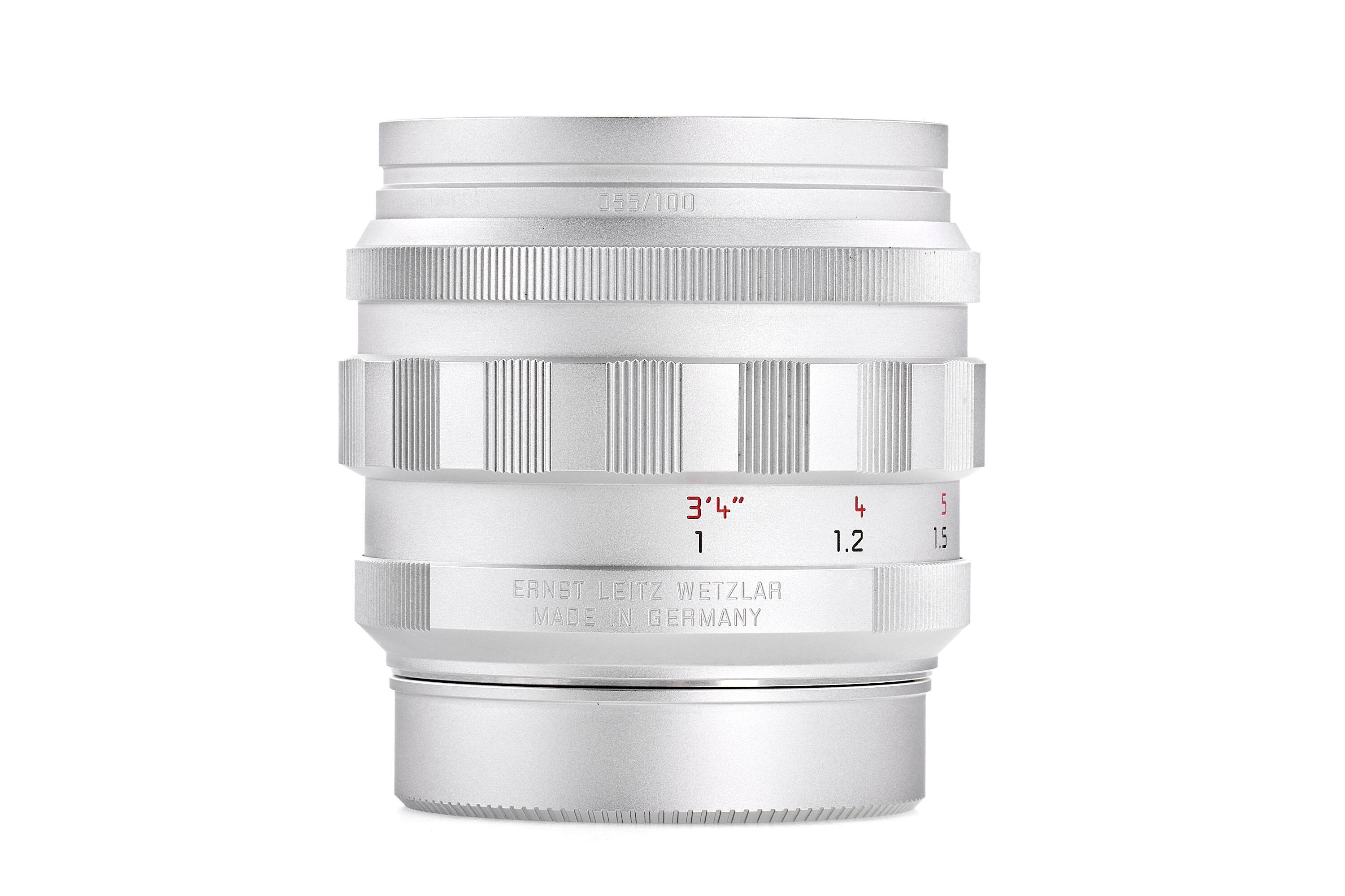 The Noctilux 50 f/1.2 was one of the first serially produced Leica lenses to feature a black finish. During the transition phase of moving from silver to black-paint lenses, Leica made a very small number of Noctilux 50 f/1.2 prototypes with a silver finish. Today, they count among the most coveted and highly-priced M lenses that there are. As a homage to the ultra-rare Noctilux in silver, Leica released a special edition of the Noctilux-M 50 f/1.2 ASPH. with a silver chrome finish. Its packaging has been designed to emulate the original box of 1966. The lens barrel is made of brass rather than aluminium. Instead of the customary Leica engraving, the front ring is marked with the letters LEITZ WETZLAR – just like the original Noctilux 50 f/1.2. Only 100 units of this special-edition model were available worldwide. The offered example bears the serial number 4785237, special edition number 055/100 and is in perfect, unused condition.