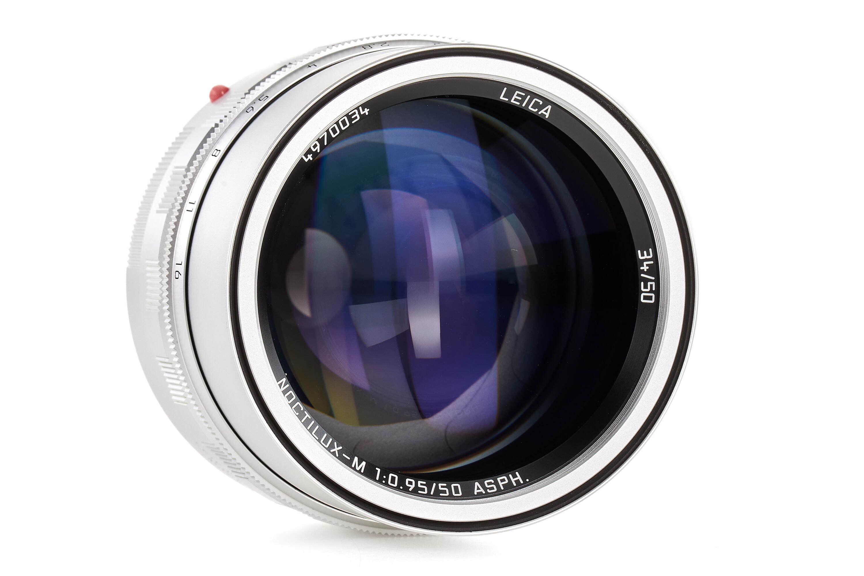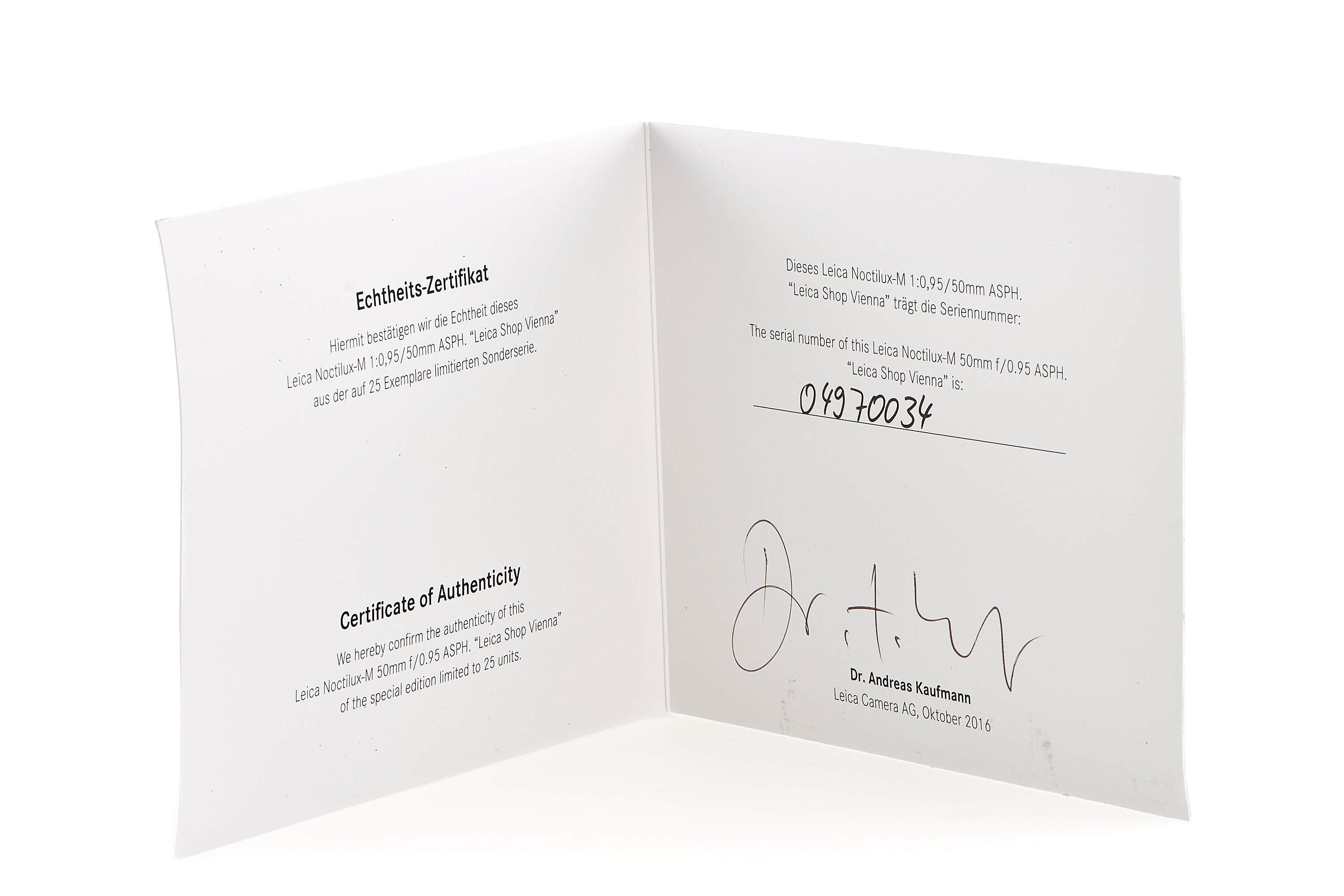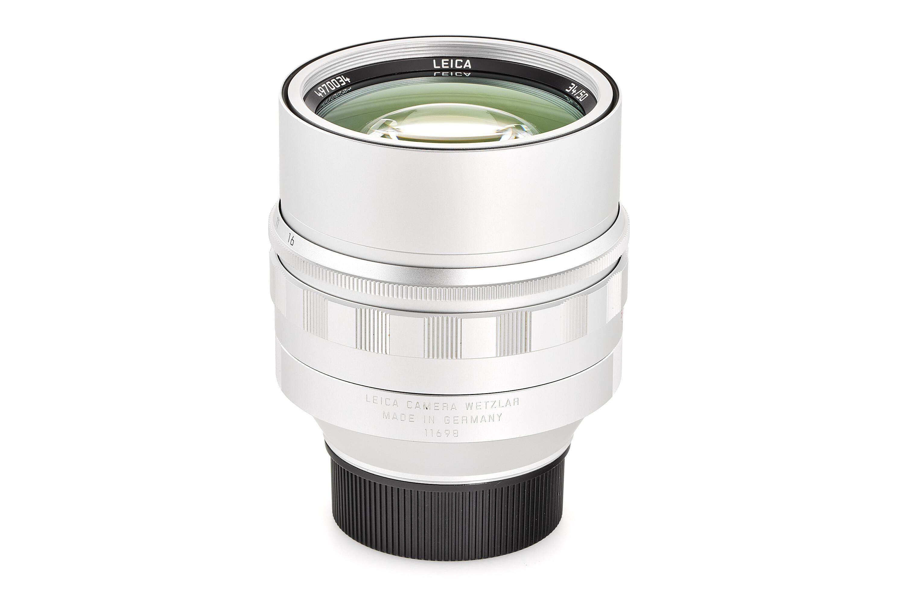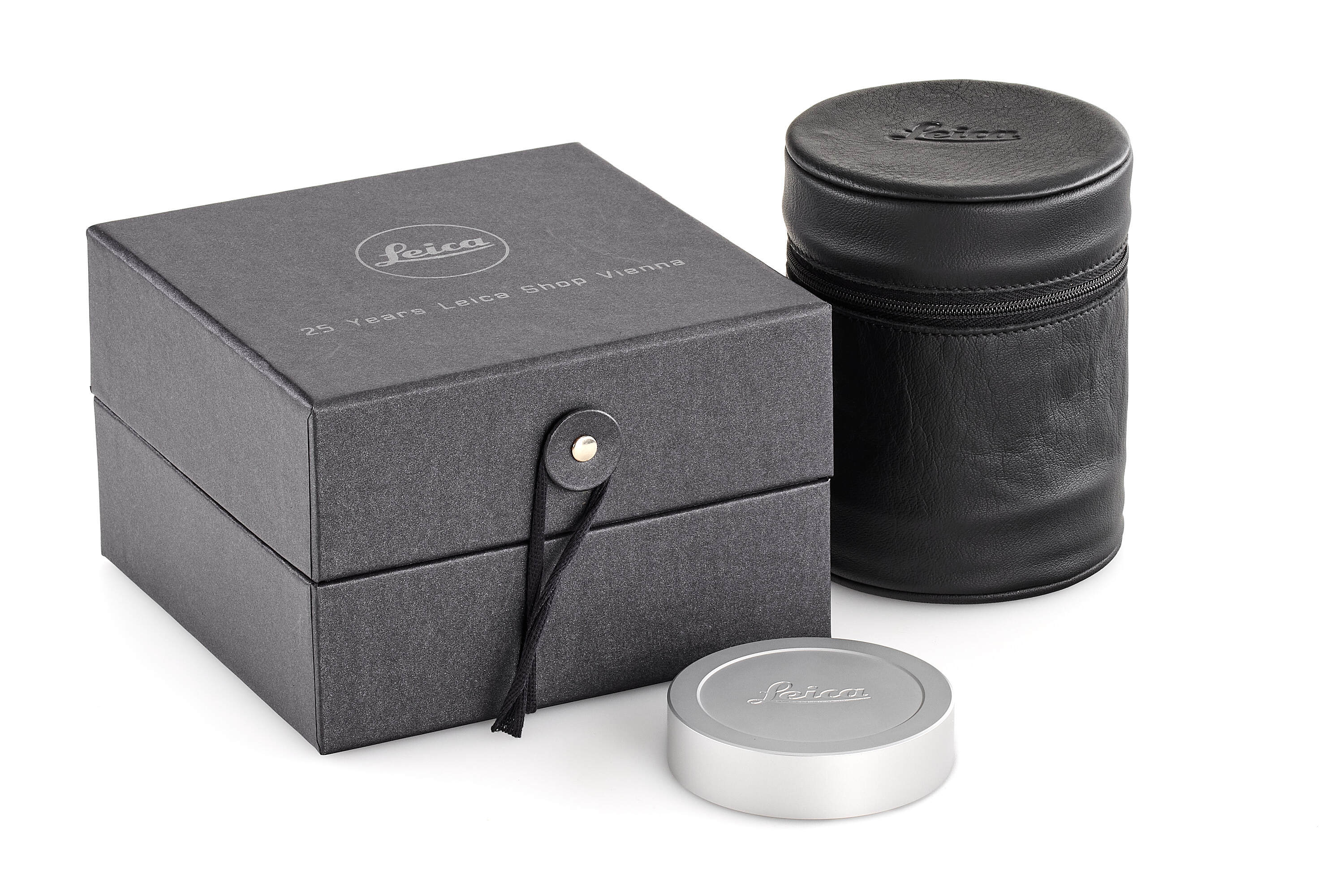 Special edition lens released to celebrate the 25th anniversary of Leica Shop Vienna, serial number 4970034, with special number engraved on the front rim 34/50, in chrome finish, with old style scalloped focusing ring, in mint, unused condition, complete with maker's box, keeper, papers.