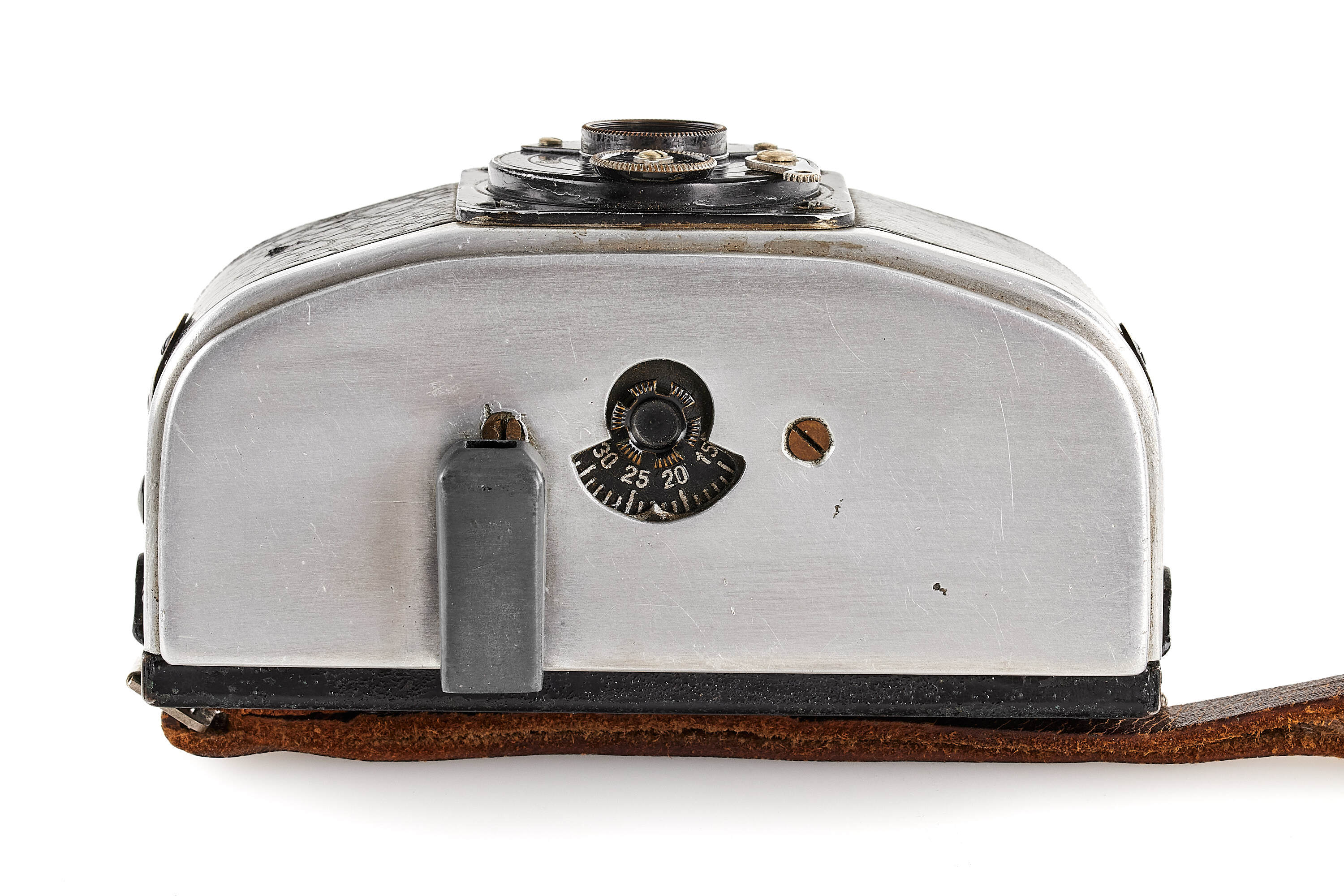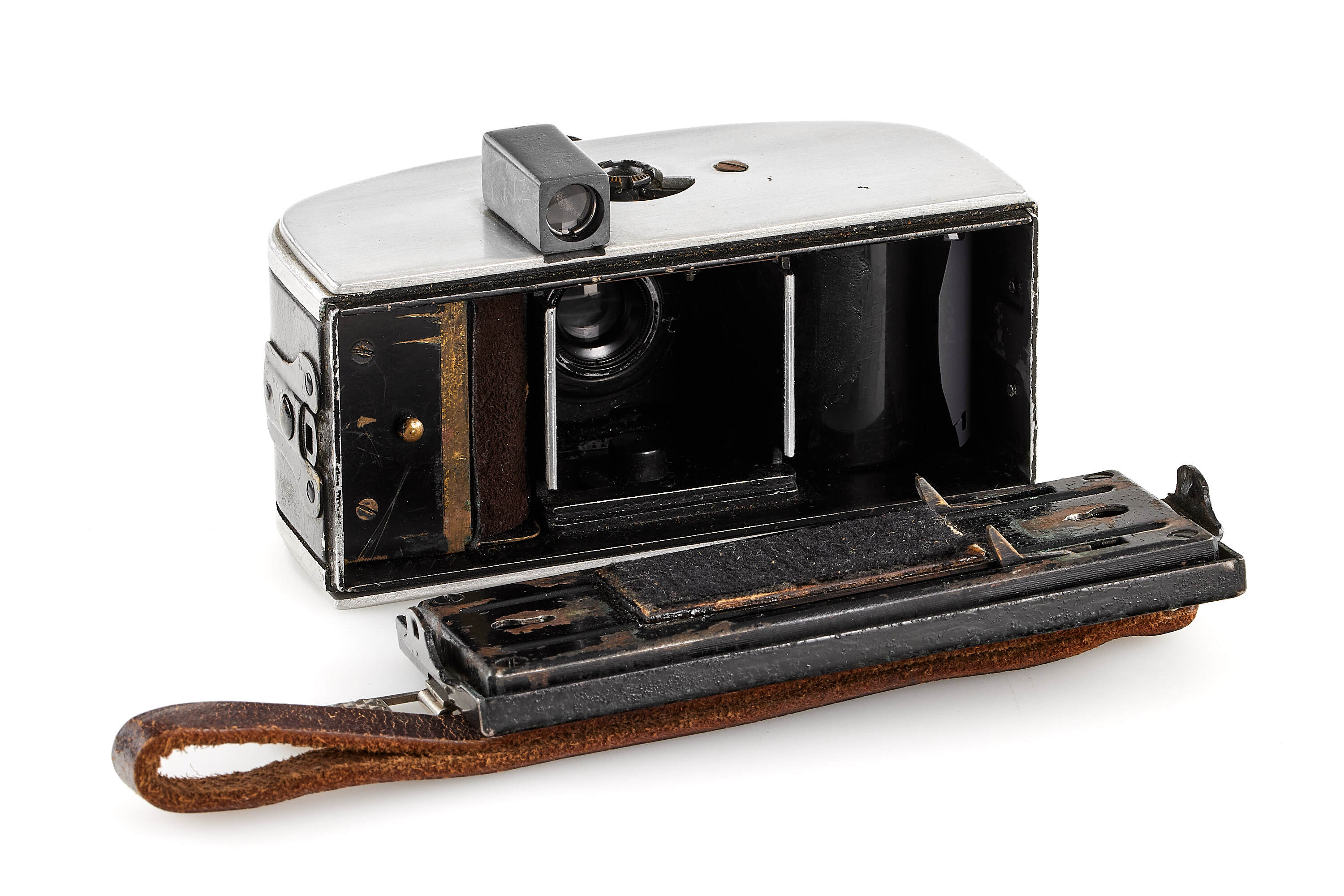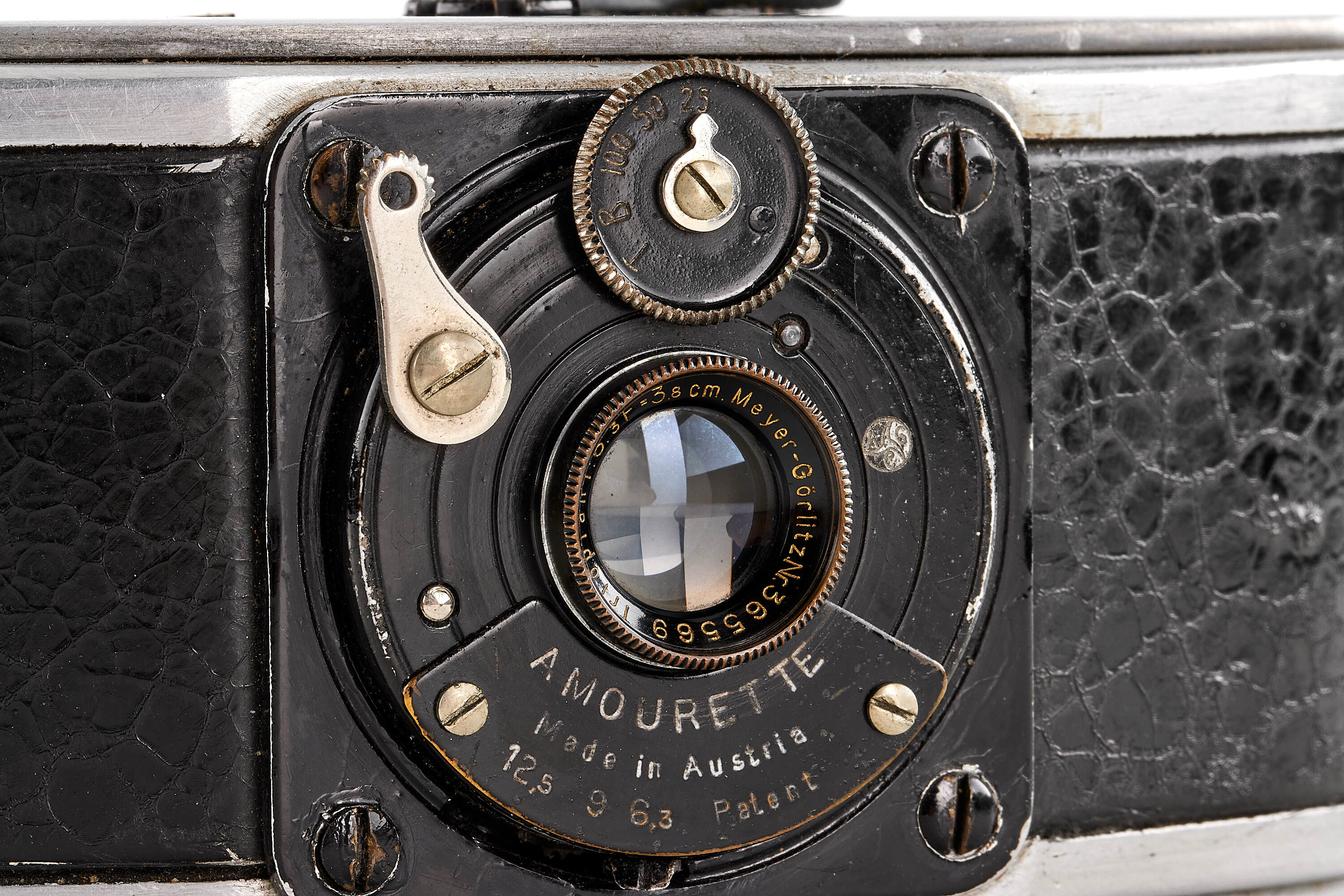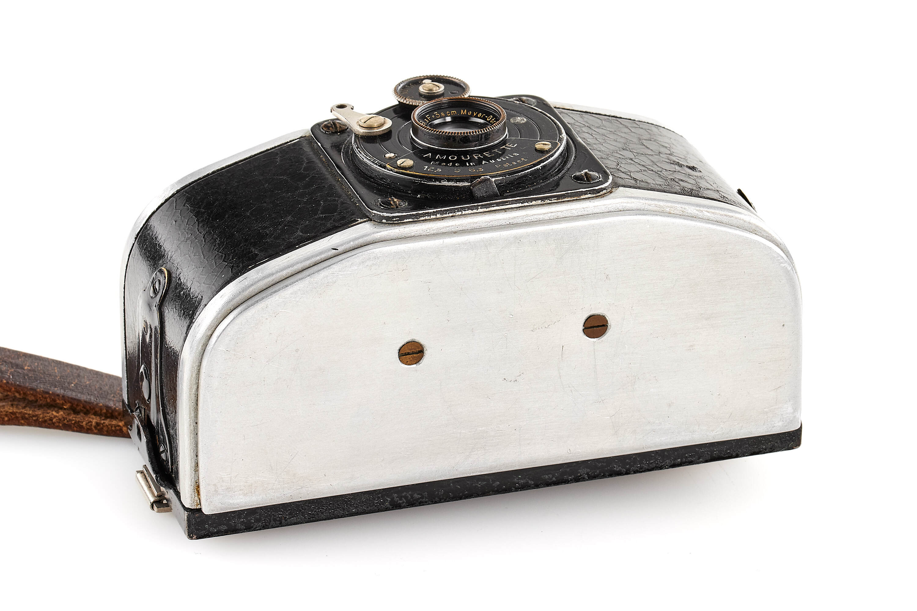 Very interesting and rare experimental OTAG Amourette camera made in Austria, 23x31mm on 35mm film with special ingenious film transport with double cassette, note the tubular finder instead of foldable Galilean type, absence of tripod mount, top and bottom plated without finish, 'Amourette' engraved under the lens, with unusual Meyer Trioplan 6.3/3.8cm no.365569 (usually a 3.5cm!) mounted in early unnamed shutter, fixed leather strap and orange snap on filter.