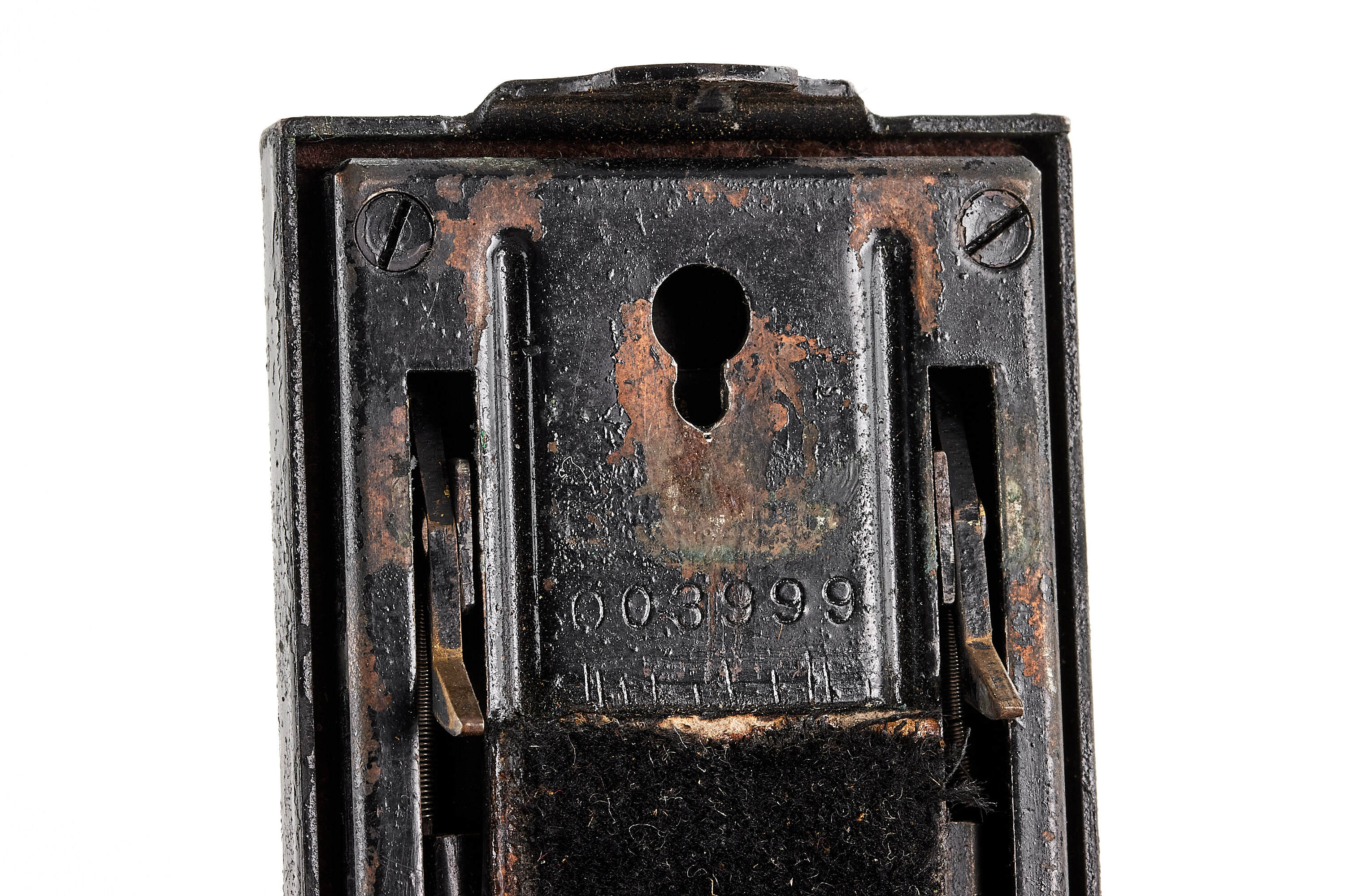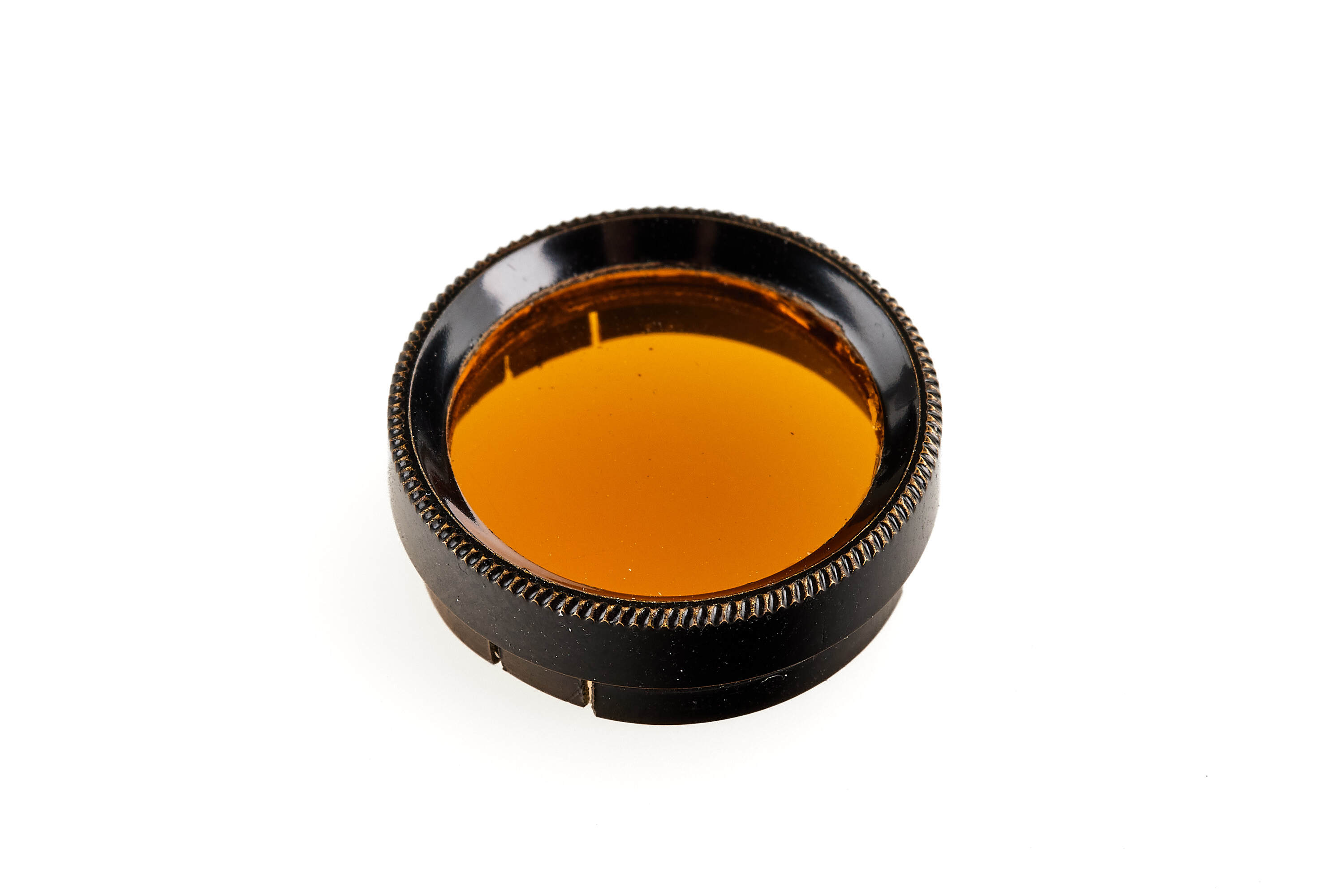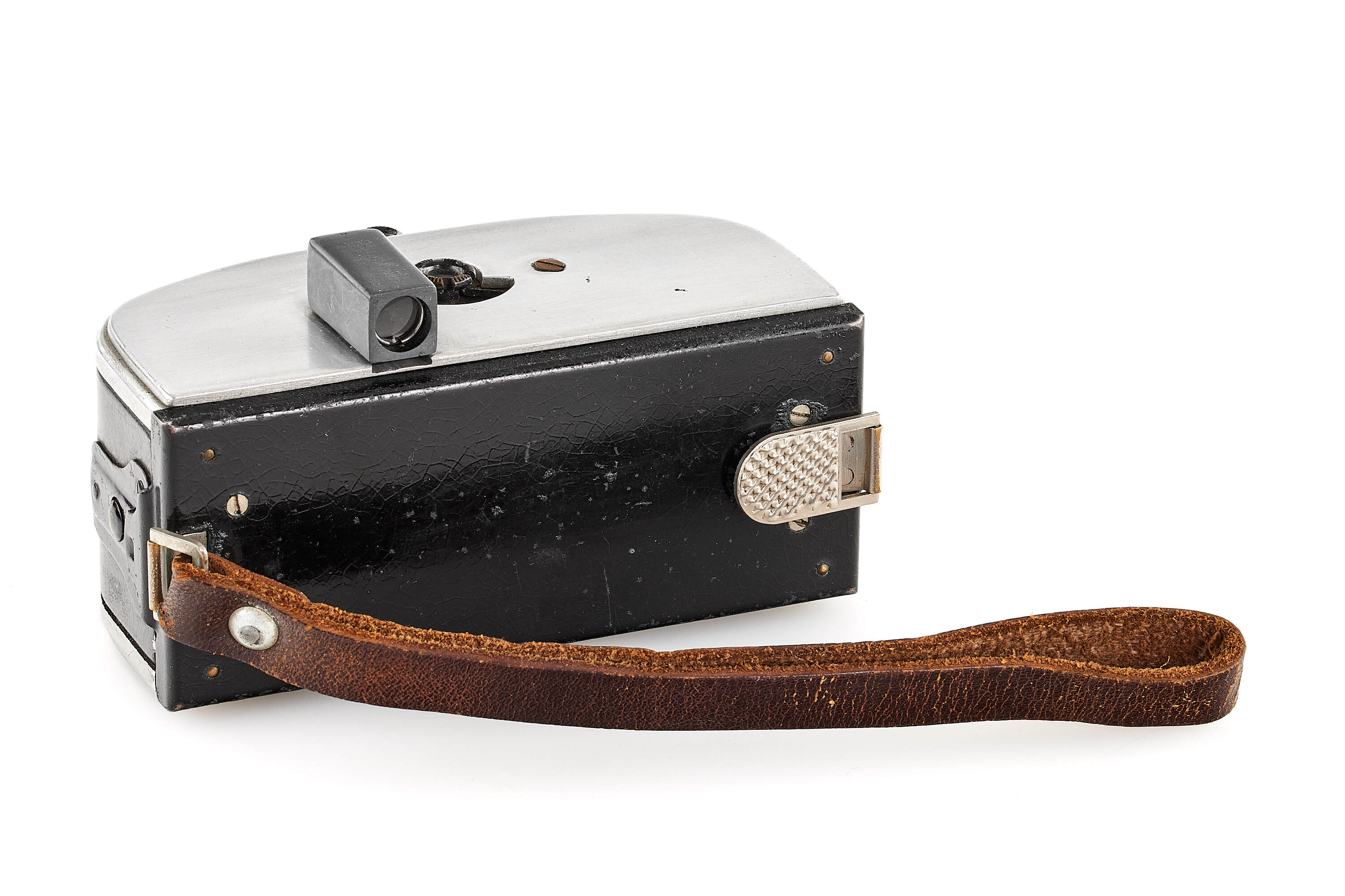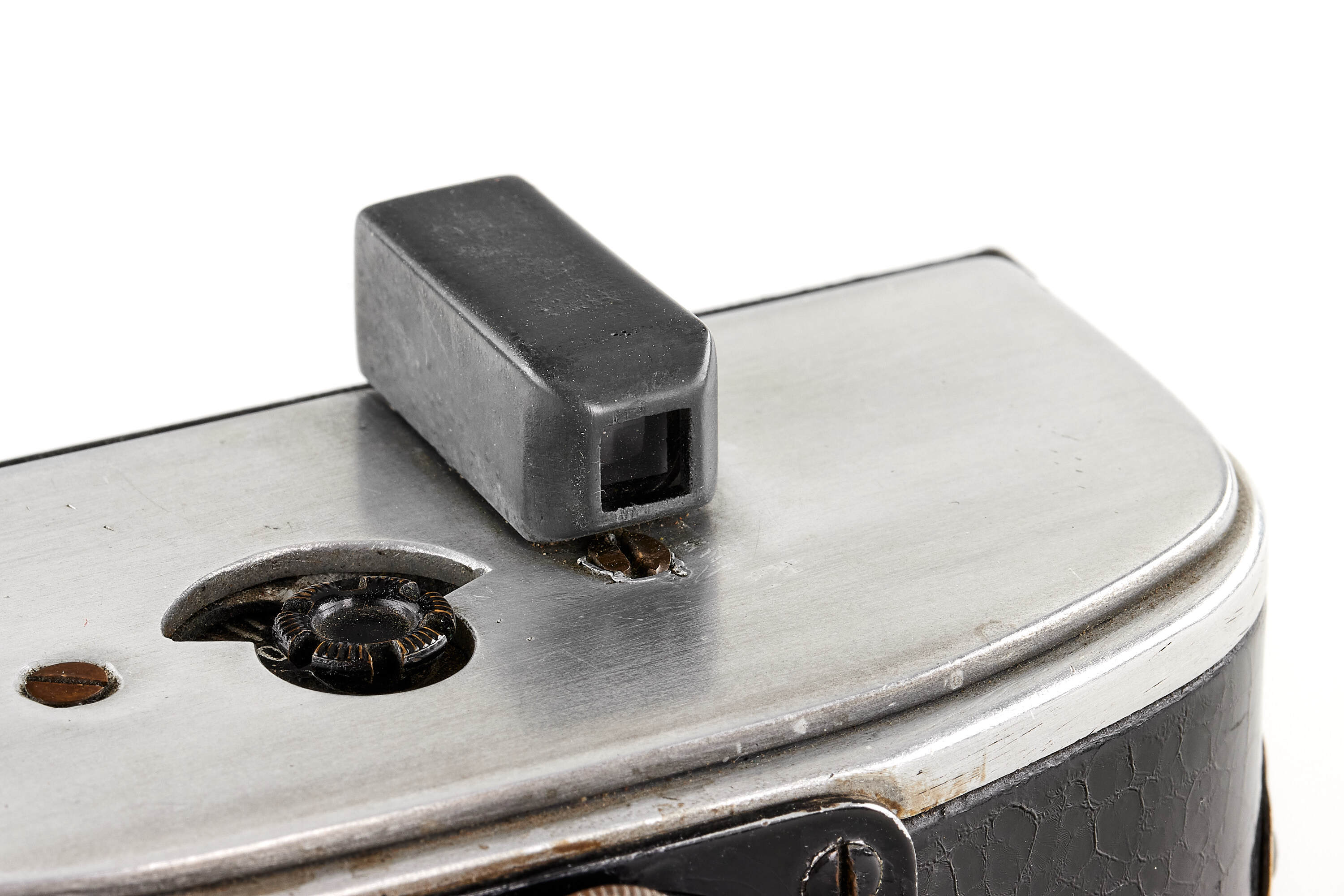 Very interesting and rare experimental OTAG Amourette camera made in Austria, 23x31mm on 35mm film with special ingenious film transport with double cassette, note the tubular finder instead of foldable Galilean type, absence of tripod mount, top and bottom plated without finish, 'Amourette' engraved under the lens, with unusual Meyer Trioplan 6.3/3.8cm no.365569 (usually a 3.5cm!) mounted in early unnamed shutter, fixed leather strap and orange snap on filter.