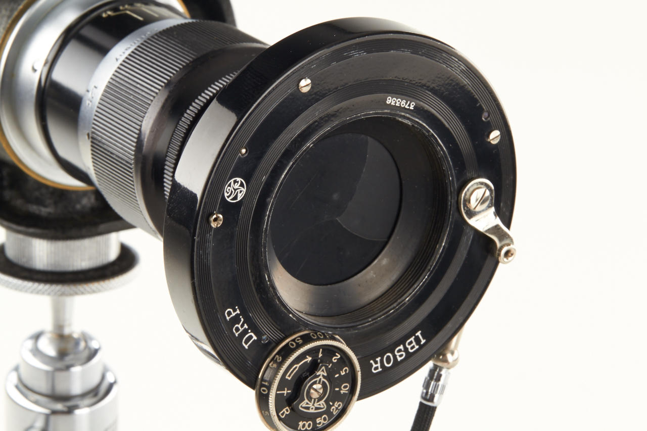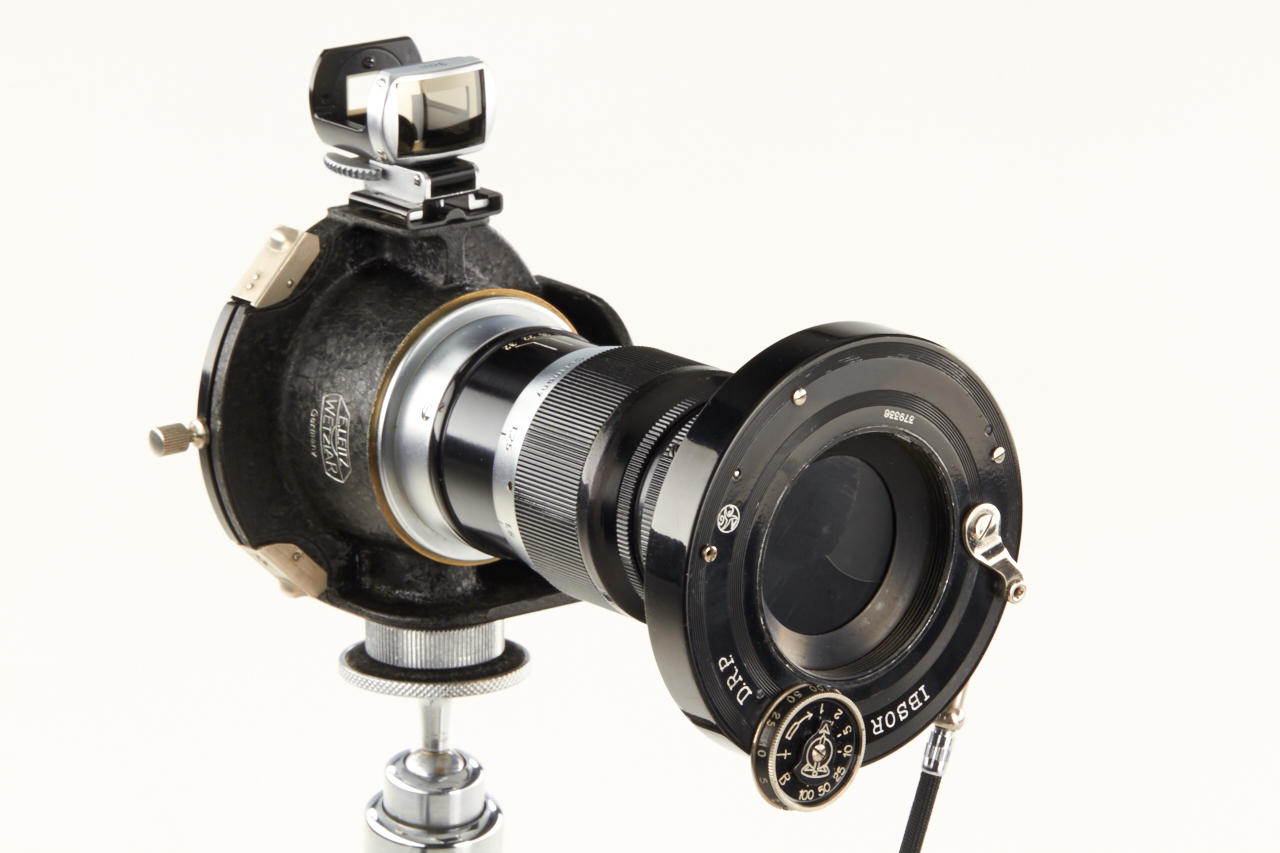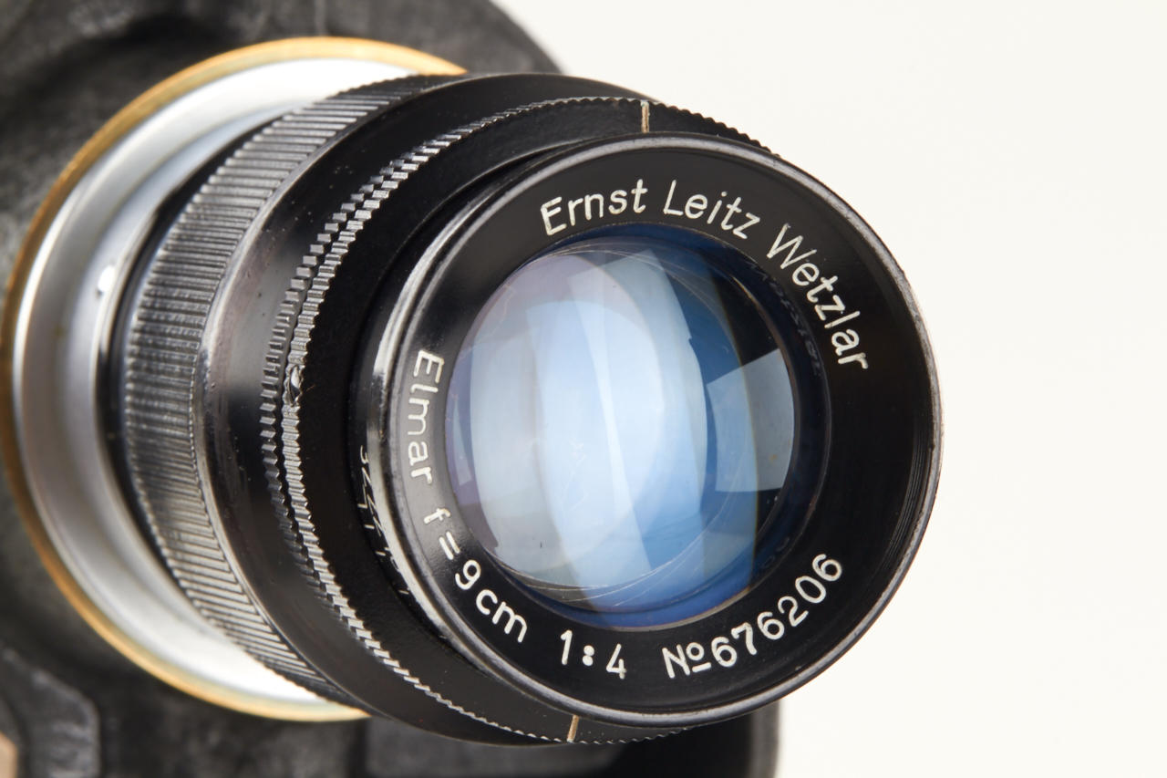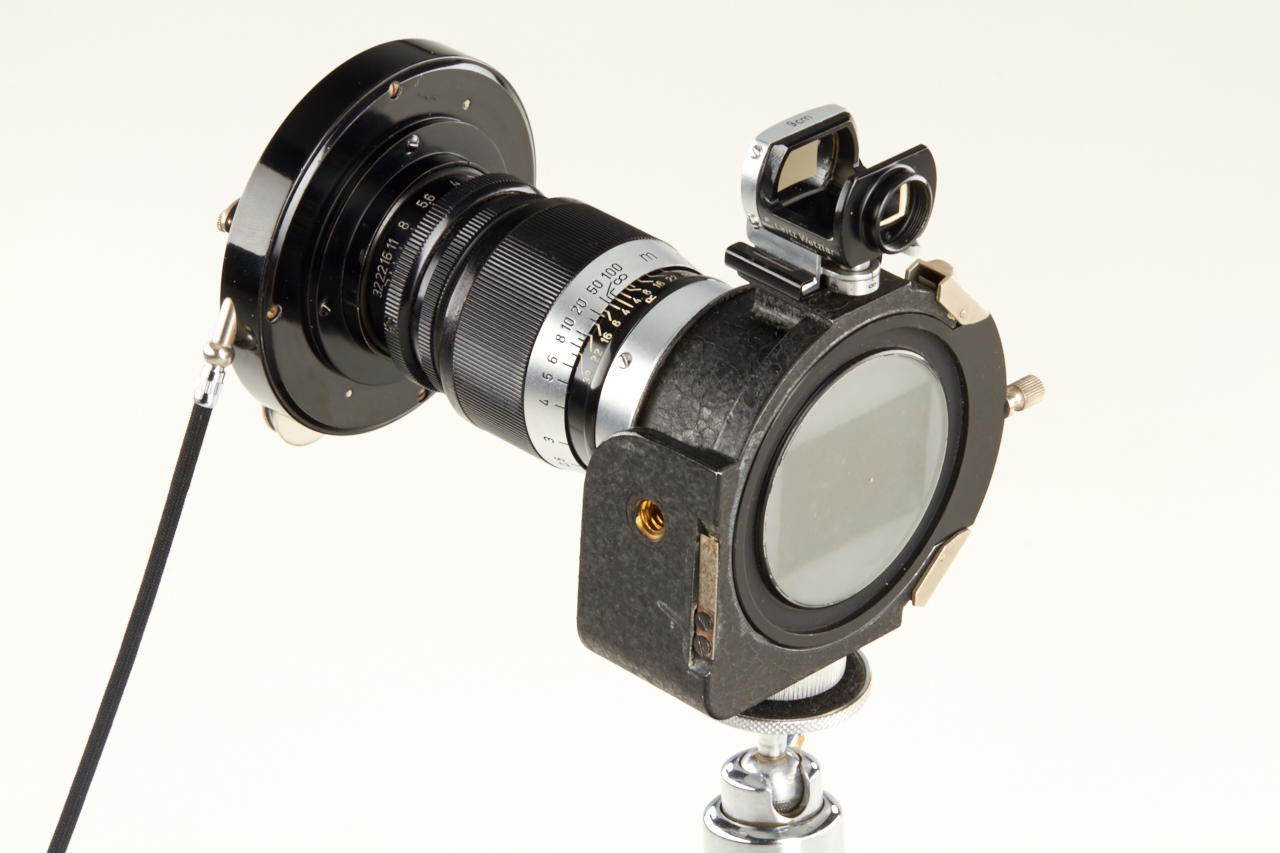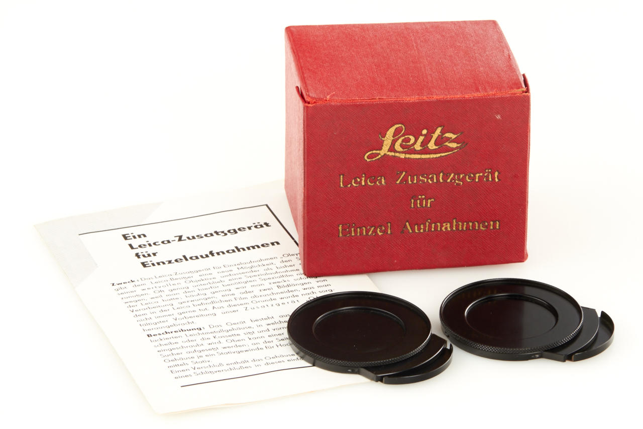 beautiful outfit in mint condition including single exposure camera OLIGO with large Ibsor shutter, ground glass plate, 2 film holder KOOAS, original red maker's box, black/chrome Elmar 4/9cm no.676206, SOOUT 9cm finder, FIAKU ball & socket head, TOOUG table tripod, FINOT cable release, original German instructions leaflet