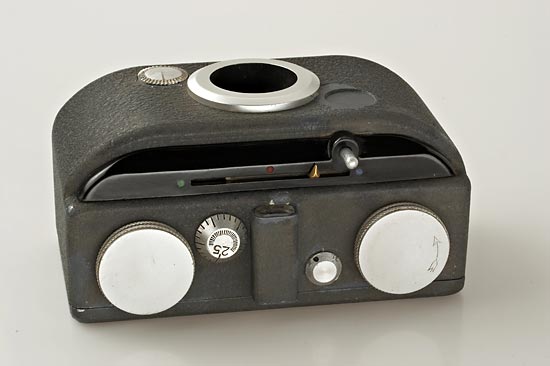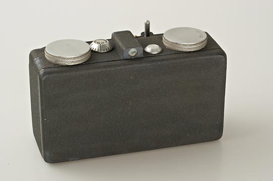 unlabeled prototype (design model) of a three-colour camera for 35mm film, grey painted die-cast body, three 3.5/35mm lenses