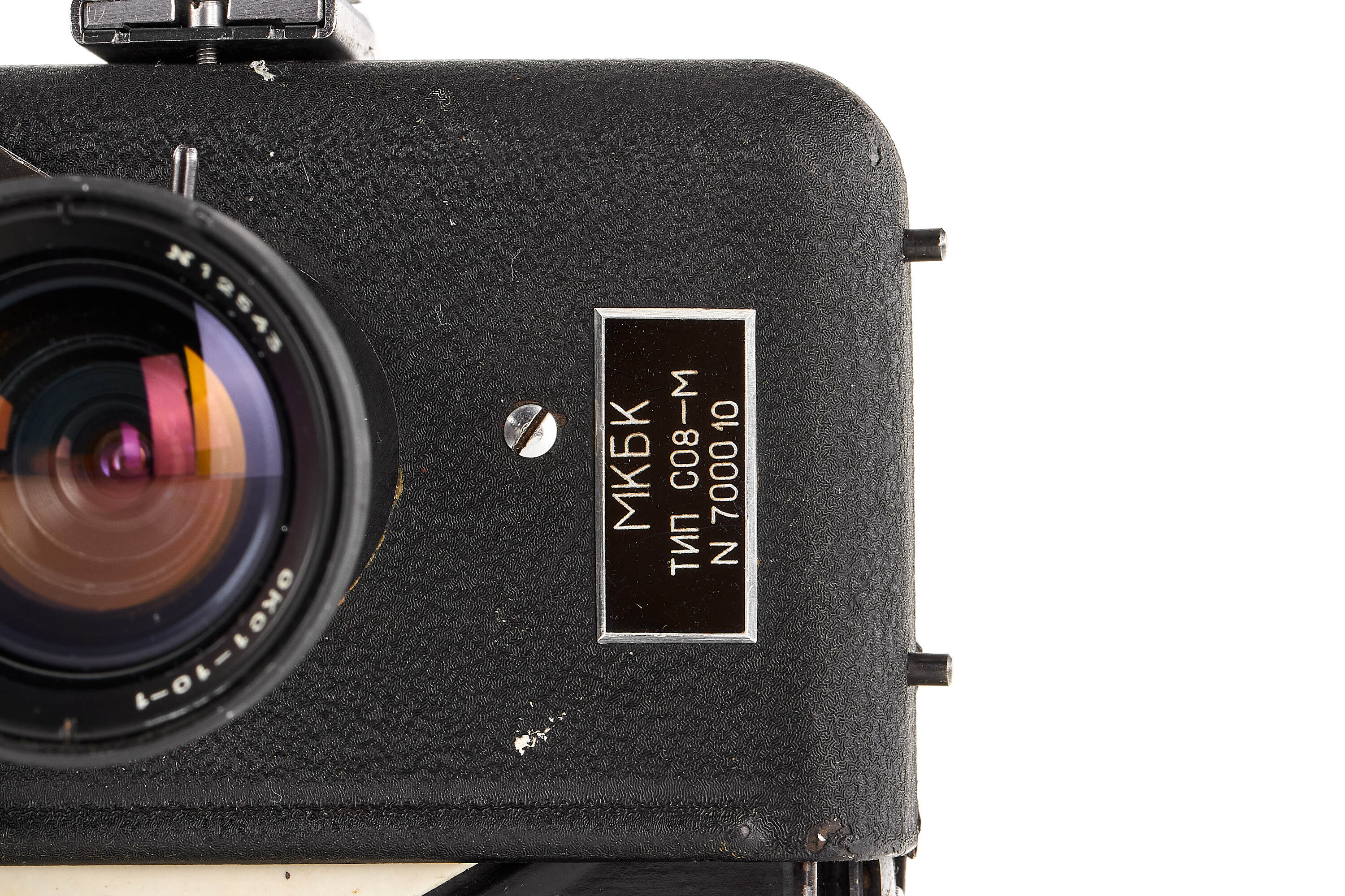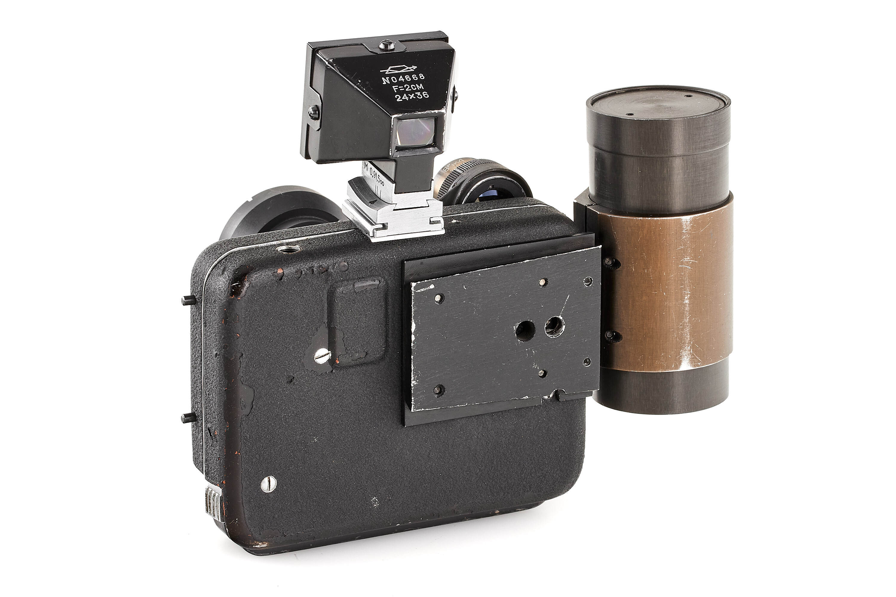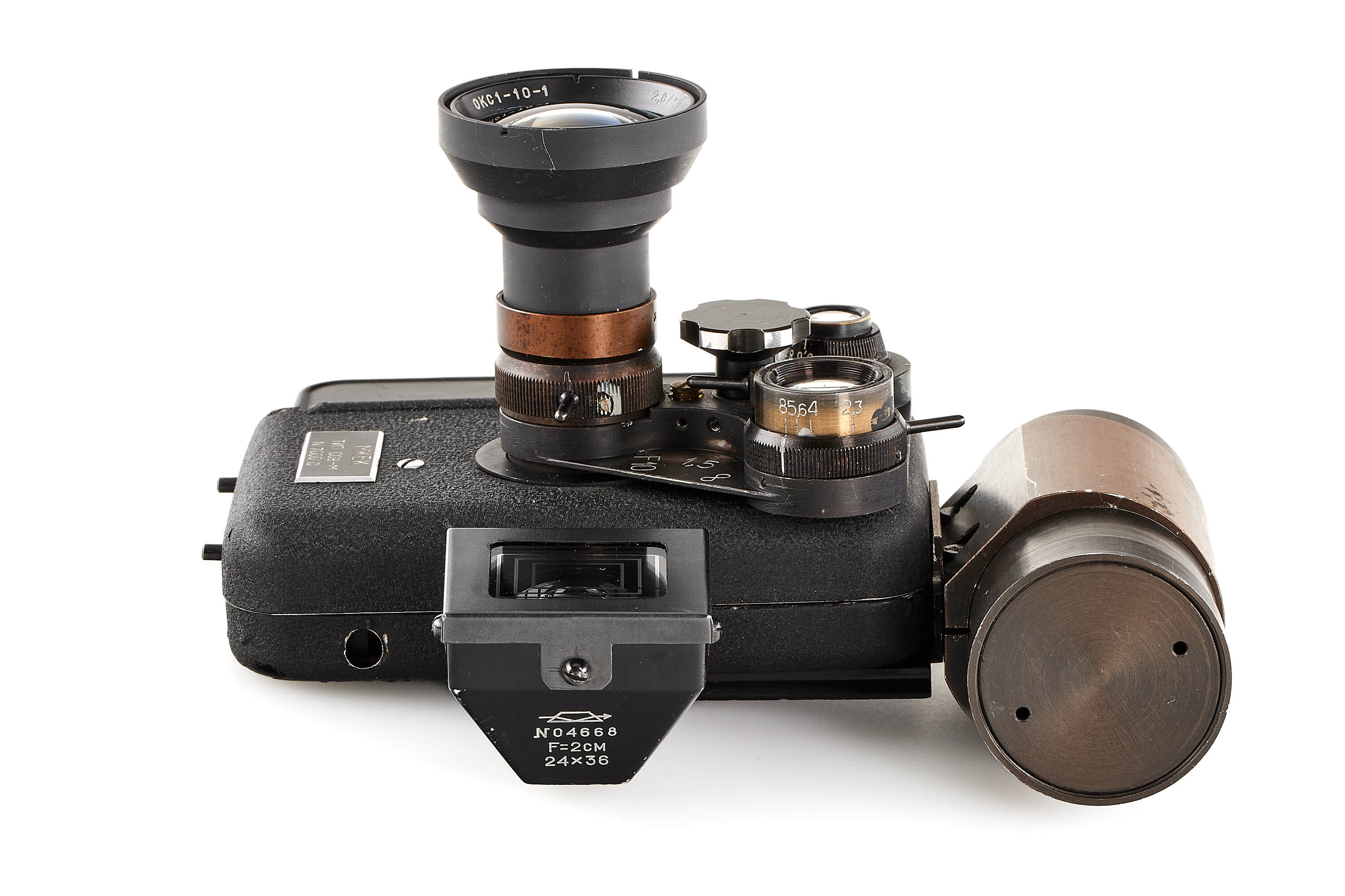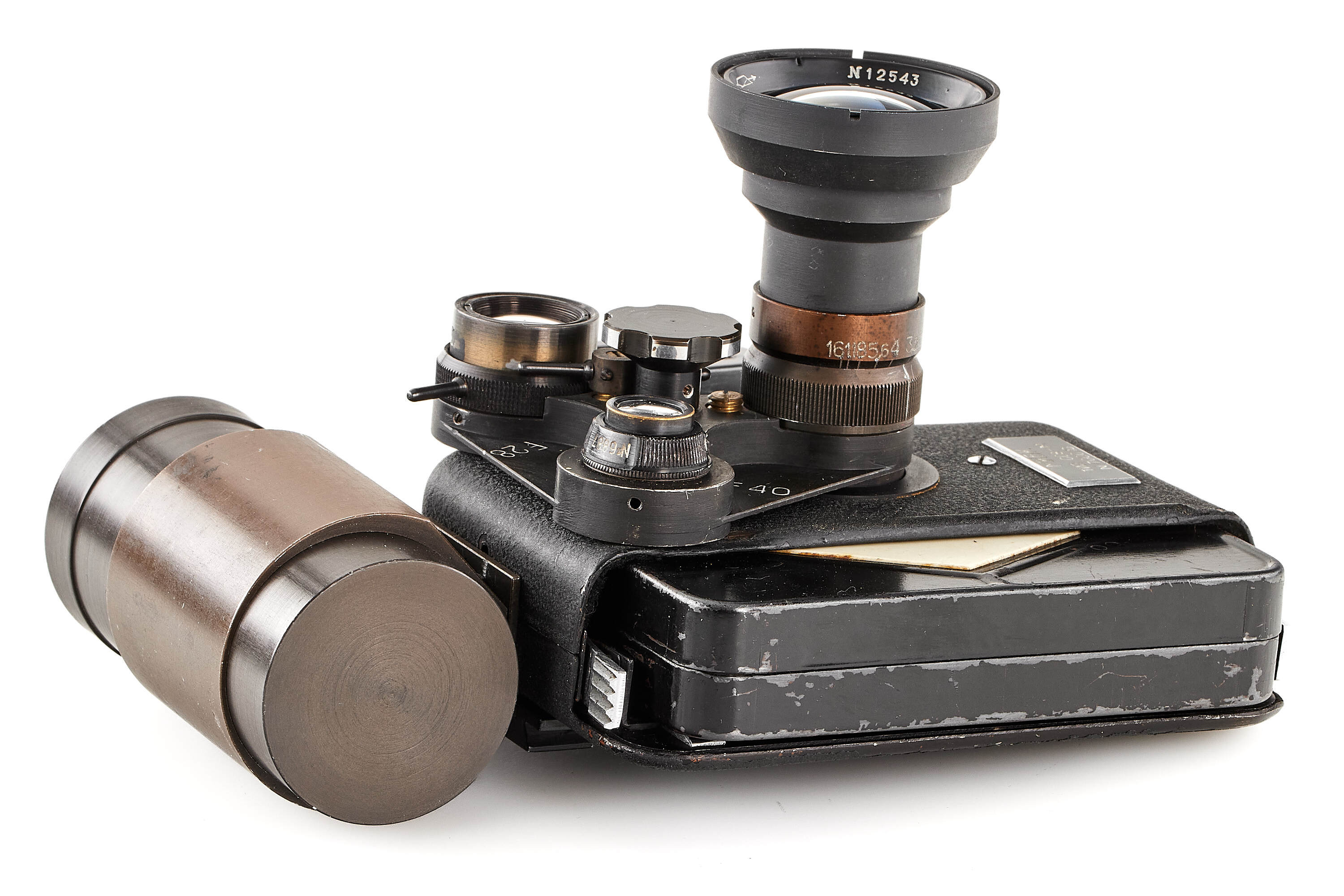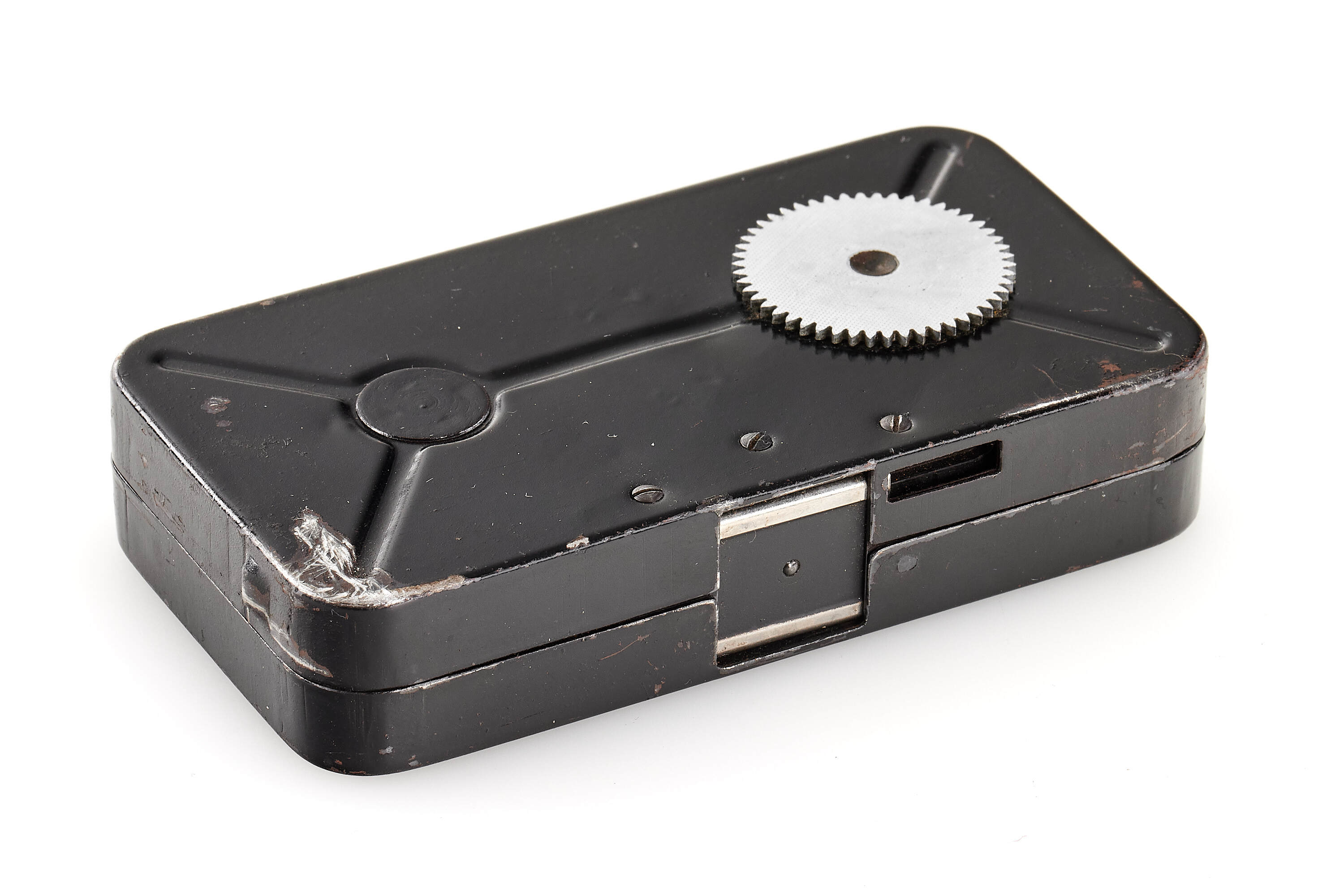 An extremely rare Soviet miniature camera for perforated 16 mm film, made by the Moscow Cinema Equipment Design Bureau (MKBK), fitted with a three-lens turret: KMZ 2.8/10mm no. 12543, 28mm (unmarked), and 40mm no. 6887 (unmarked). Battery-powered (function untested). Uses special cassettes; one cassette included. With a modified KMZ 2 cm optical finder featuring additional frame lines etched in the glass. Likely produced only in very small numbers as an experimental/test model, it stands among the rarest and most sophisticated Soviet spy cameras.