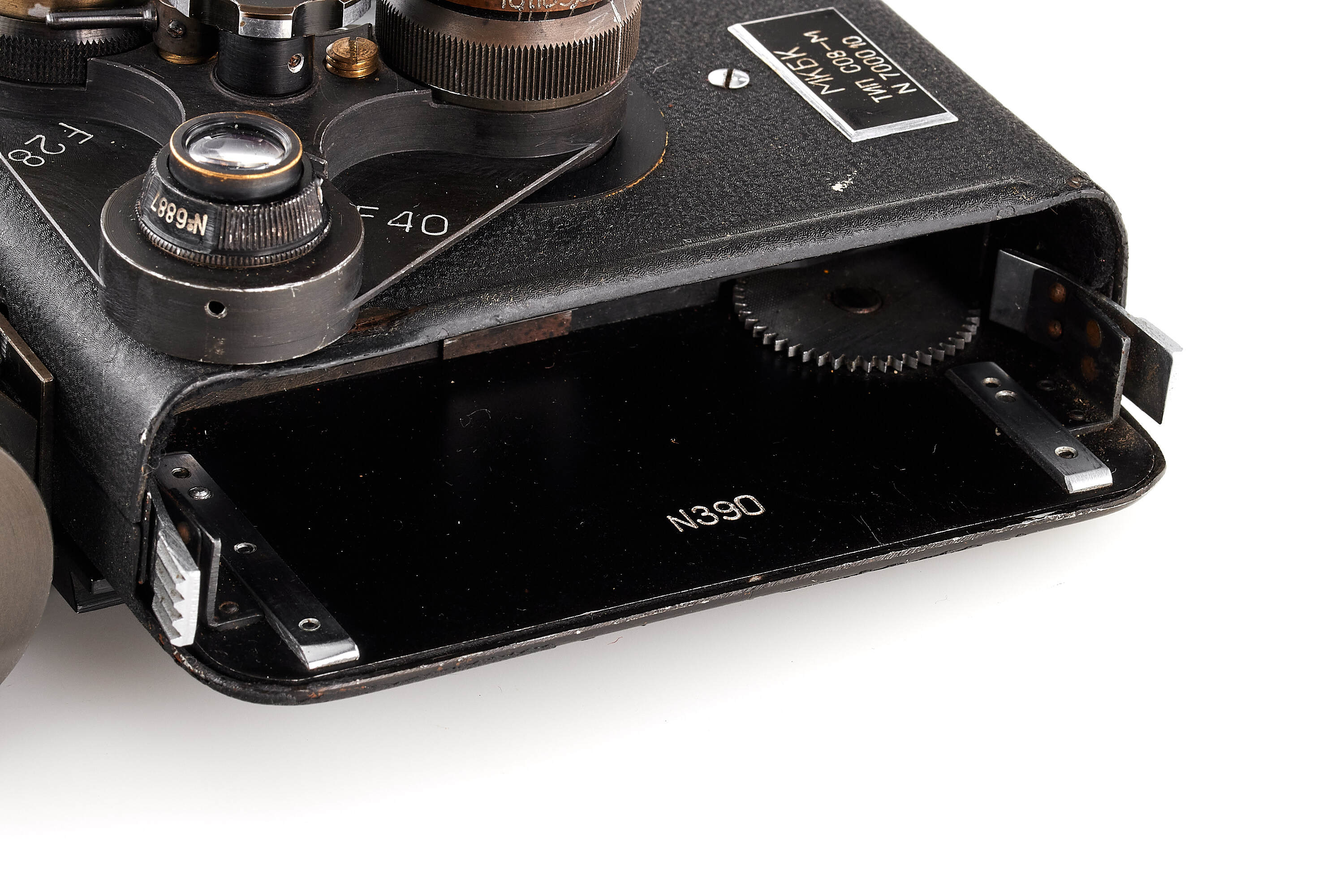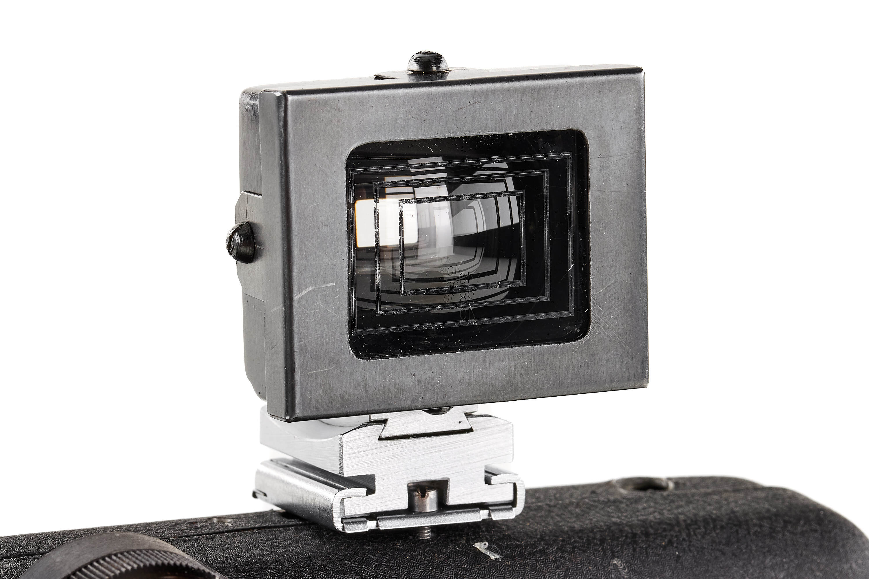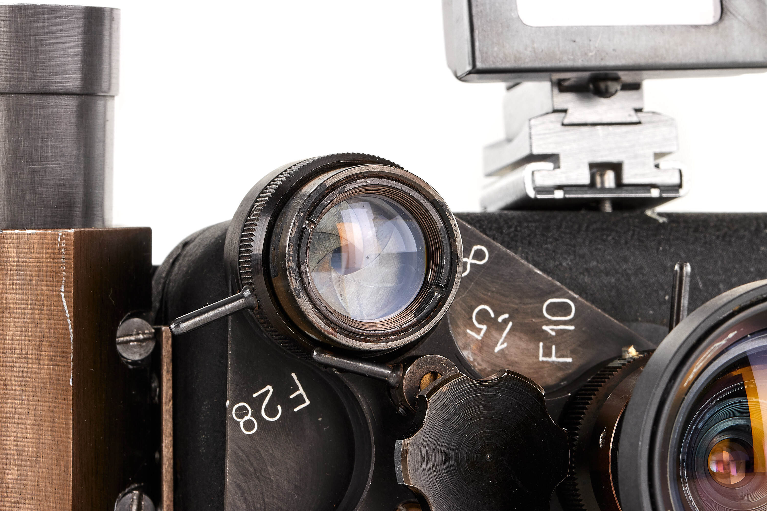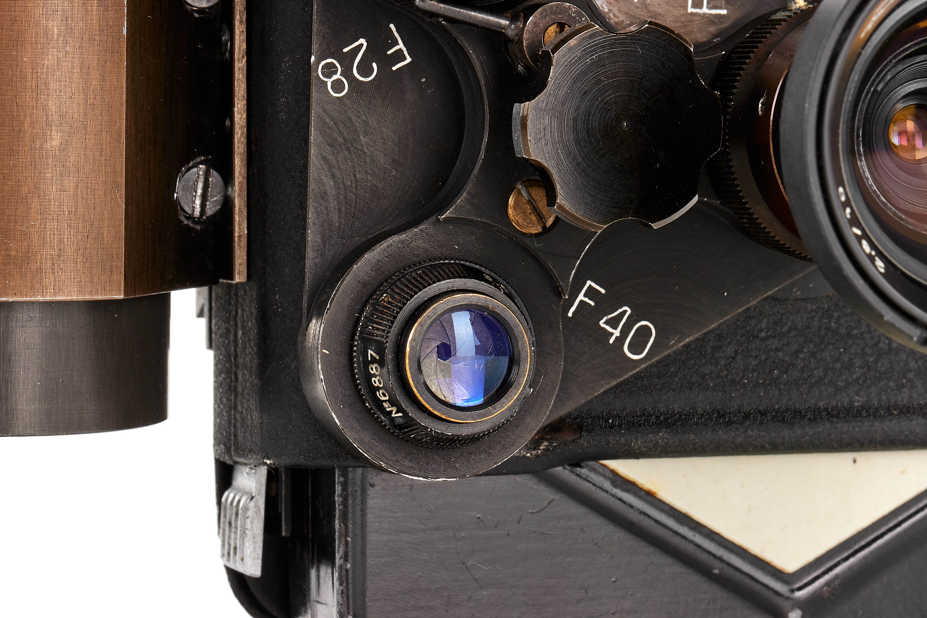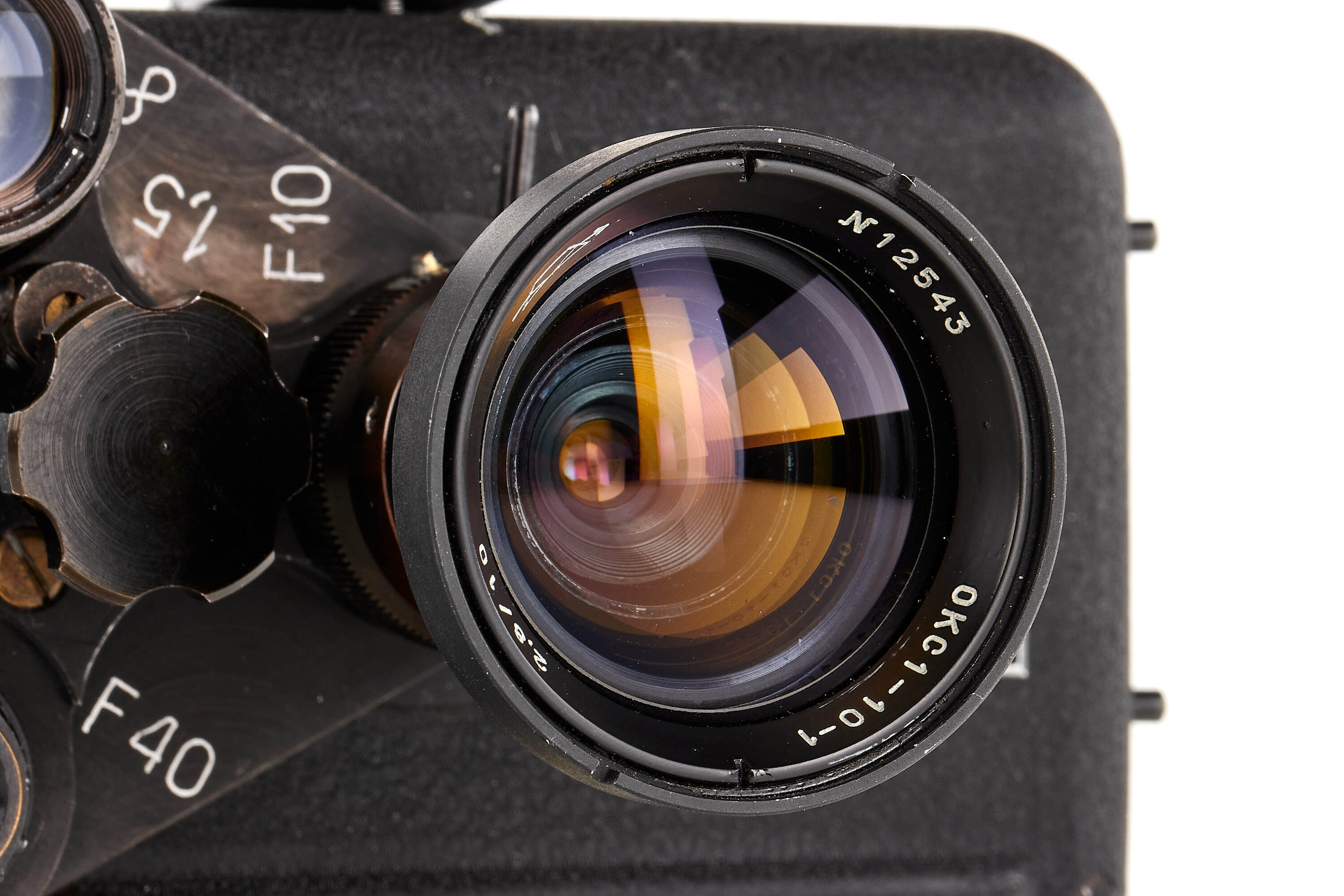 An extremely rare Soviet miniature camera for perforated 16 mm film, made by the Moscow Cinema Equipment Design Bureau (MKBK), fitted with a three-lens turret: KMZ 2.8/10mm no. 12543, 28mm (unmarked), and 40mm no. 6887 (unmarked). Battery-powered (function untested). Uses special cassettes; one cassette included. With a modified KMZ 2 cm optical finder featuring additional frame lines etched in the glass. Likely produced only in very small numbers as an experimental/test model, it stands among the rarest and most sophisticated Soviet spy cameras.