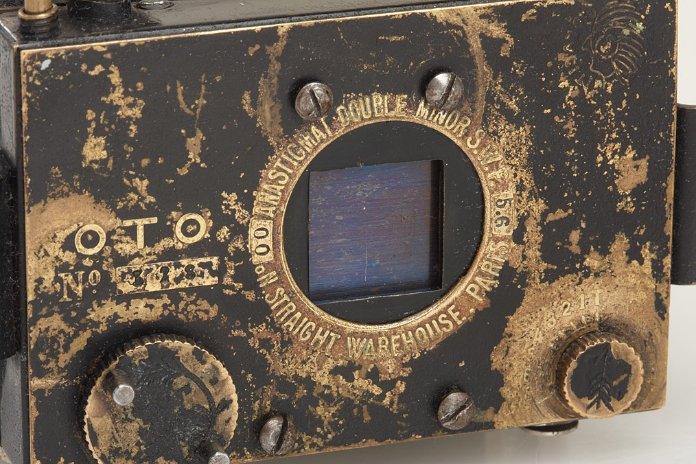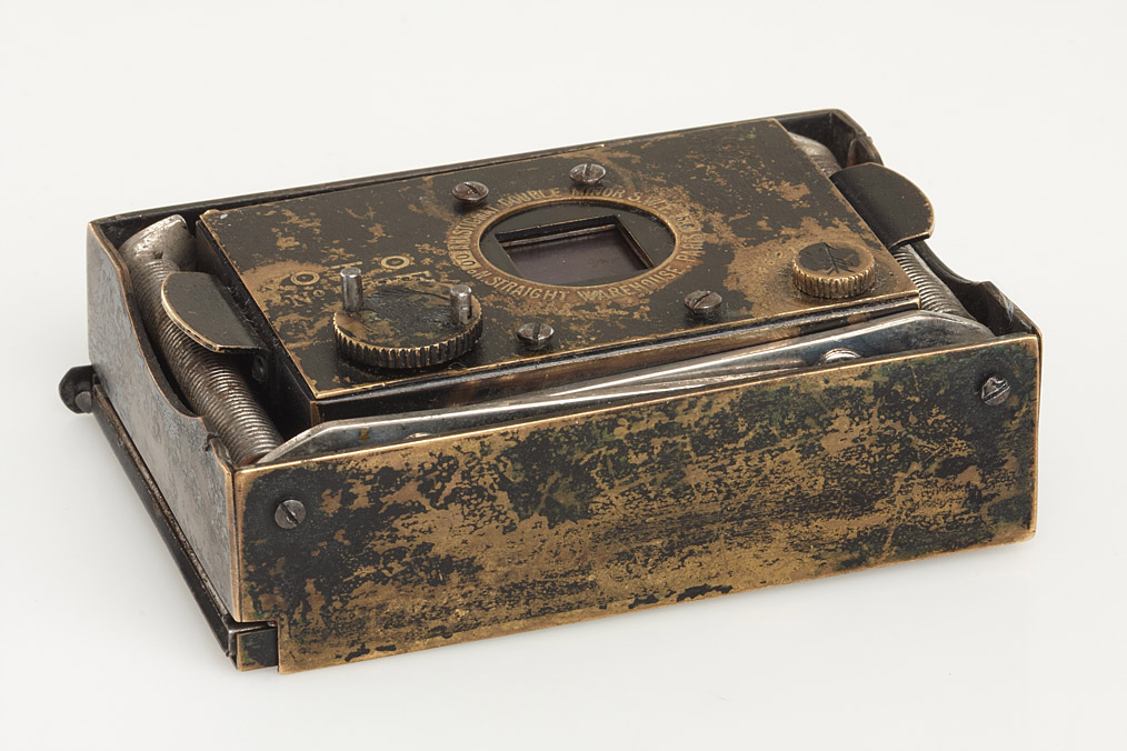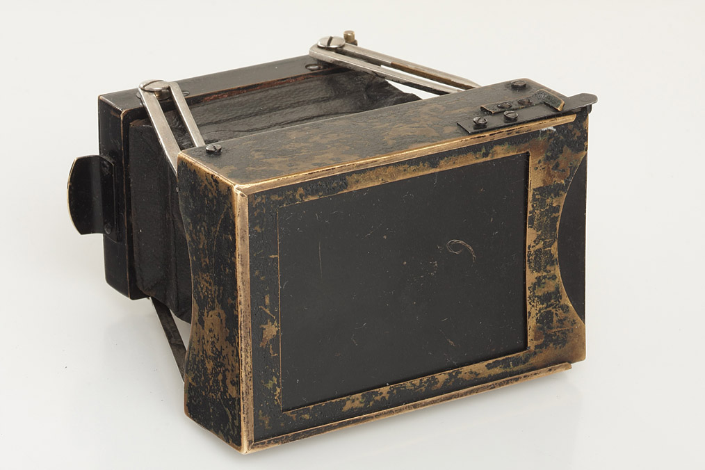 rare, French metal strut-folding camera for 4x5.5cm exposures on plates, leather bellows, Anastigmat Double Minor S.W.F. 5.6 in working metal focal plane shutter