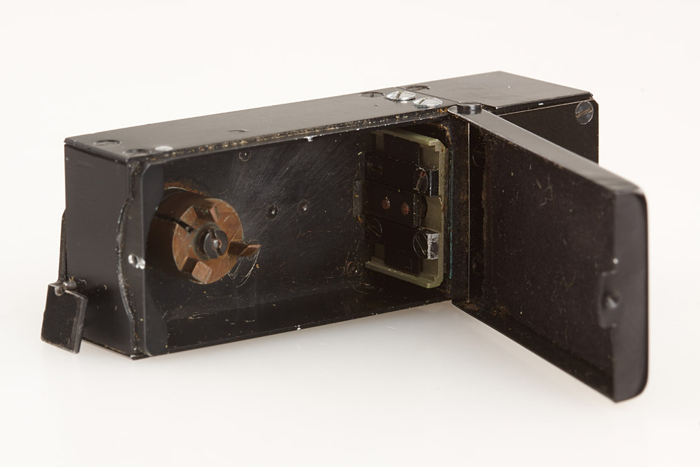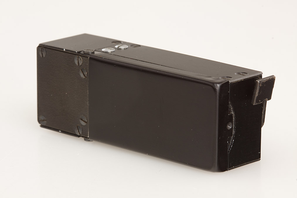 Secret service wide-angle camera for 60 exposures 8x11mm on 9.2mm polyester thin-emulsion film in special cassettes. The lens is a high performance Carl Zeiss Jena Lamegon 3.5/8mm (five elements in five groups, a modified Gaussian design with integrated film plane, equivalent to a 28mm wide angle in 35mm photography). Fixed focus on 25–30cm for document photography. Two blades lamellar shutter with a tiny dot on the first curtain (indicating a transported film and tensioned shutter). The camera is operated by a single-throw rapid wind lever that also trips the shutter. Automatic frame counter, dimensions 58 x 22 x 16mm. Also included is one of the ultra-rare special cassettes in original keeper. The Venus Z camera was made by the OTS (the workshop for design and manufacture of spy devices of the East German secret service) for the HVA (the East German foreign secret service) and was used by the prominent East German spy Rainer Rupp (code name “Topaz”)