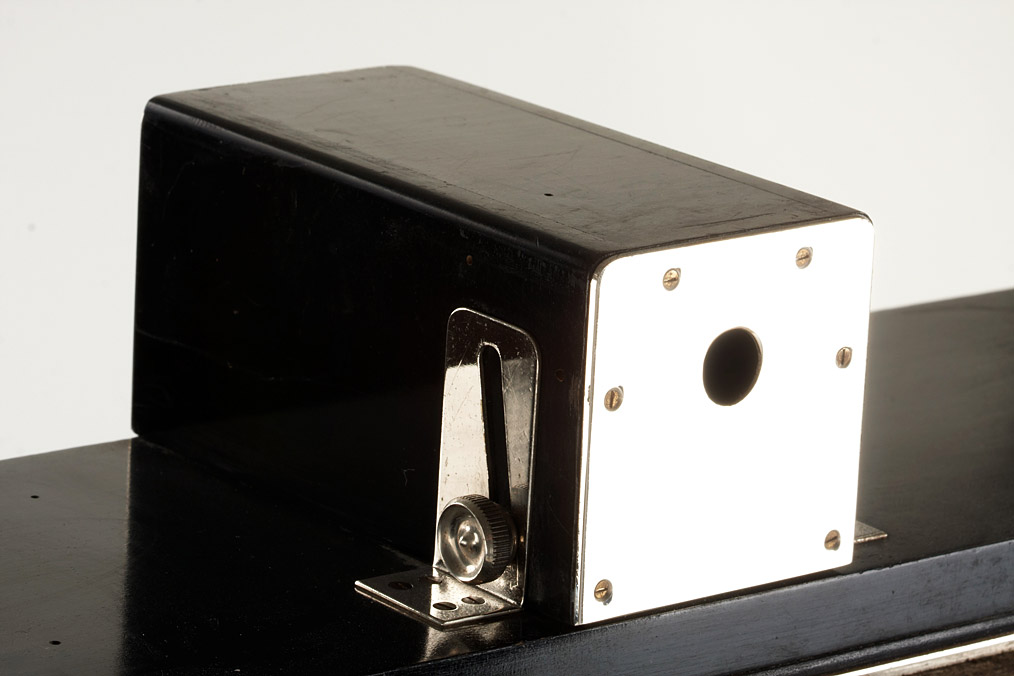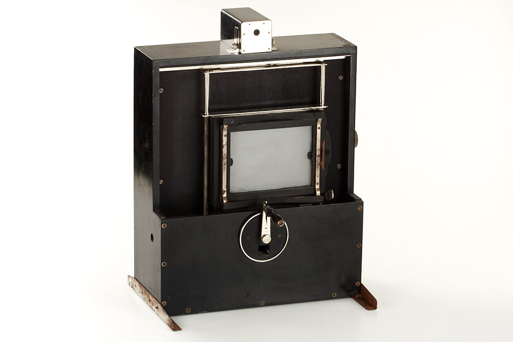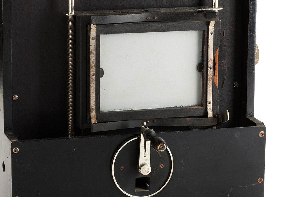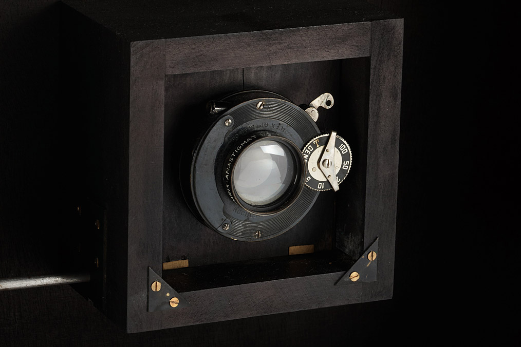 French half-automatic Carte de Visite camera for 12 exposures 35x35mm on one 13x18cm glass negative, black enamel finish, Hermagis Anastigmat 4.5/125mm no.57024 in shutter. The ingenious, crank-activated mechanism moves the plate for the next exposure and releases the shutter. A scarce, almost unknown camera in original condition.
