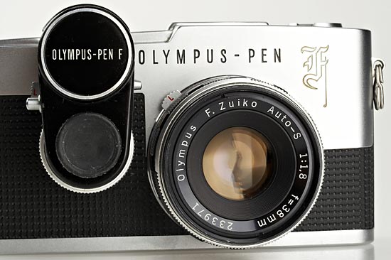 18x24mm half-frame, in good condition with F.Zuiko Auto-S 1.8/38mm no.233971, cap, Zuiko Auto-Zoom 3.5/50-90mm no.105475, cap, filter, case, Pen F light meter in case