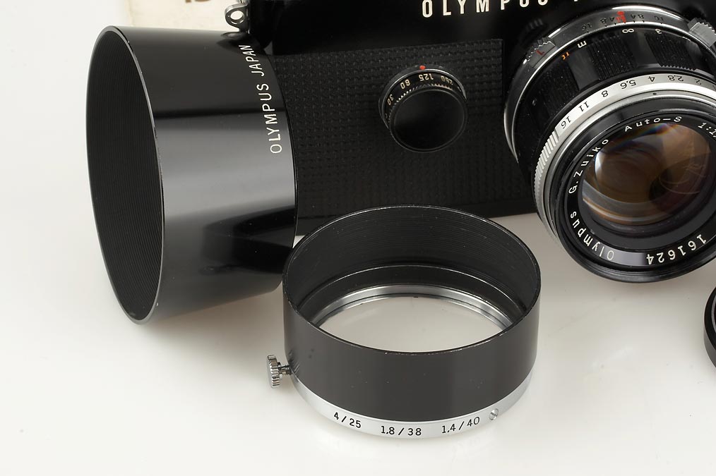 18x24mm on 35mm film, black camera in perfect working condition with matching G.Zuiko 1.4/40mm no.161624 (hood, cap), Zuiko Auto-Zoom 3.5/50-90 no.135686 (hood, caps), accessory shoe, instructions, Olympus OM mount adapter in maker's box