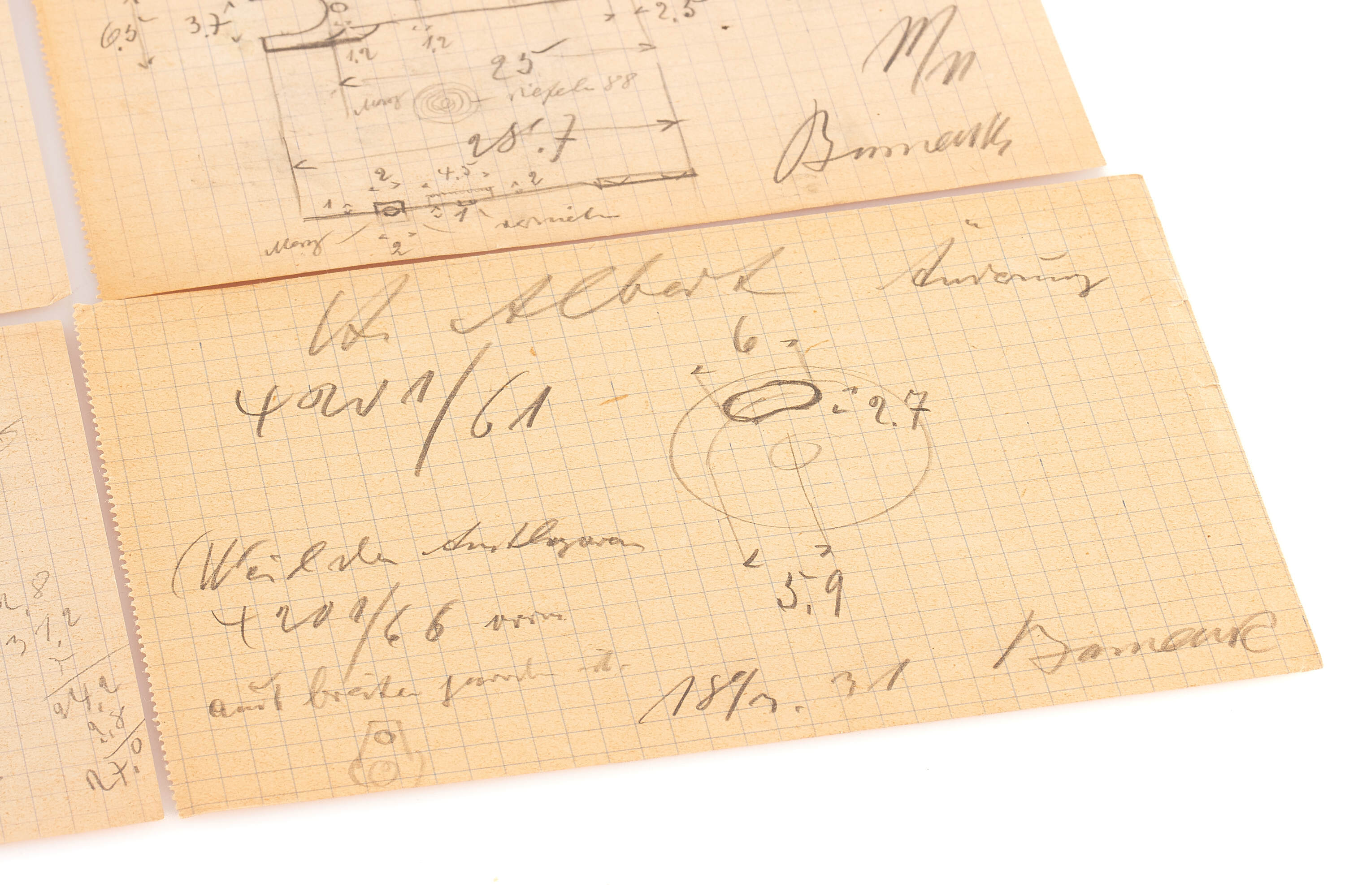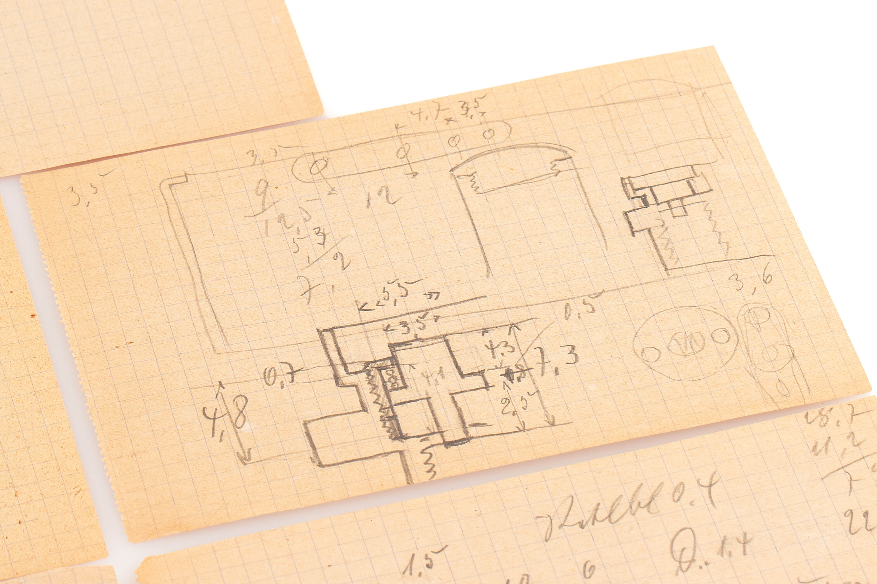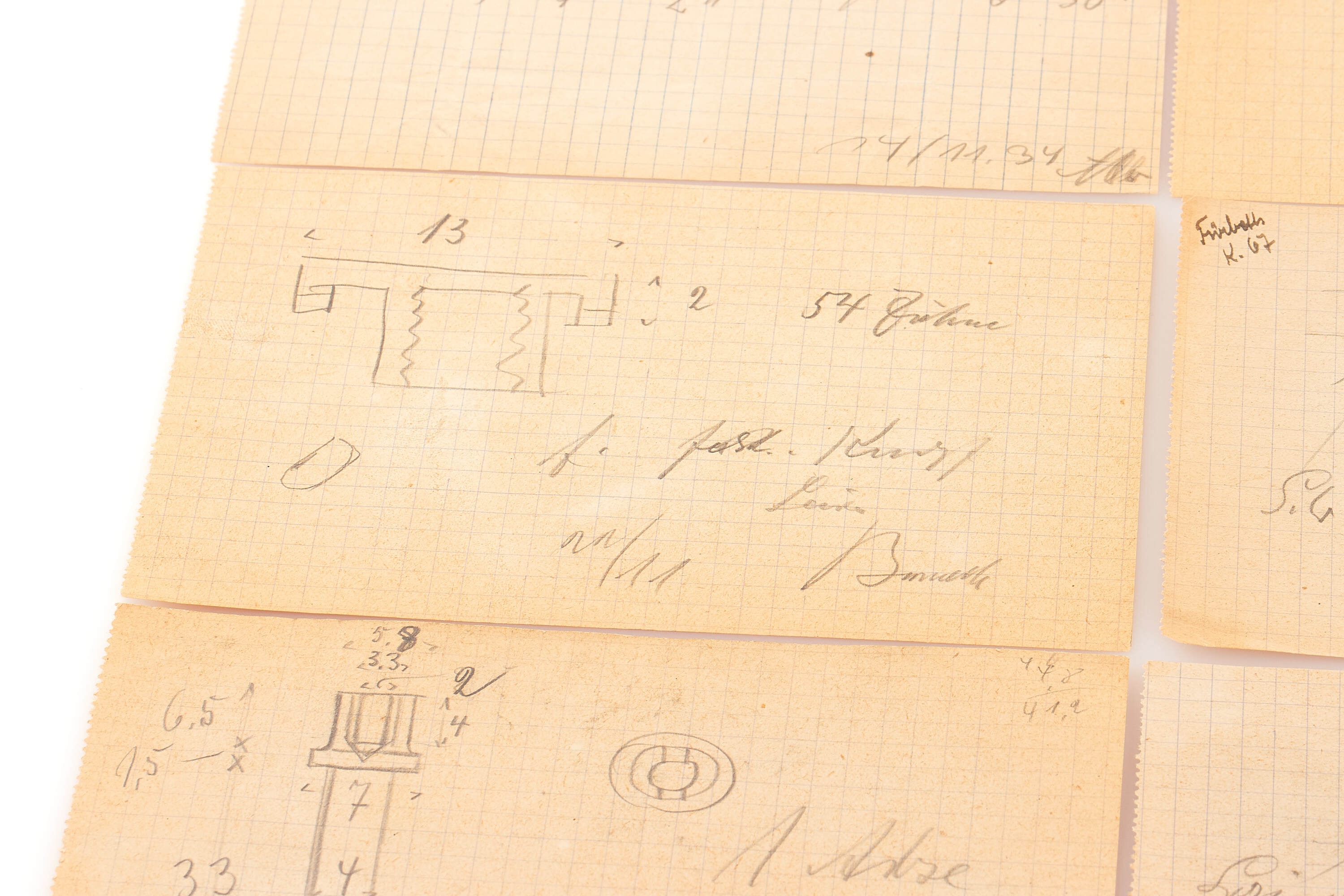 An exceptional collection of 11 original pencil drawings and notes by Oskar Barnack and Wilhelm Albert, depicting various parts for Leica cameras and accessories, including the shutter shaft and shutter release spring, etc.. Each sheet measures approximately 10×14 cm and is preserved in excellent condition. A fascinating and historically significant piece of Leica history.