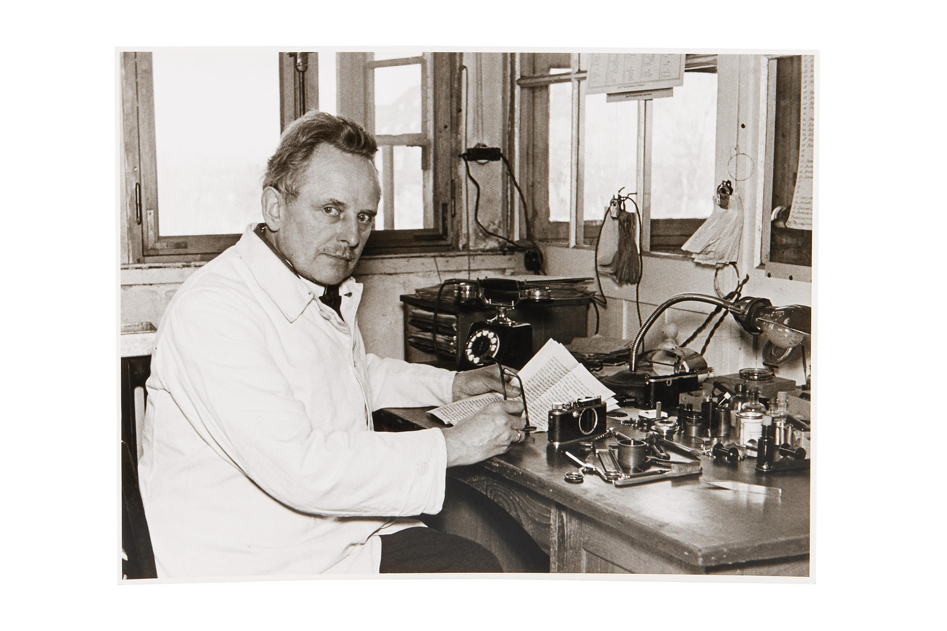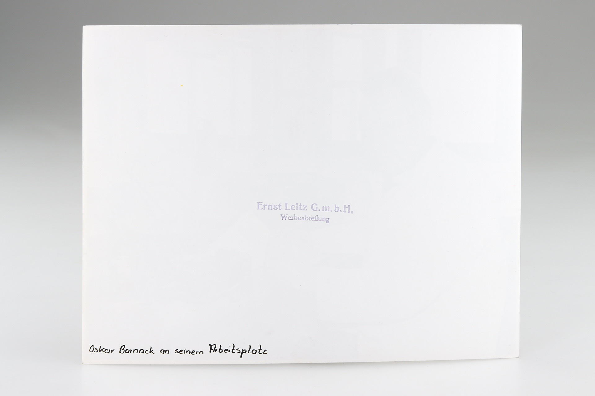 an original vintage print showing Oskar Barnack at his workplace in Leitz factory, stamp from Leitz advertising department on the back, 23x18cm, in excellent condition