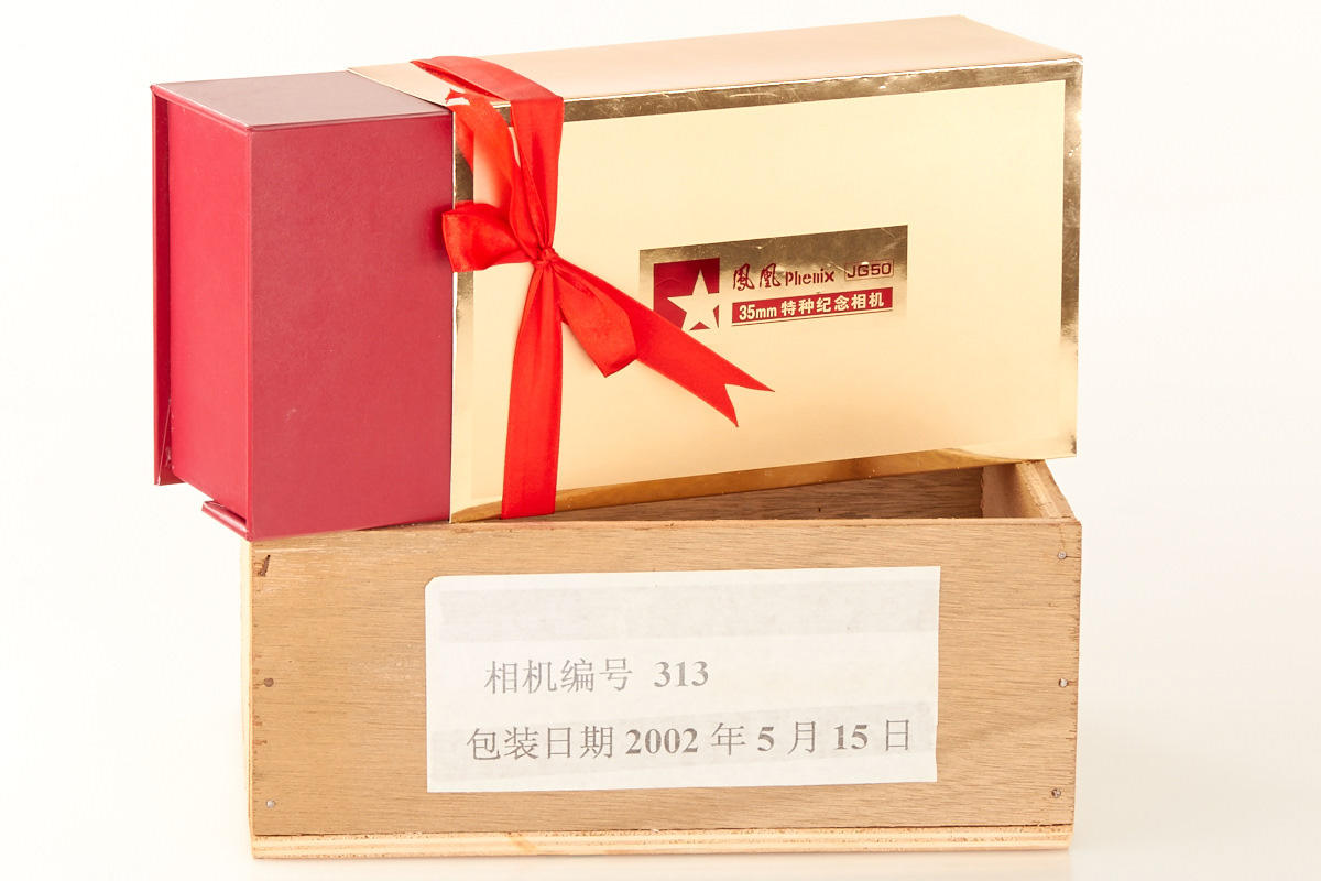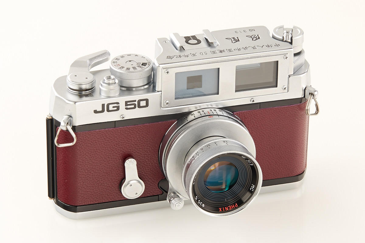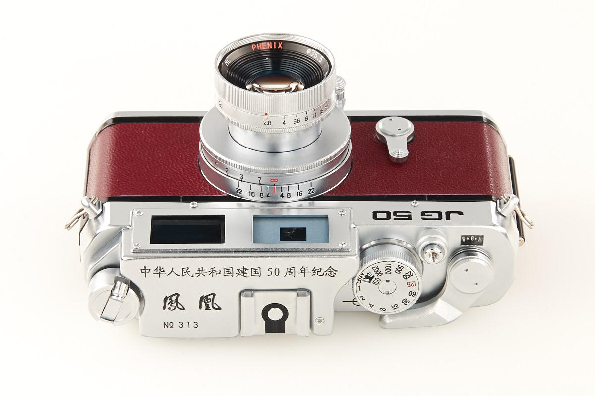 produced by Phenix Camera Company, China - compact 24x36mm rangefinder with interchangeable lenses. With PHENIX 2.8/50mm lens. Brand new with all accessories in wooden box. The JG 50 commemorates the 50th Anniversary of the People's Republic of China 1949-1999. Only 500 JG 50 were produced. It is a special version of the famous Yasuhara T981-- the camera which started the new rangefinder renaissance in 1999. This is one of the rarest Leica copies. The finder with a 50mm bright line and a 1:1 viewing size. The shutter is the standard Copal shutter. The original Yasuhara T981 was discontinued in 2001 after about 4,000 were produced.