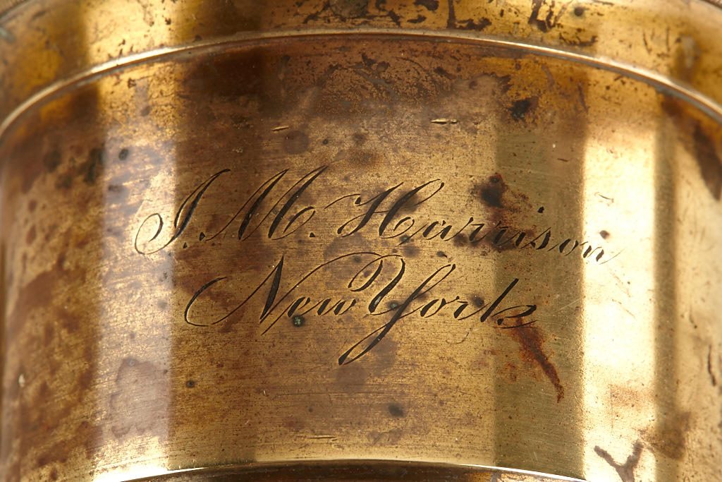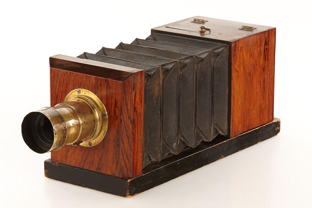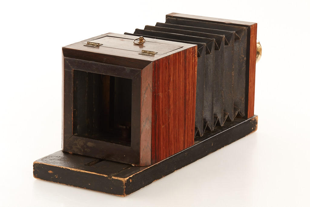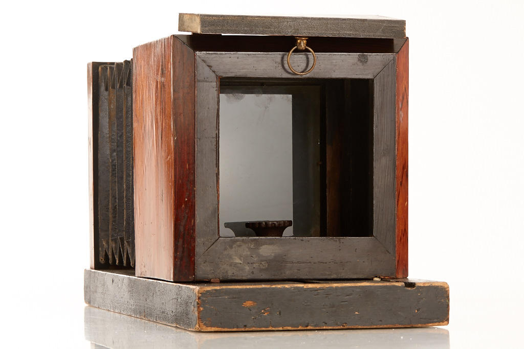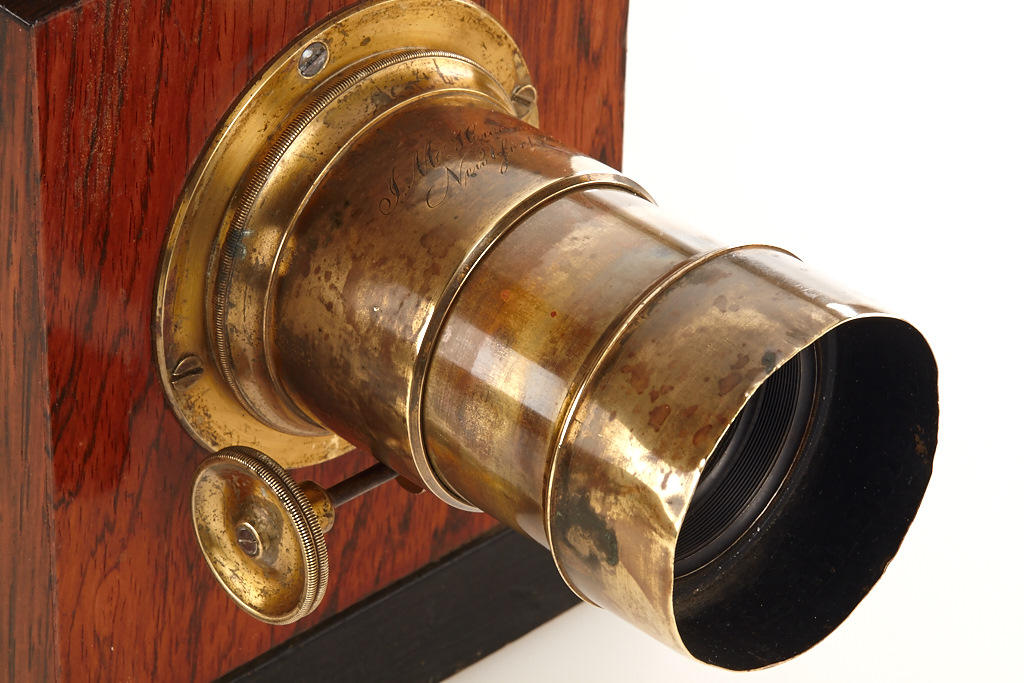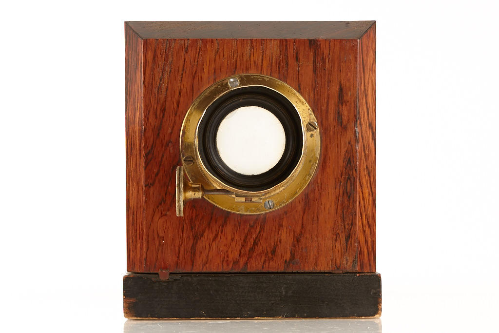 Quarter-plate Lewis-type camera with chamfered front and back and bellows focusing. Within a few years of the original Daguerreotype cameras, the first uniquely American style evolved with chamfered front and back. The exterior of the camera retains its simple, elegant form covered in rosewood veneer. One hinged door on the top allows access to the focusing box, which has slots for a plate holder and a viewing screen. The viewing screen is present with this camera. The lens is an un-numbered J.M.Harrison Petzval type lens with tangential rack and pinion focusing drive (usually associated with European lenses), a correct lens for this camera. The firm of W. & W. H. Lewis, in New Windsor, N.Y., was the first to incorporate the bellows into an American camera. Also included is the very rare and interesting original tripod. A cast-iron yoke connects the three legs to an adjustable centre post. At the top of the centre post is a sloping shelf, hinged at the front, and adjusted with an original wooden screw to tilt the camera. Adjustments right or left are made by pivoting the camera on the shelf, which is slightly wider than the camera for this purpose. American factory-made daguerreotype cameras, such as the chamfered box or the later Lewis bellows box designs, are highly desirable and rarely come to market, especially with their original tripod. The camera, marked 'PALMER & LONGKING MANUFACTURERS OF DAGUERREOTYPE APPARATUS NEWBURG & NEW YORK', is in very fine condition.