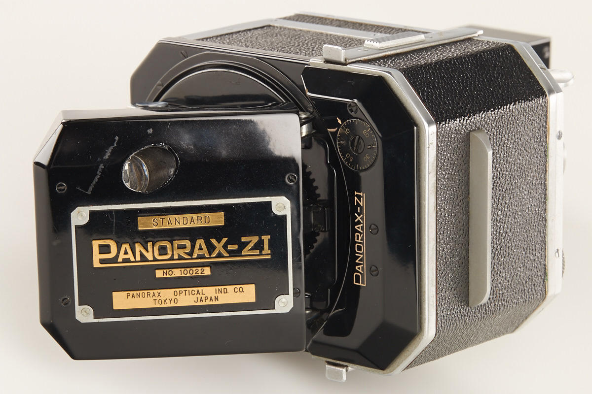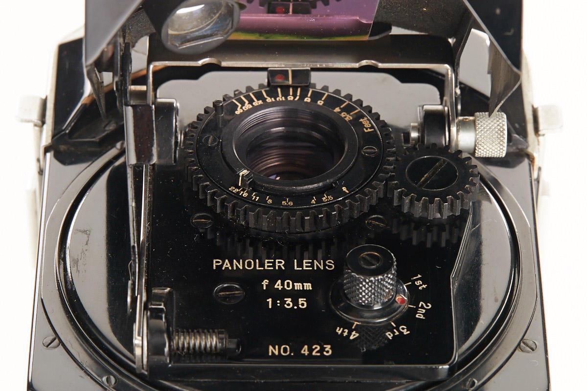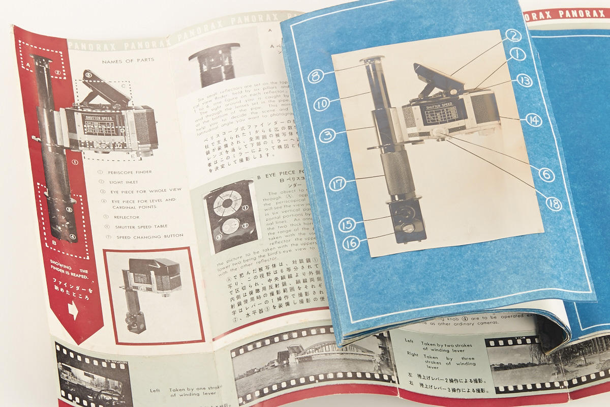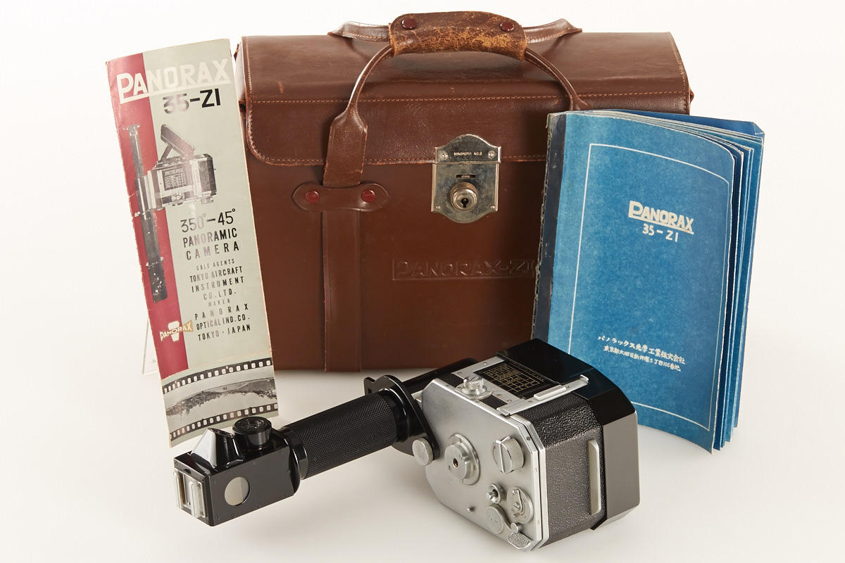 Japanese panoramic camera for 45° - 360° exposures (24x245mm) on 35mm film, Panoler lens 3.5/40mm no.423, extremely rare, complete with standard viewer, lower viewer and upper viewer, 3 filters, periscope finder, instruction book, brochures, original fitted maker's leather case - all in perfect condition