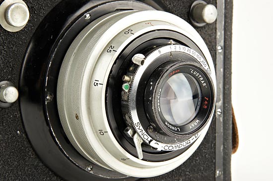 Wray Optical Works, 4 x 5", with Wray London Lustrar 4.8/135mm lens, no.224118, in Synchro-Compur-P shutter and focal-plane shutter speeds 1/15 to 1/800 sec. Similar in principle to the Periflex, when a button at the front of the camera is pressed a mirror drops down so that a central portion of the image can be seen through the lens in an eye-level viewfinder at the top of the camera. Ex Spira Collection.