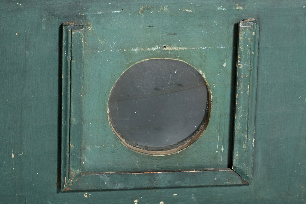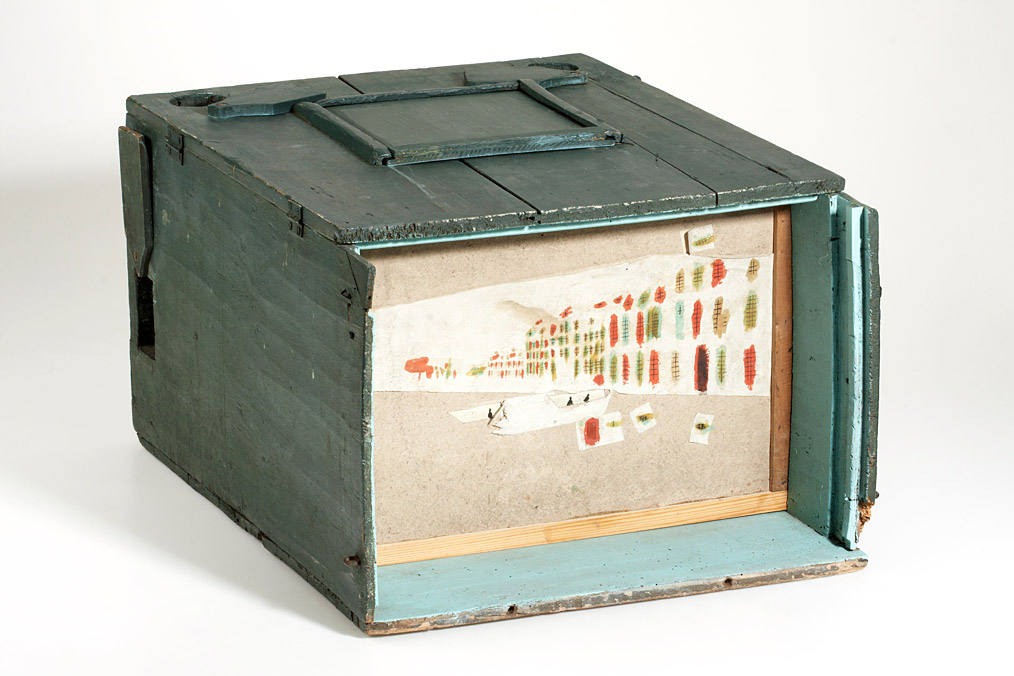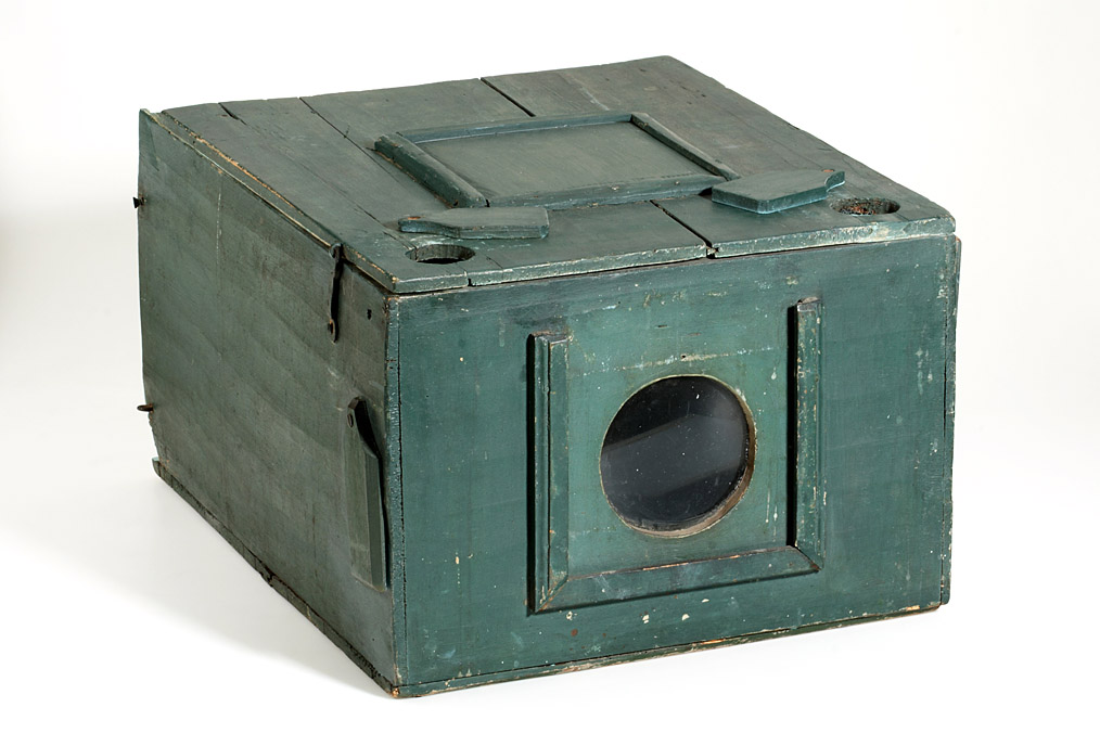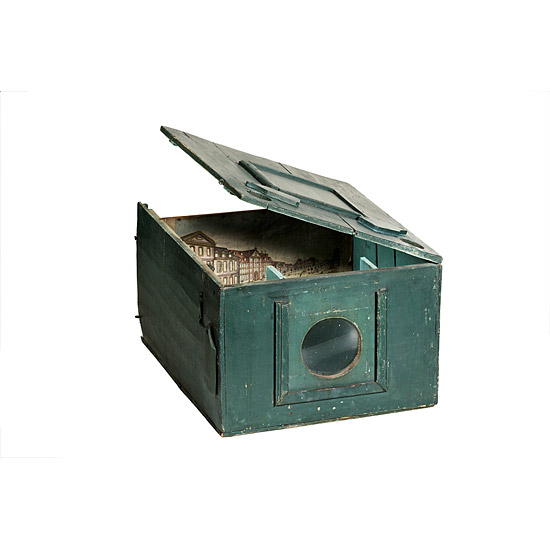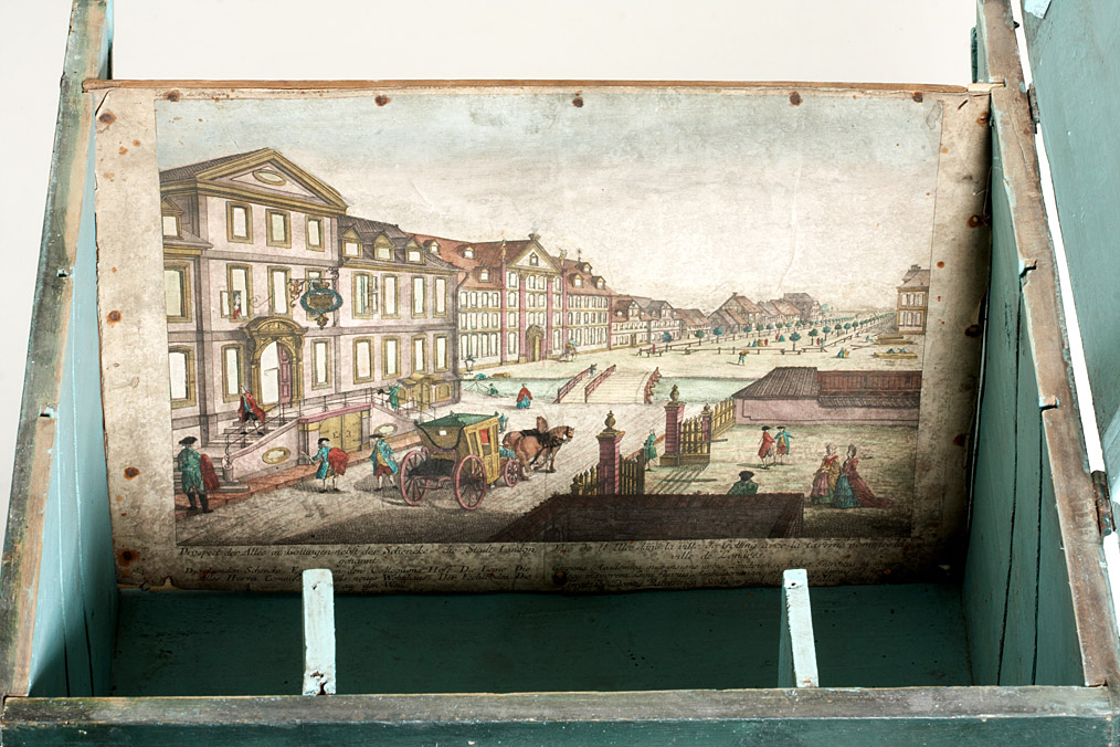 transportable peep show of unknown maker, wooden box with a large central lens on one side, the lens is hidden behind a wooden board when not in use, the hinged lid can be opened to change the perspective views, the lid has one big opening to direct the light onto the image and two small circular holes which serve as chimneys for the two candles which may be positioned to the both sides of the viewing lens, the candles can be accessed by two additional openings on the left and right side of the box, all openings can be closed by hinged or sliding covers, in the inside there are four slots to position the views in different distances. Together with the peepshow comes an 18^th century 43x29cm day-and-night effect perspective view depicting a street scene in Göttingen, Germany. Although the hand coloured copper print is ripped on the edges and shows some wearing it still is very detailed and of high artistic quality. The box has been newly painted which somehow derogates the all over impression of this simple, but well thought out instrument.