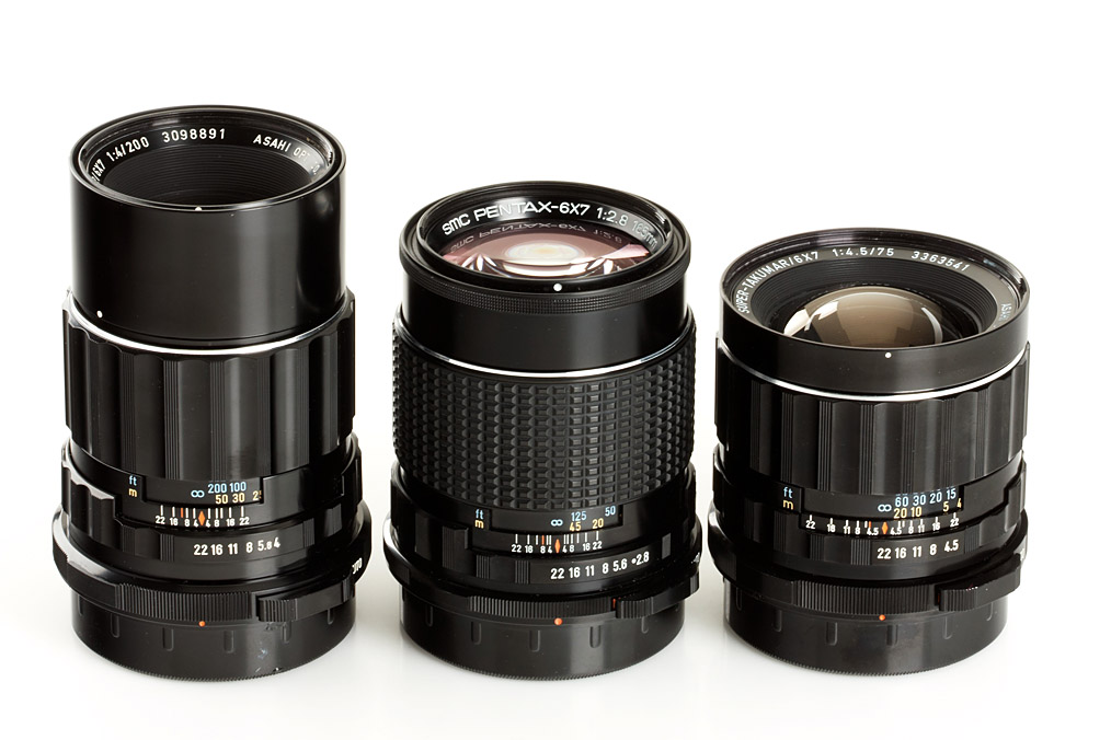 body in good working order with prism finder, SMC-Pentax 6x7 2.8/90mm no.8512305, cap, hood, Super-Takumar 4.5/75mm no.3363541, caps, hood, keeper, SMC Pentax-6x7 2.8/165mm no.8509892, Super-Takumar 4/200mm no.3098891, cap, keeper, waist level finder in maker's box, remote battery cord in maker's box