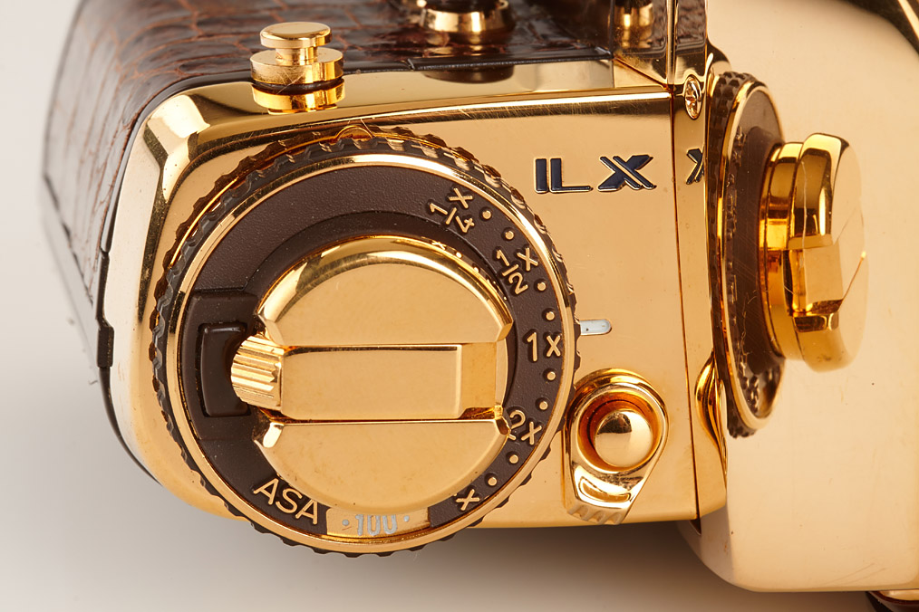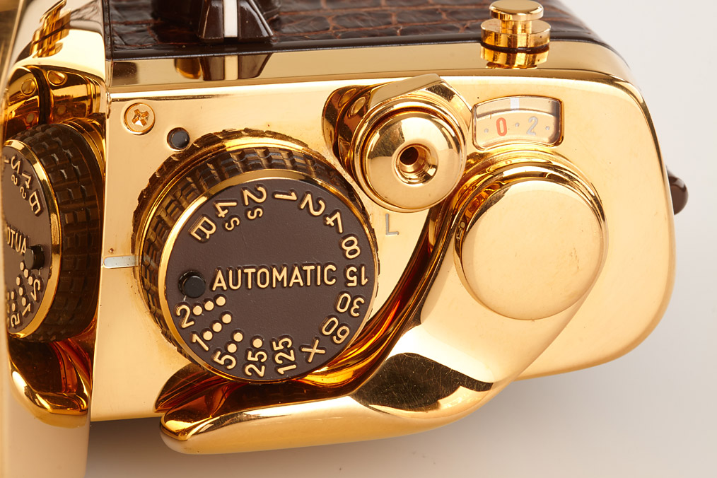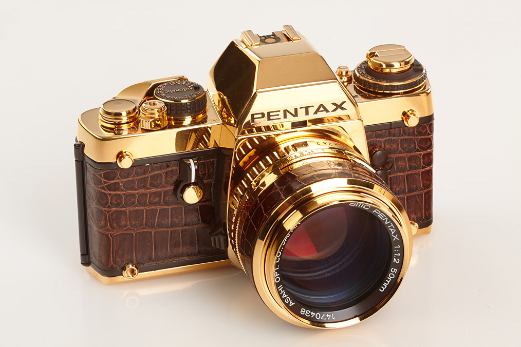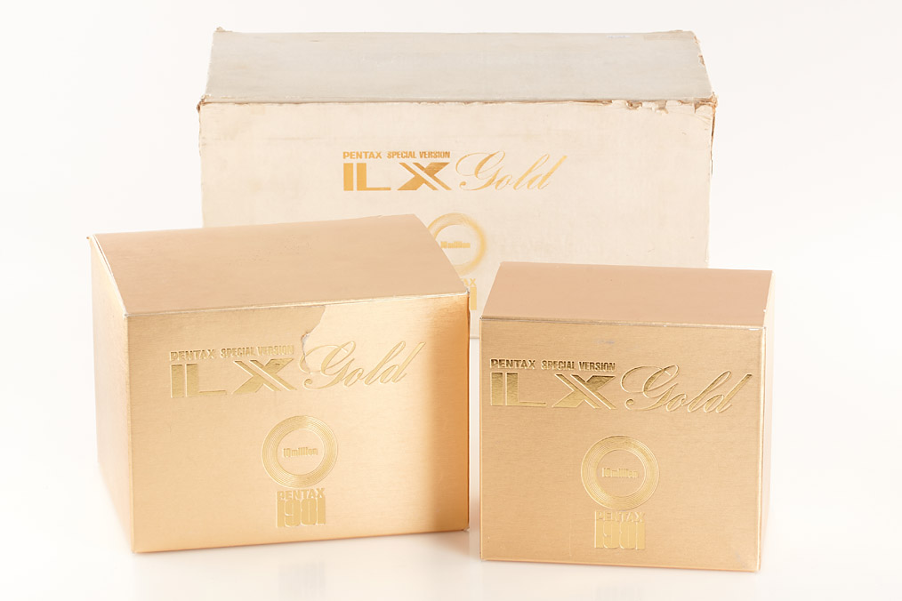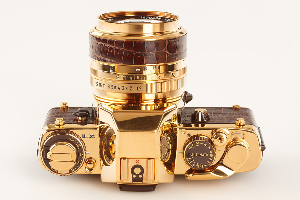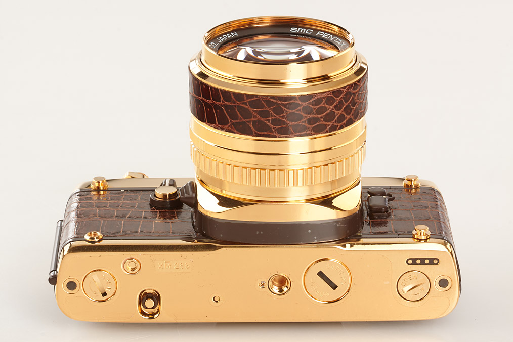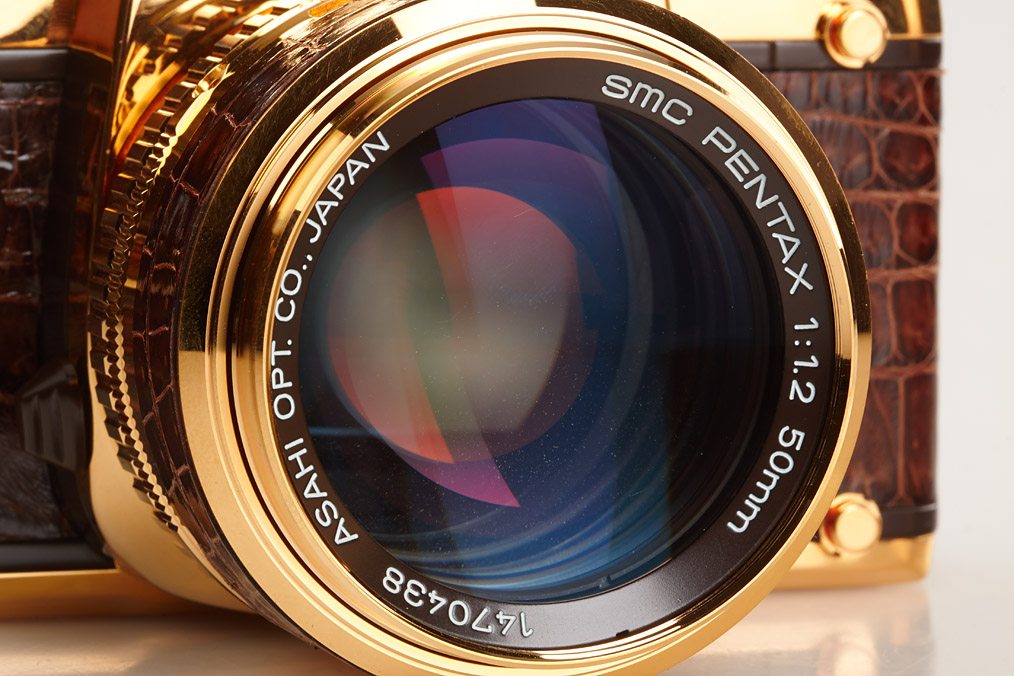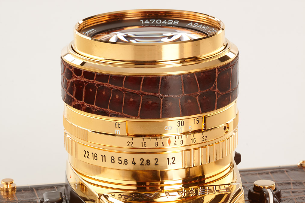 rare gold plated LX with reptile leather covering with matching fast SMC Pentax 1.2/50mm no.1470438 (heavy lens), according to several sources only about 300 examples were produced, with cap, strap, case, papers, maker's boxes and outer box