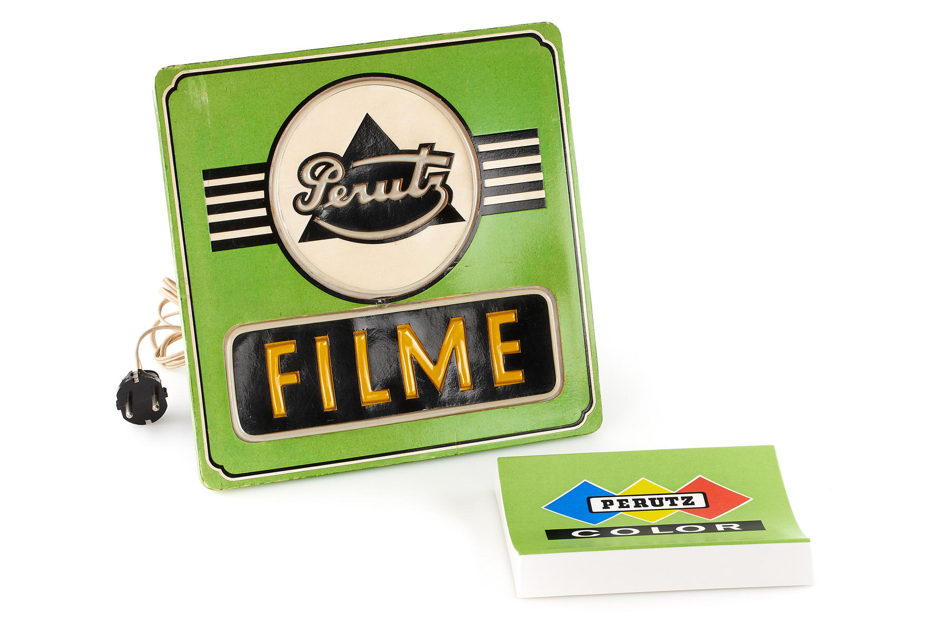 very nice advertising lamp for Perutz, printed plastic and foldable cardboard 21 x 28 x 29cm, in very good condition and working order, together with a Perutz coin tray, printed plastic 19 x 18 x 2.5cm, in near-mint condition