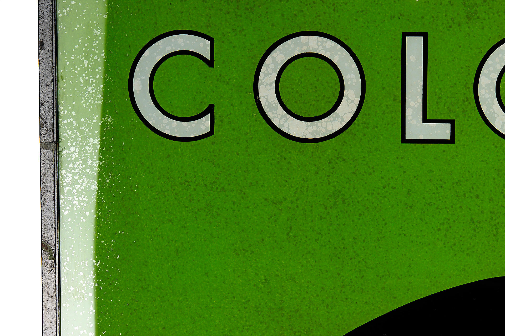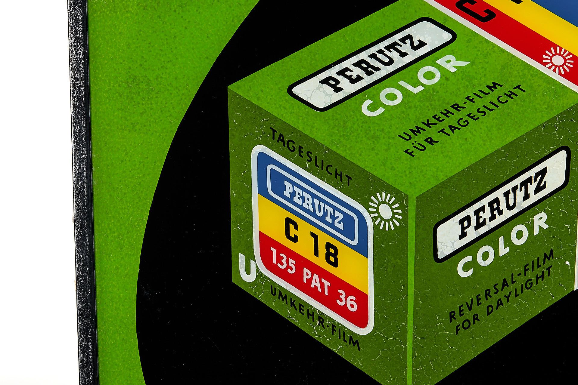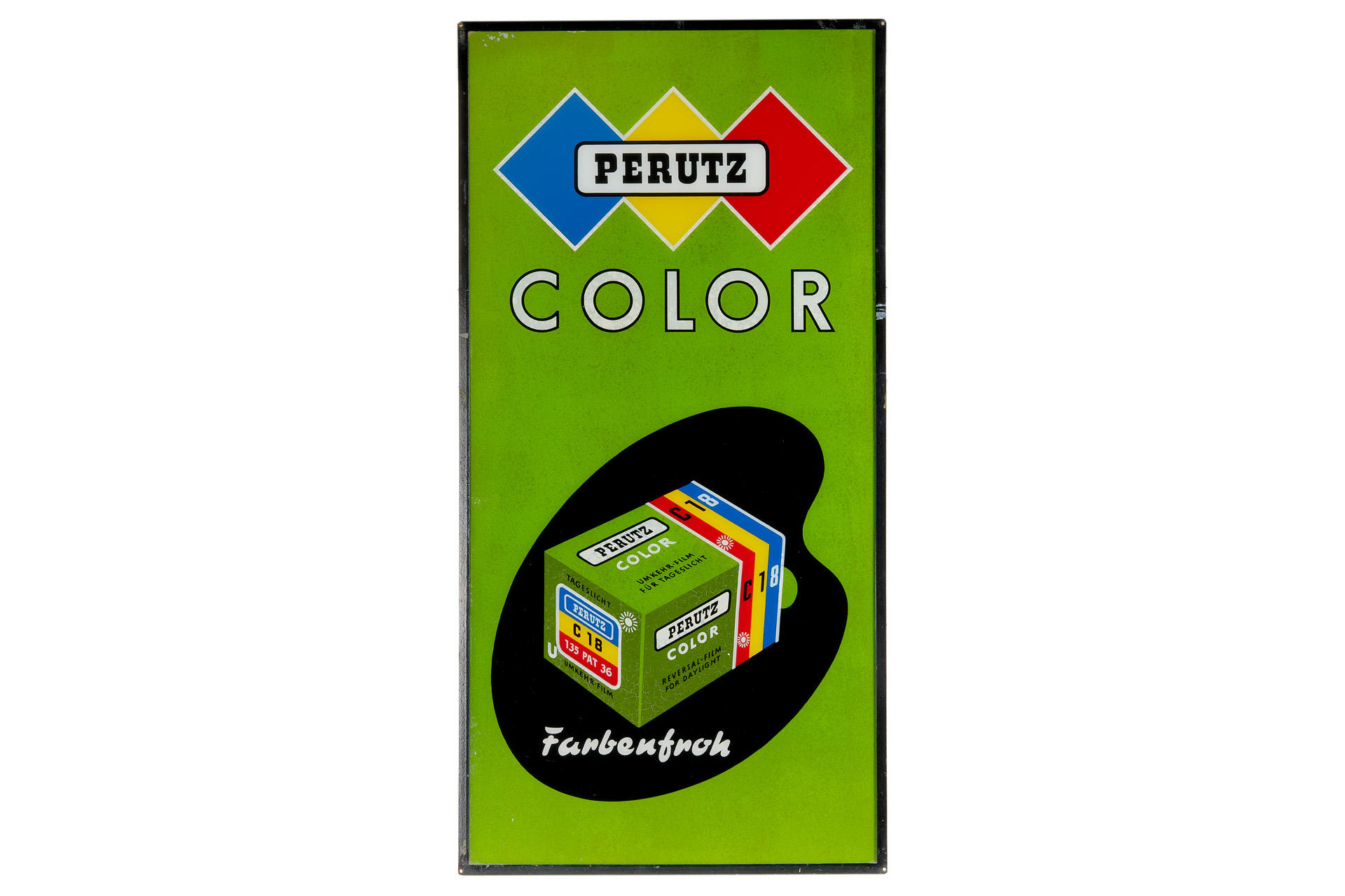 Beautiful classic, large Perutz sign made of painted glass with metal frame in good and original condition (120x60cm)