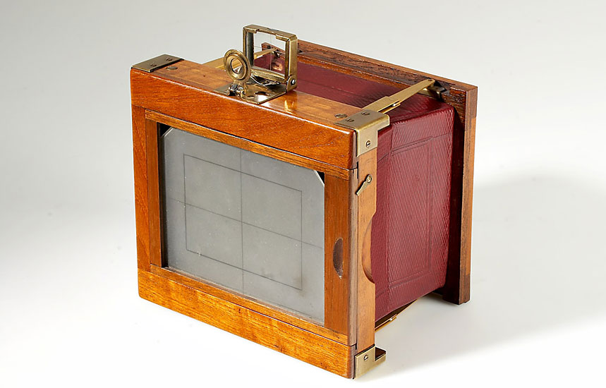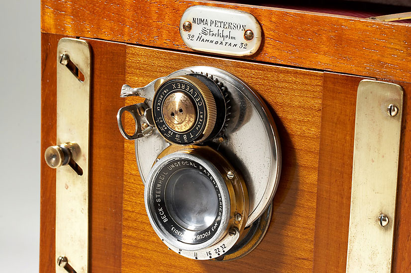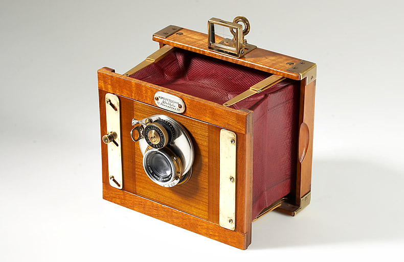 9x12cm, Numa Peterson, Stockholm, wonderful manufactured luxury copy of Anschütz Klappkamera, mahogany body with brass fittings, red reptile leather bellows, Beck-Steinheil Unofocal 6/4.75" lens no.13013 with Celverex shutter, focusing screen adapter