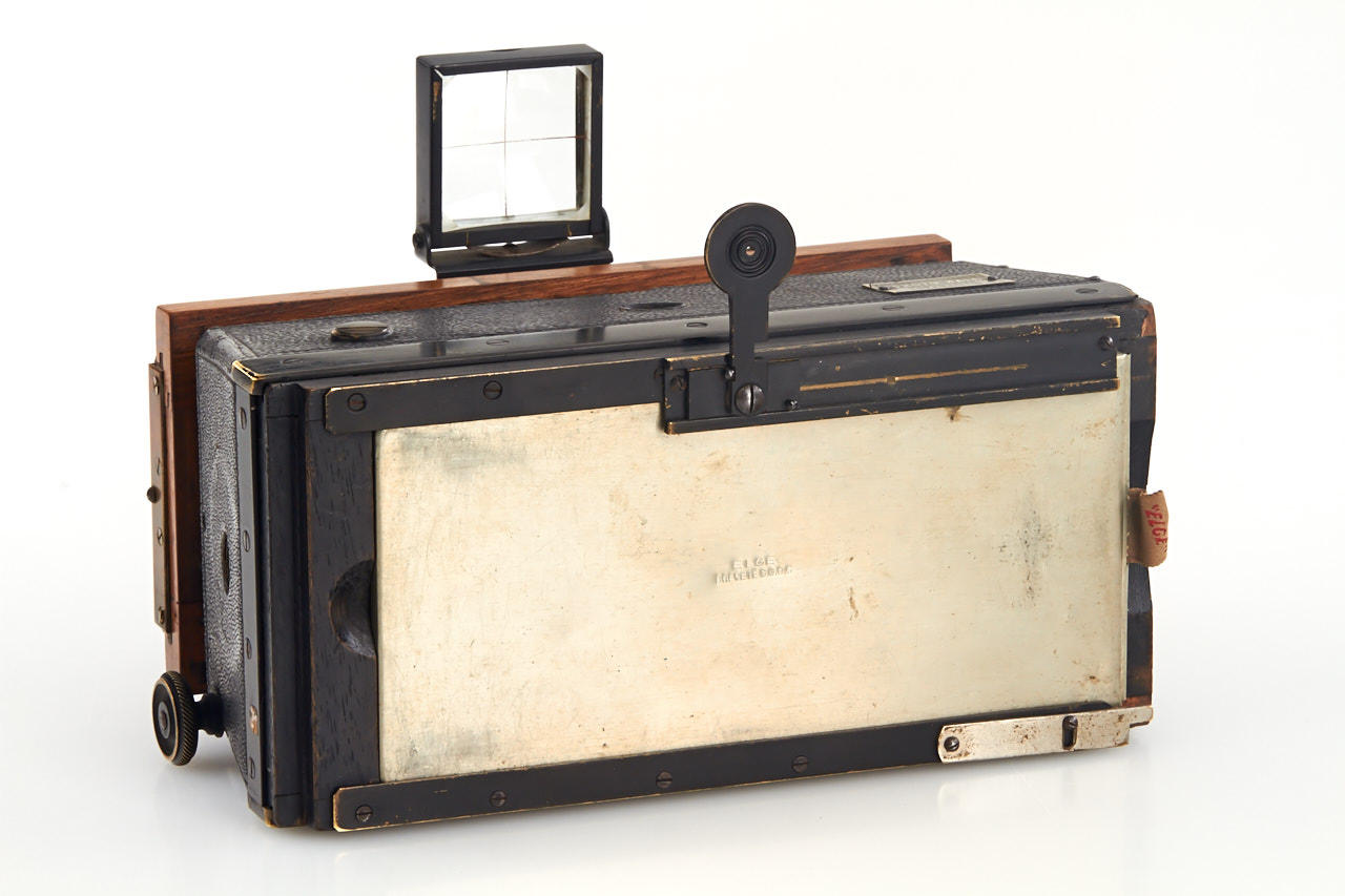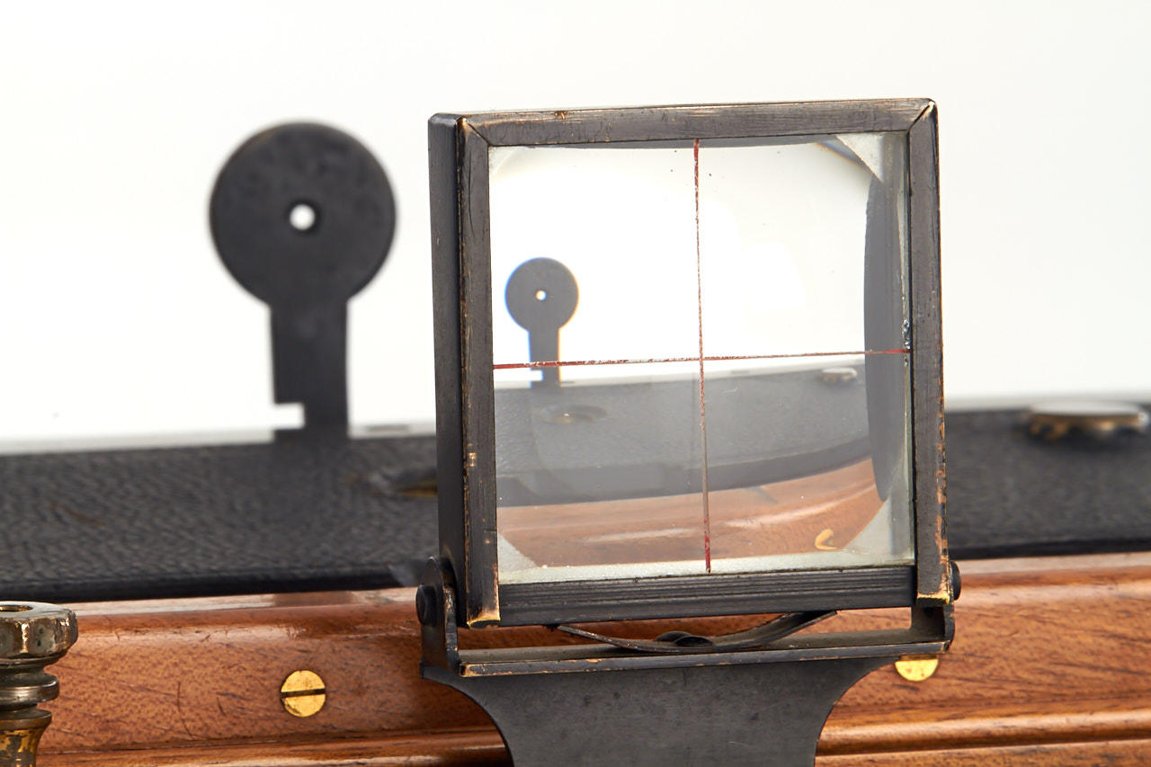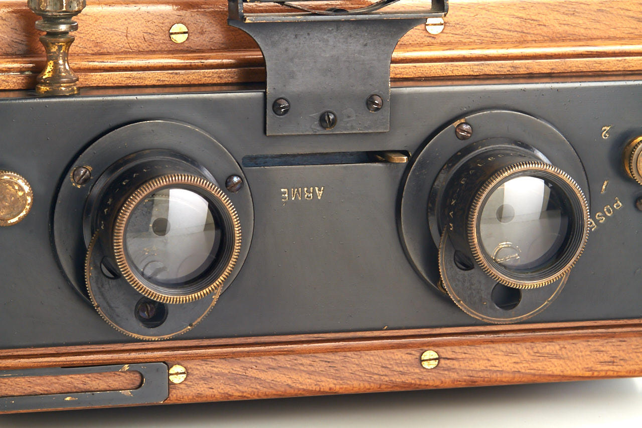 6x13cm jumelle-style stereo camera in very good condition, with dual rare Max Balbreck Paris lenses in guillotine shutter, folding Newton finder, one plate holder