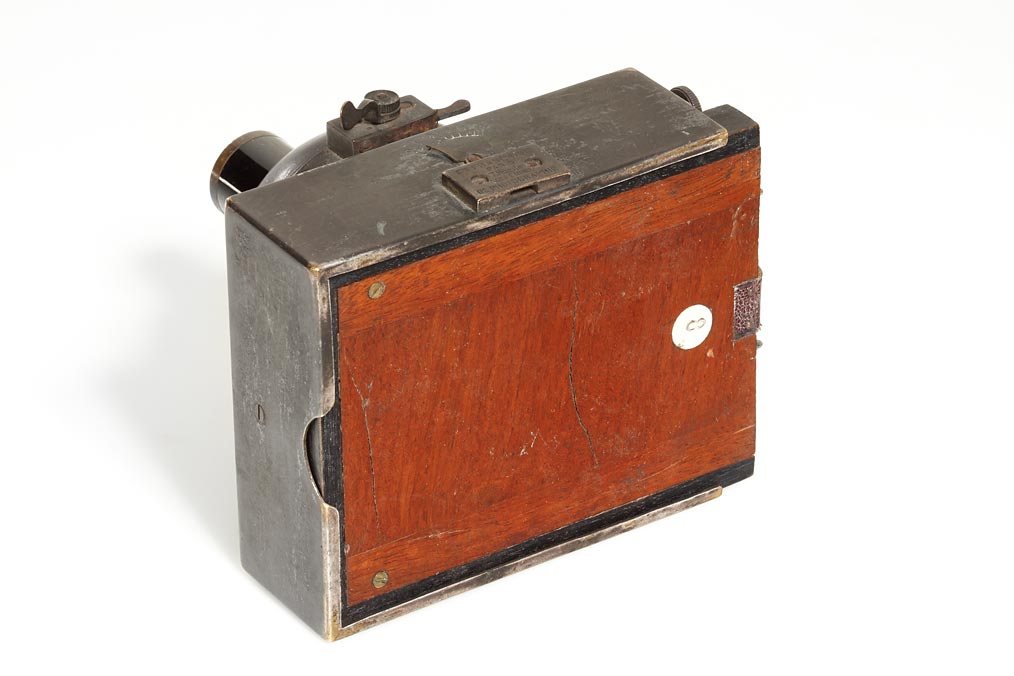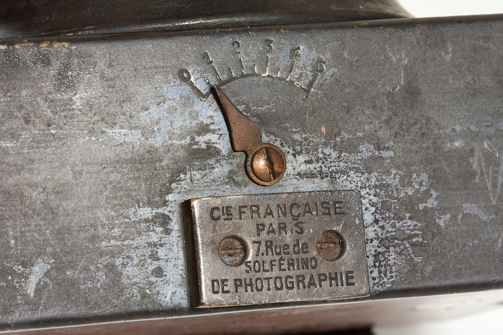 8x9cm, anodised metal body, hemispherical shutter, original lens, original plate holder in wood, very rare in small format 8x9cm