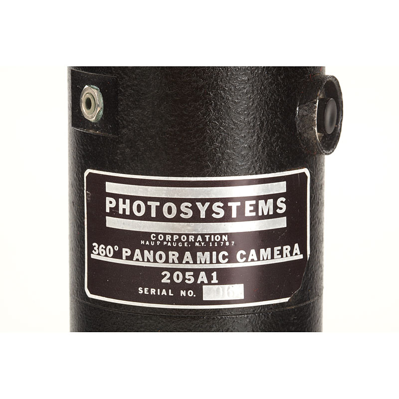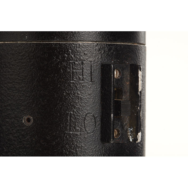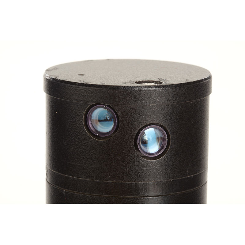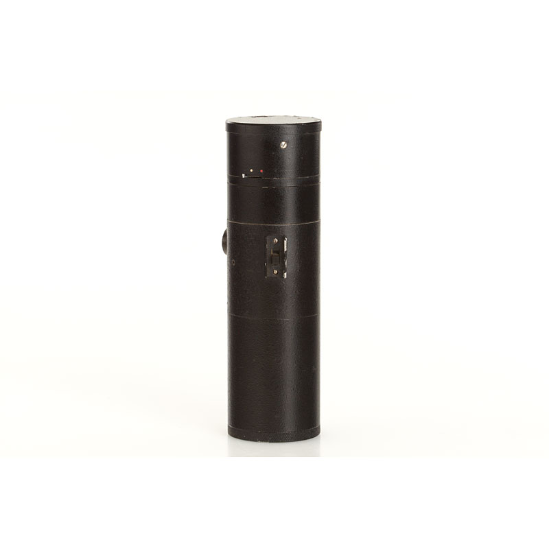 very rare camera in cylindrical form, possibly made to photograph the interior of pipes or similar, for 16mm film, two lenses, switch for HIGH and LOW, plug for electric cable release, for use with 6 batteries, height 19.5cm