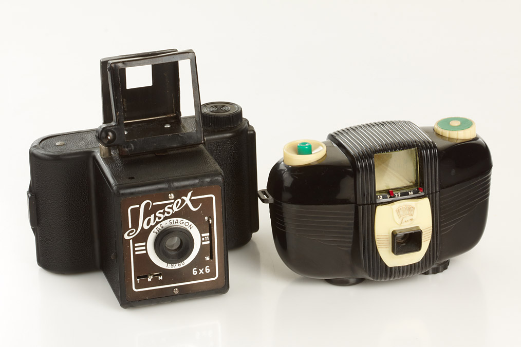 (1) very rare Indra Lux for 4x4cm exposures on 127 film, brown leather case, the company was only for a few months in business, (2) SAS Sassex, for 6x6cm exposures on 120 Rollfilm, SAS-Siagon 9/80mm, folding frame finder (2)