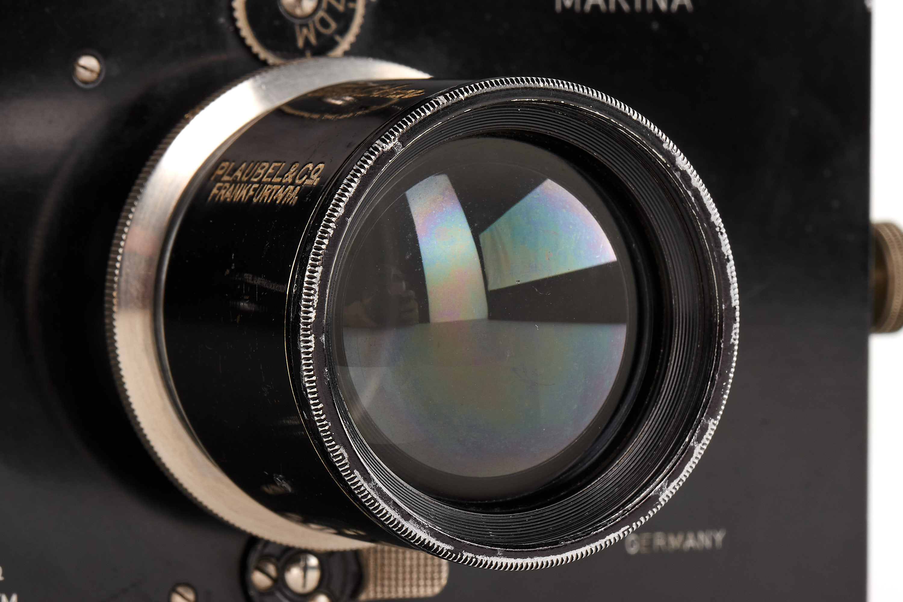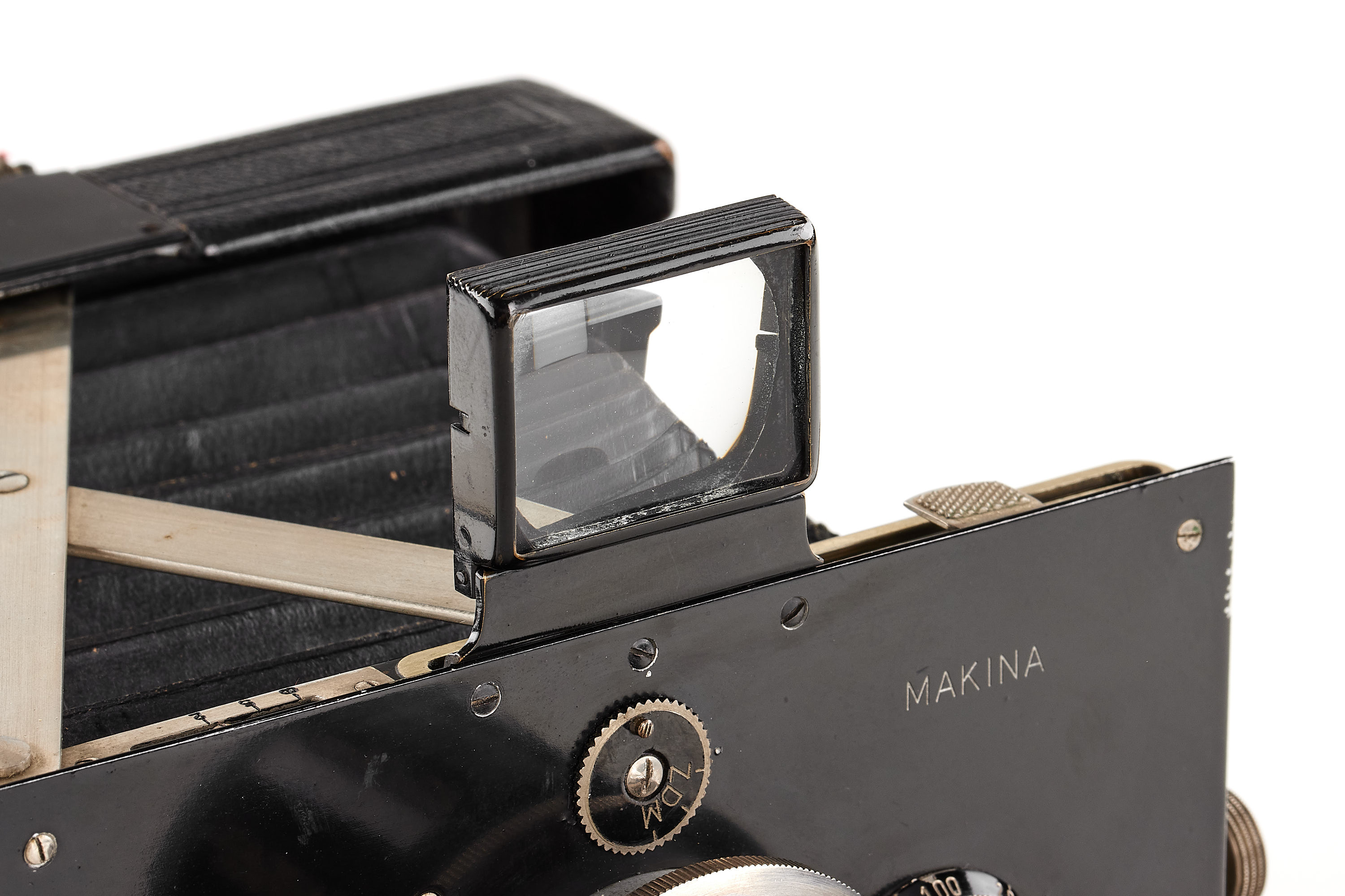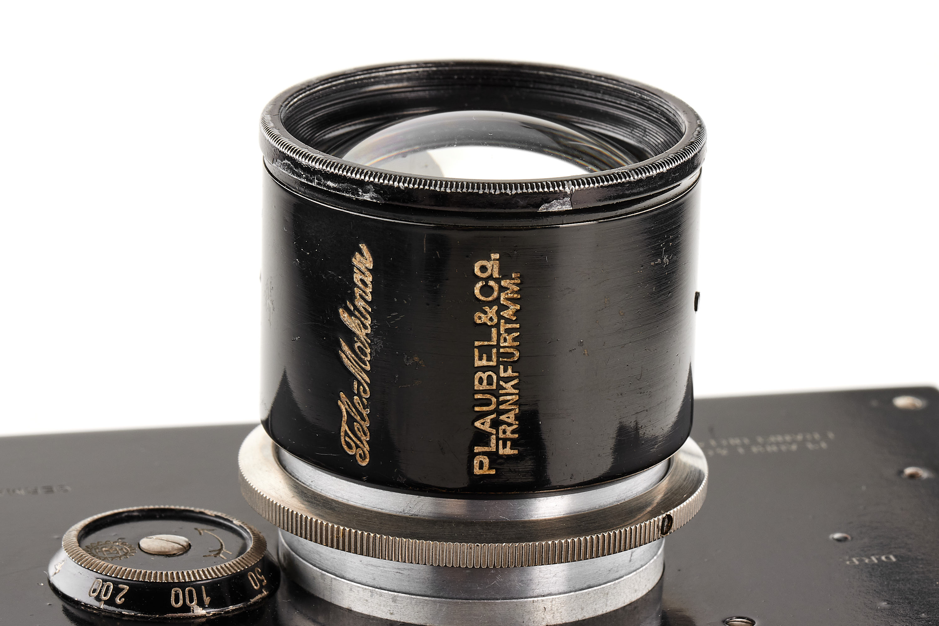 Very rare and interesting prototype of the Plaubel Makina I, based on a Baby Makina but slightly wider, for 6.5x9cm film plates (instead of 4.5x6cm for the Baby Makina), with leaf shutter and built-in aperture (ca. 3-18), unnumbered body in good condition and working order, together with unnumbered Tele-Makinar 6.3/21cm prototype (one aperture blade is missing), with ground glass back.