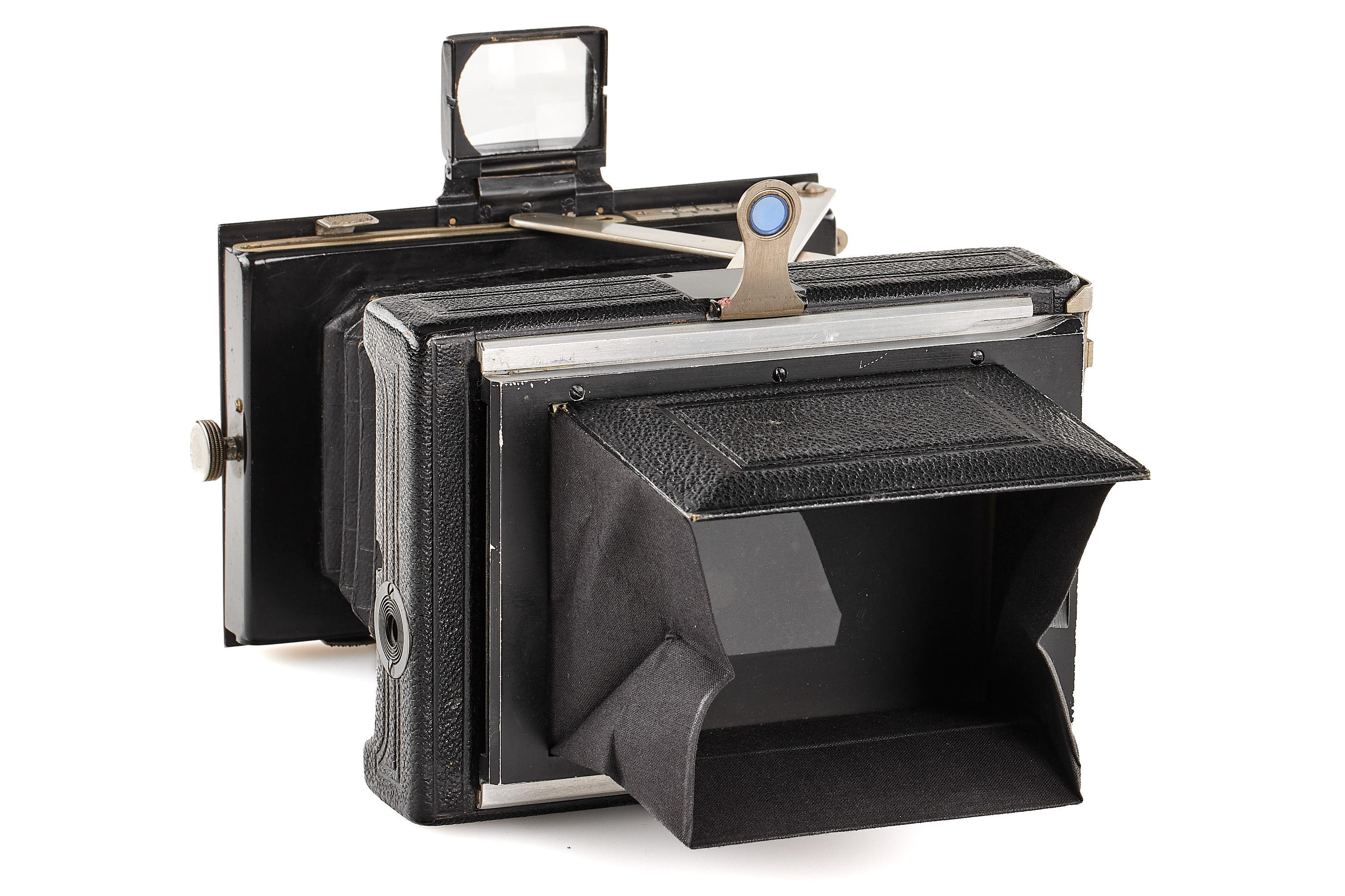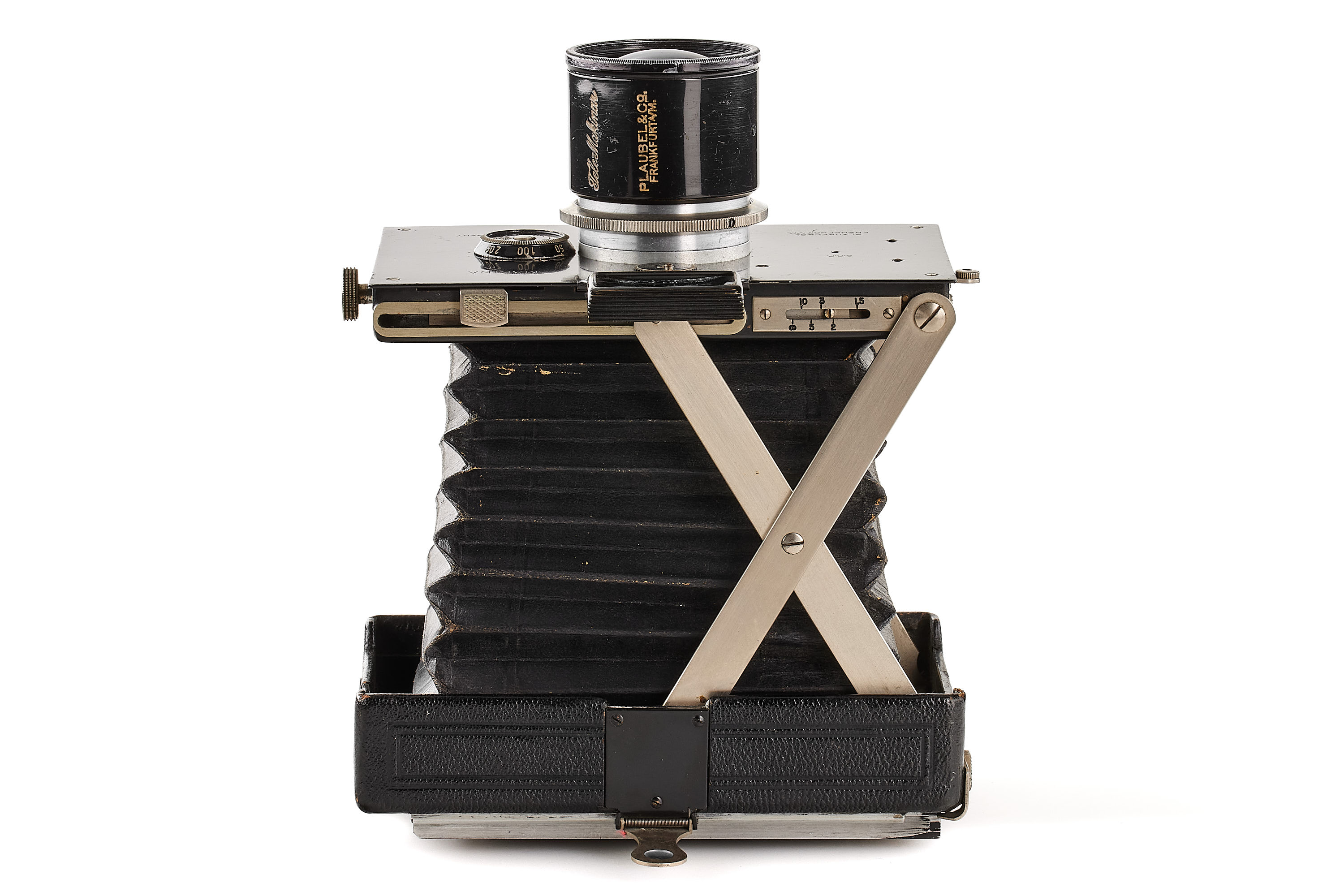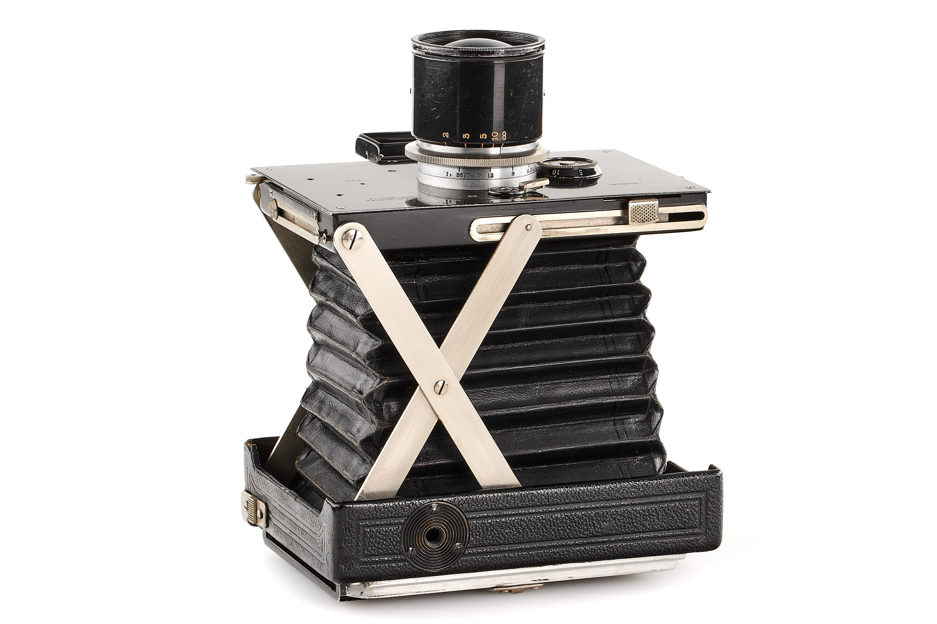 Very rare and interesting prototype of the Plaubel Makina I, based on a Baby Makina but slightly wider, for 6.5x9cm film plates (instead of 4.5x6cm for the Baby Makina), with leaf shutter and built-in aperture (ca. 3-18), unnumbered body in good condition and working order, together with unnumbered Tele-Makinar 6.3/21cm prototype (one aperture blade is missing), with ground glass back.