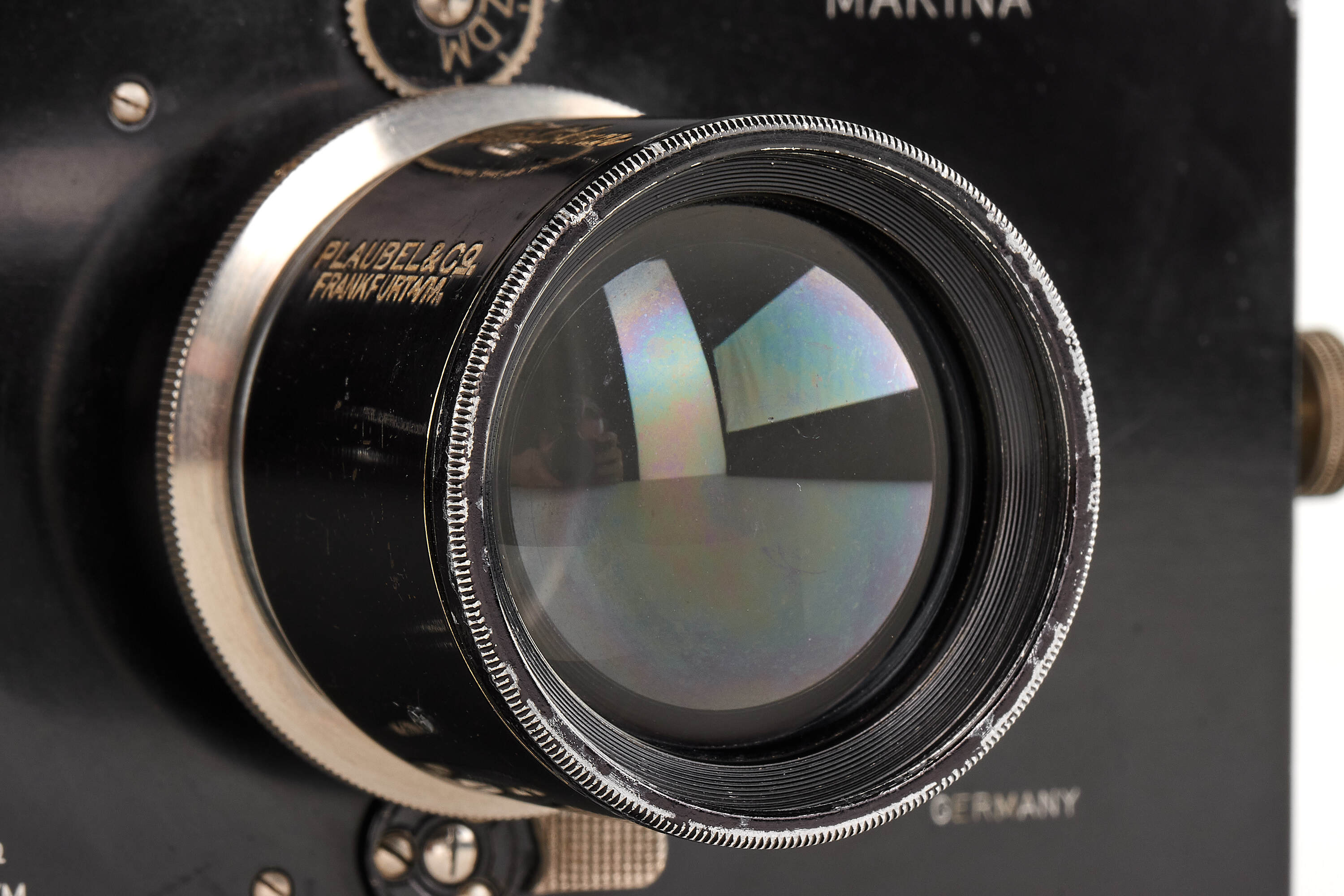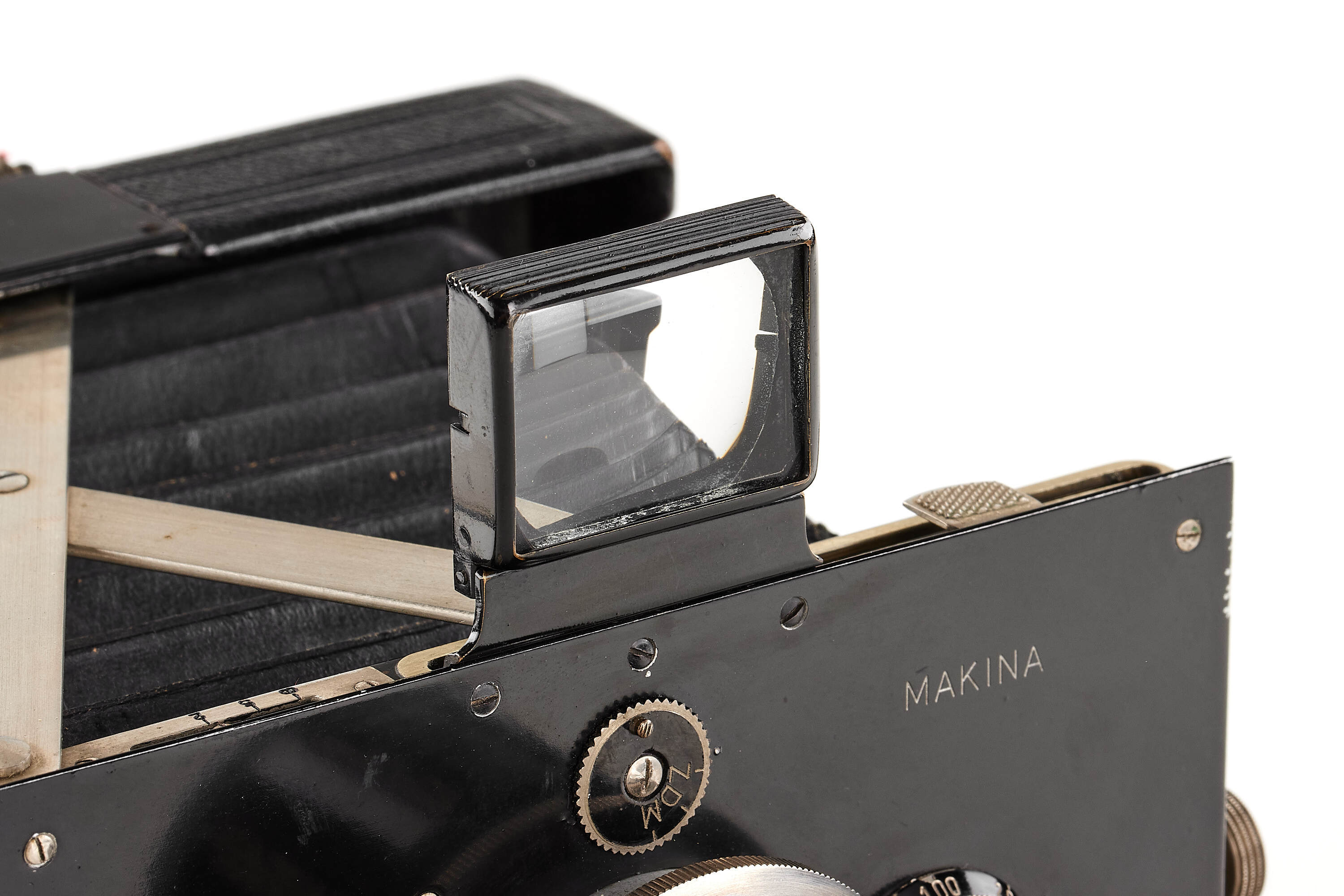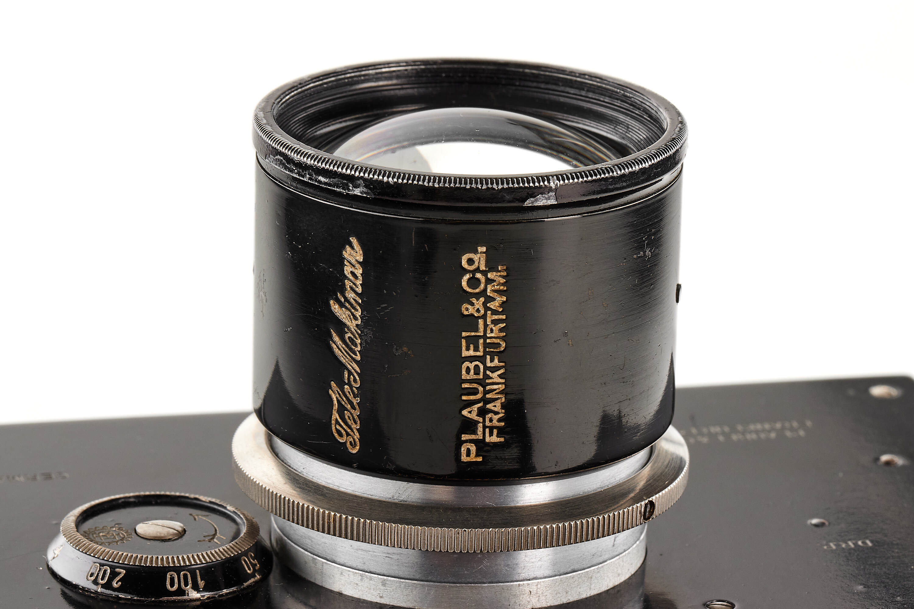 Very rare and interesting prototype of the Plaubel Makina I, based on a Baby Makina but slightly wider, for 6.5x9cm film plates (instead of 4.5x6cm for the Baby Makina), with leaf shutter and built-in aperture (ca. 3-18), unnumbered body in good condition, together with unnumbered Tele-Makinar 6.3/21cm prototype (one aperture blade is missing), with ground glass back.