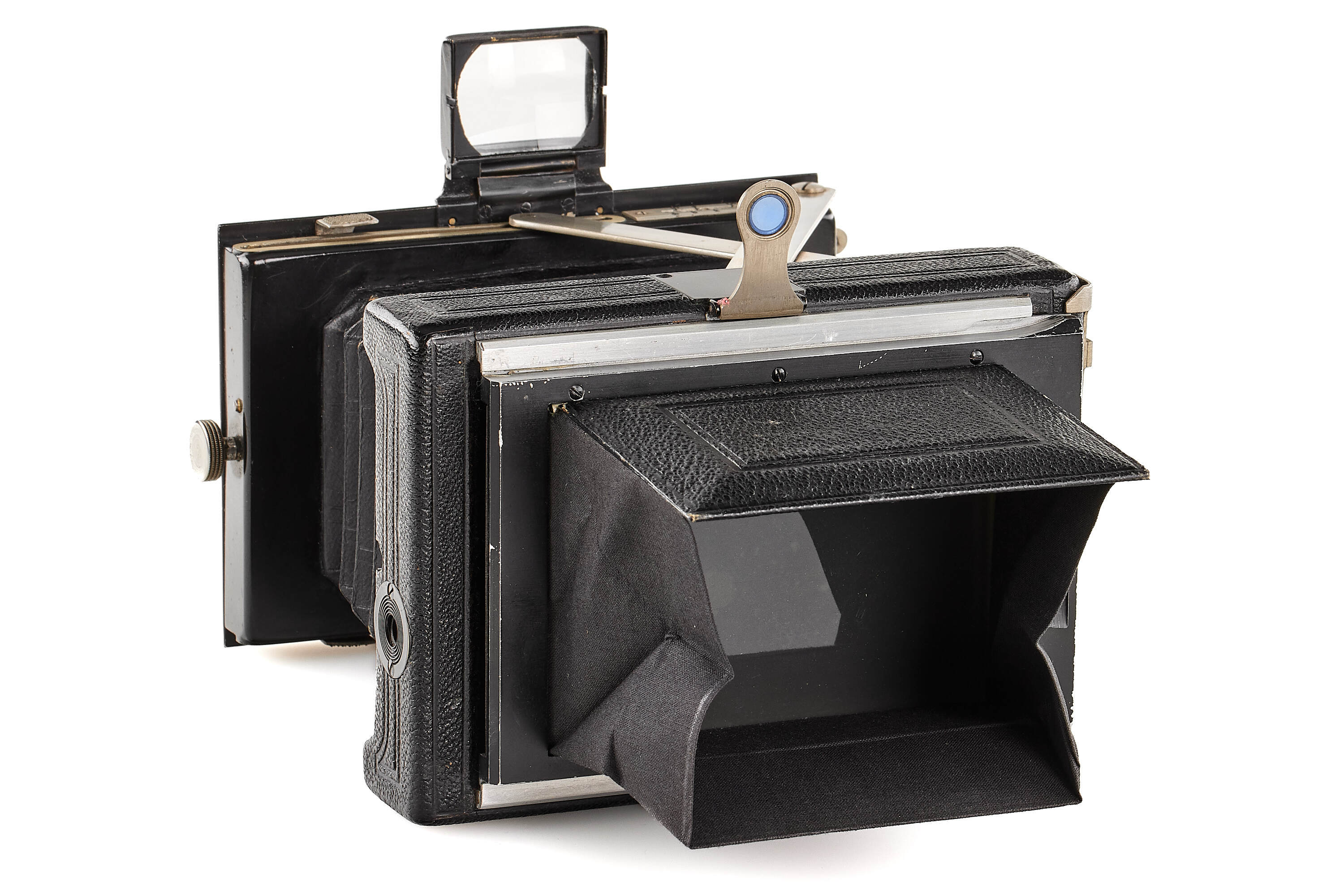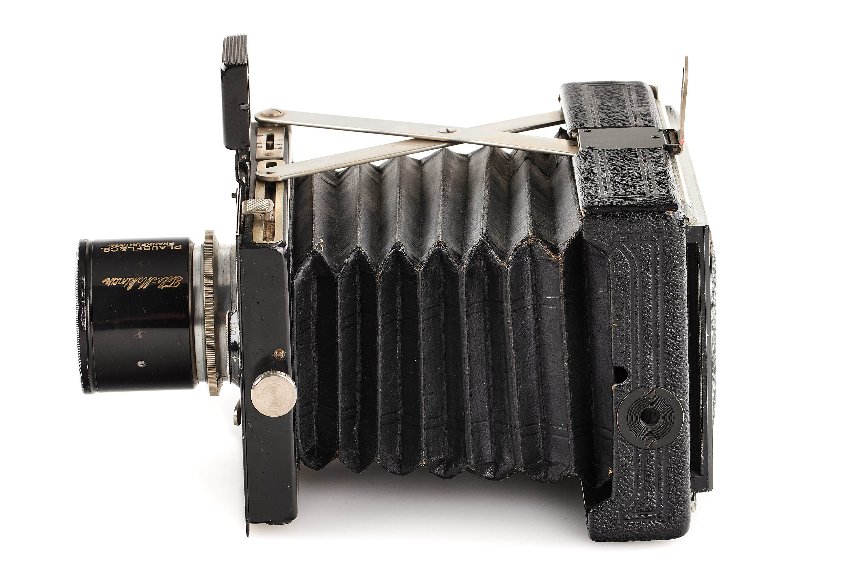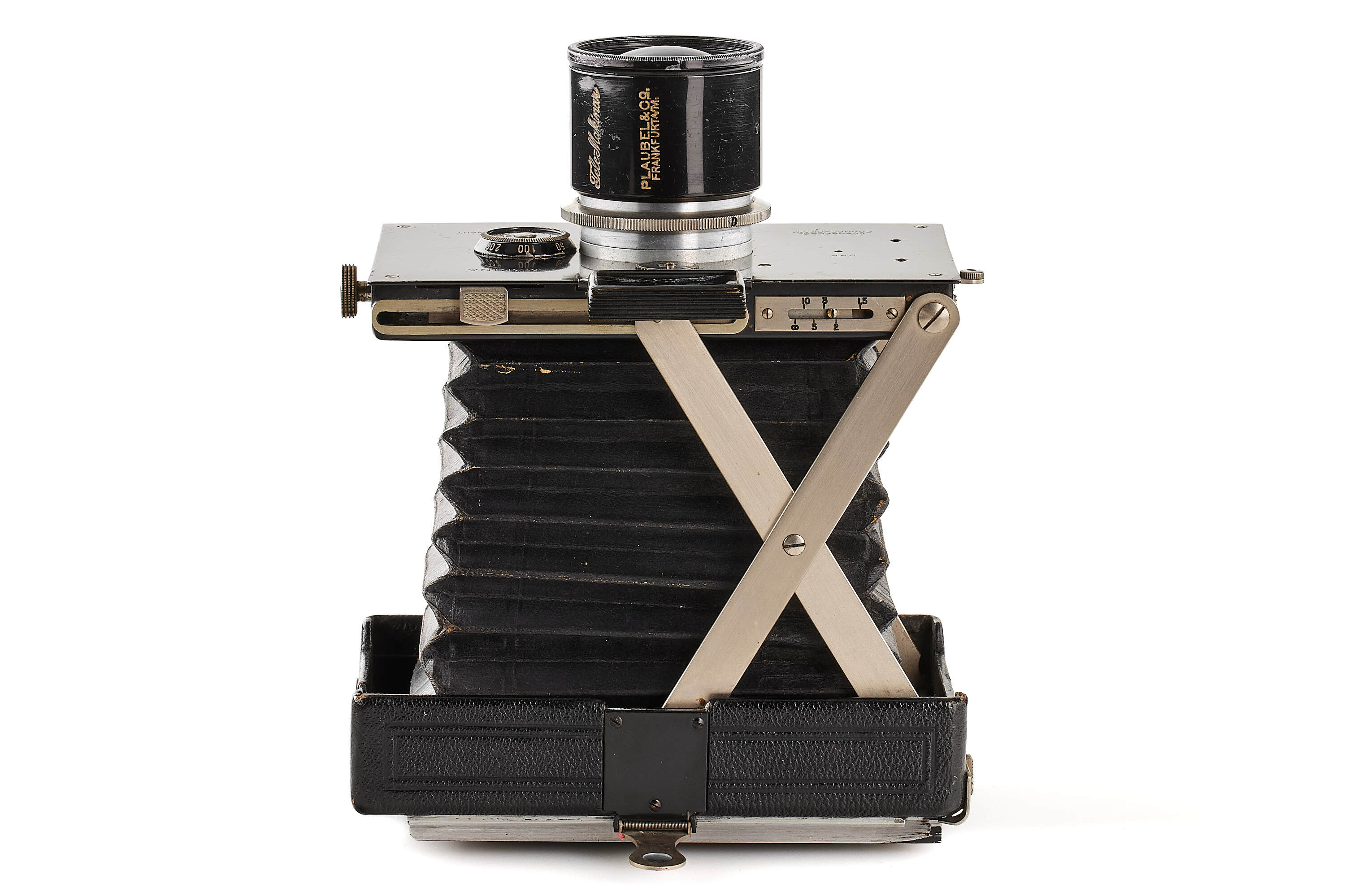 Very rare and interesting prototype of the Plaubel Makina I, based on a Baby Makina but slightly wider, for 6.5x9cm film plates (instead of 4.5x6cm for the Baby Makina), with leaf shutter and built-in aperture (ca. 3-18), unnumbered body in good condition, together with unnumbered Tele-Makinar 6.3/21cm prototype (one aperture blade is missing), with ground glass back.