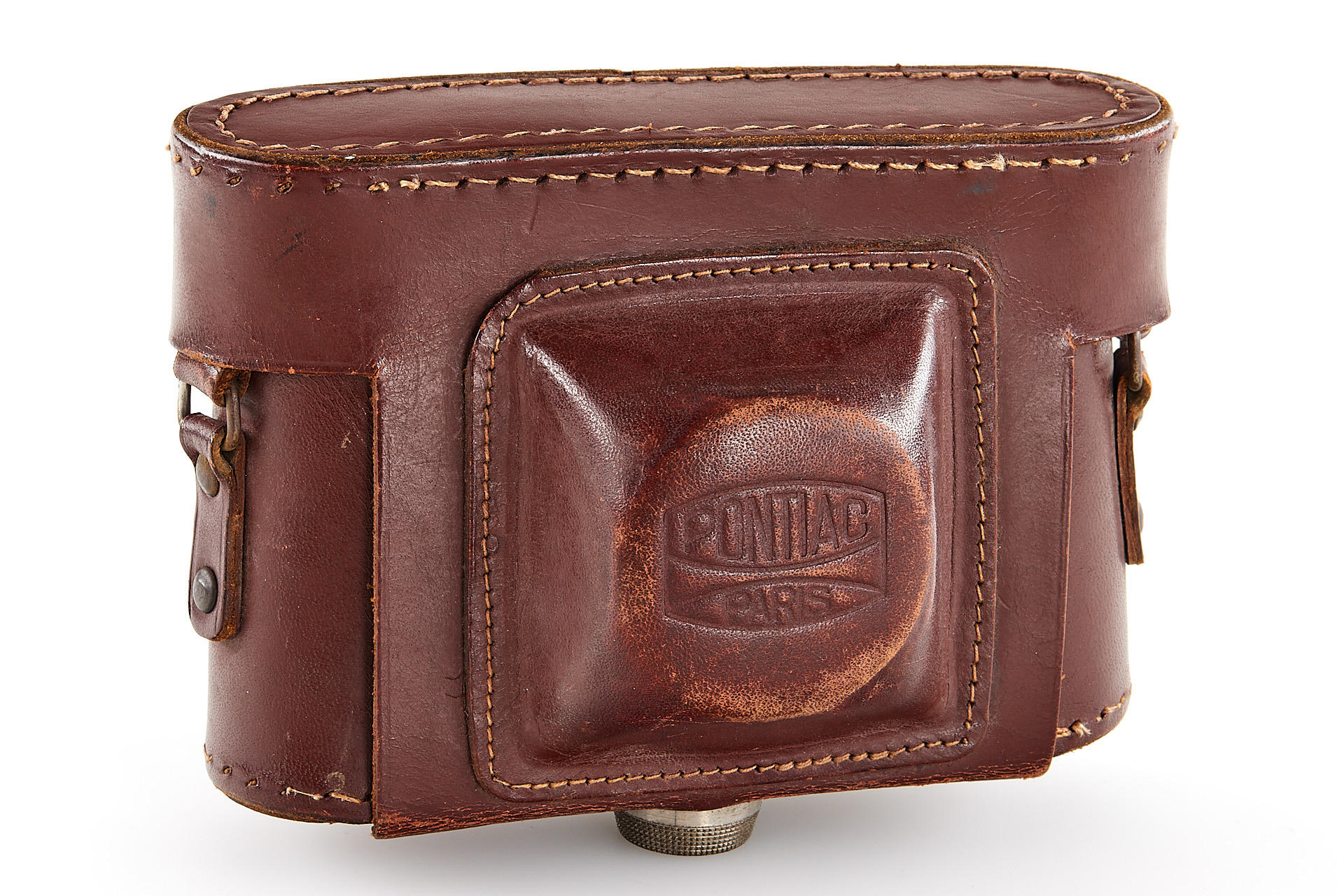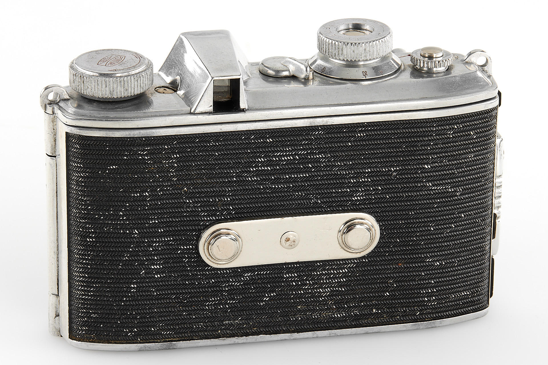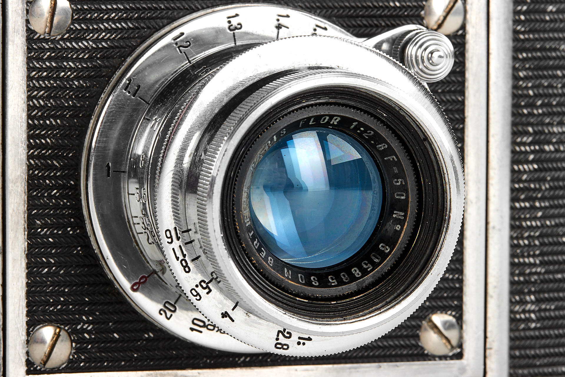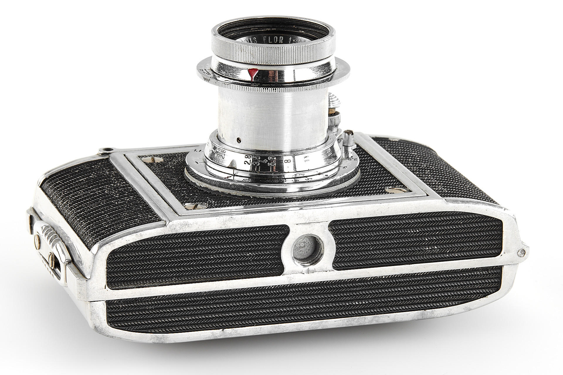 Rare French camera for 3x4cm on 127 roll film, polished Aluminium body with focal-plane shutter in good and original condition, with fix Som Berthiot Flor 2.8/50mm no.805885 and leather case
