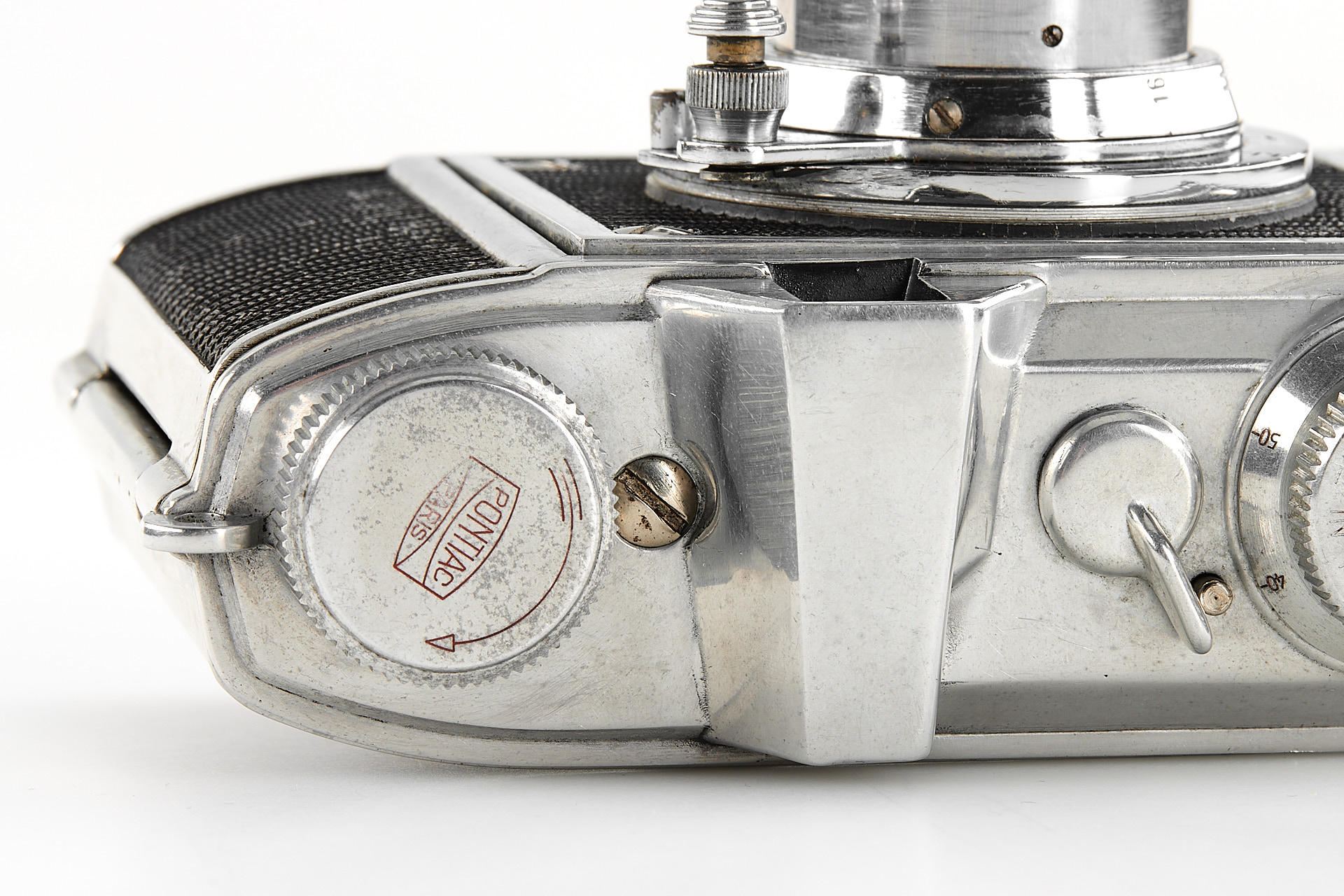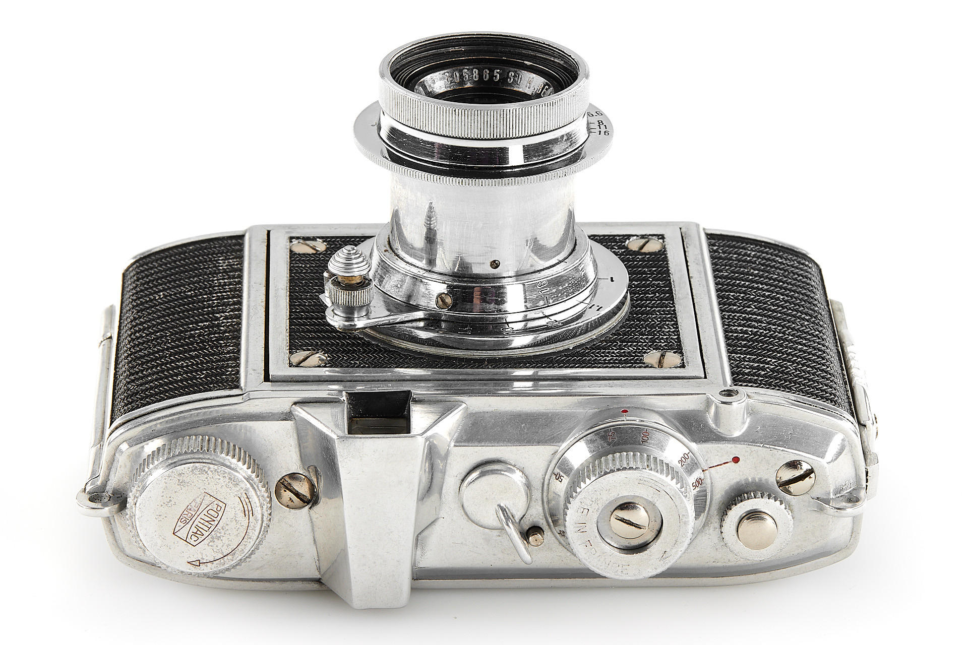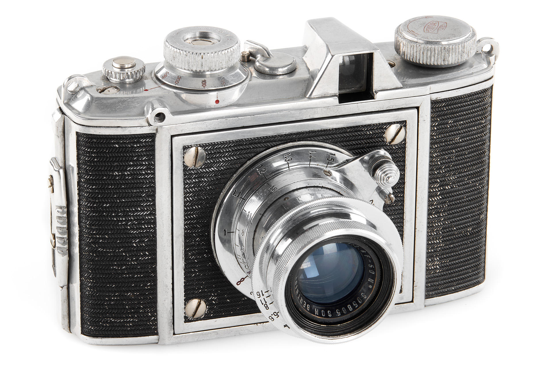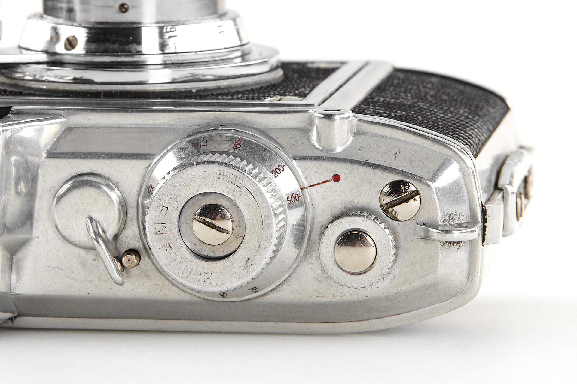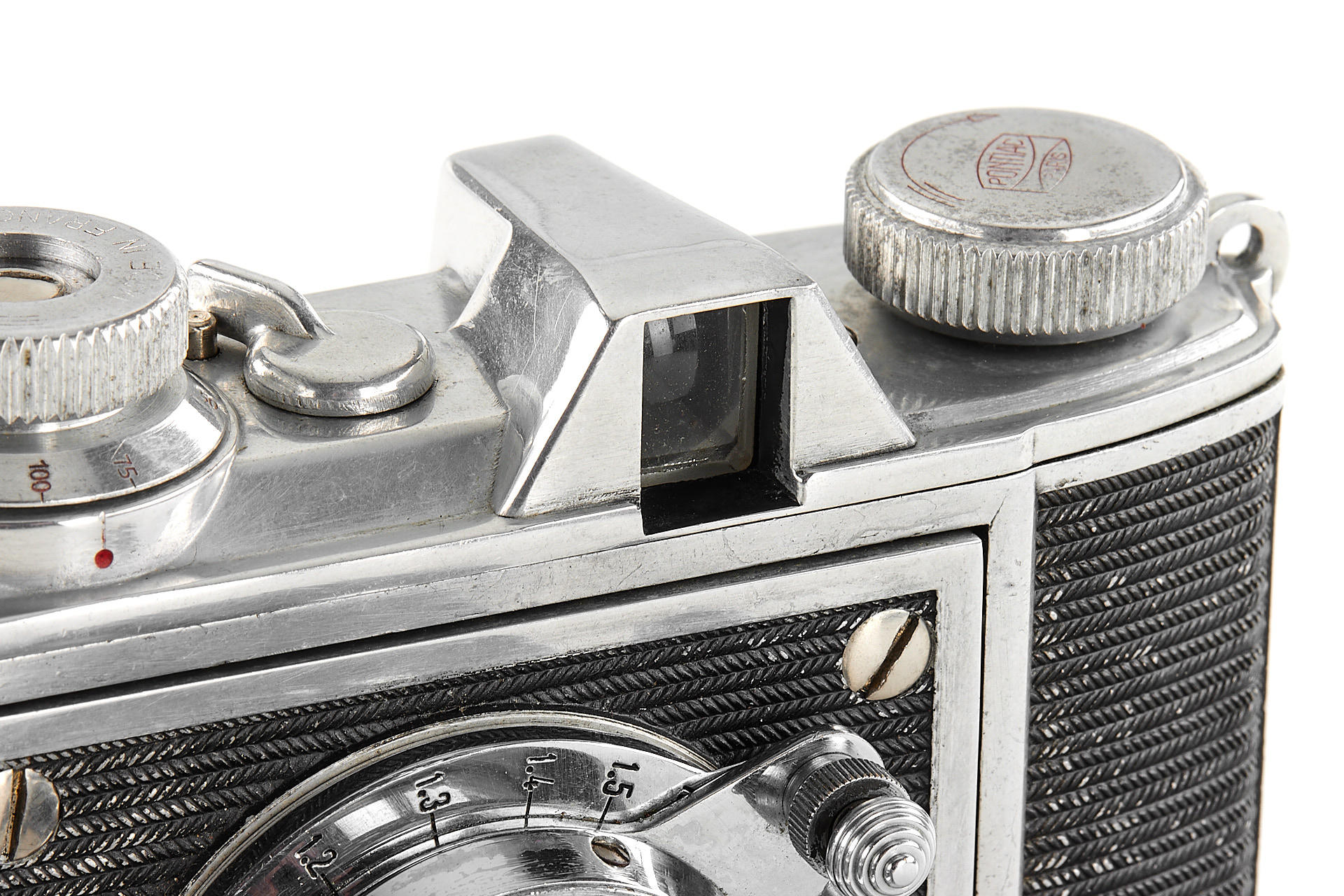 Rare French camera for 3x4cm on 127 roll film, polished Aluminium body with focal-plane shutter in good and original condition, with fix Som Berthiot Flor 2.8/50mm no.805885 and leather case
