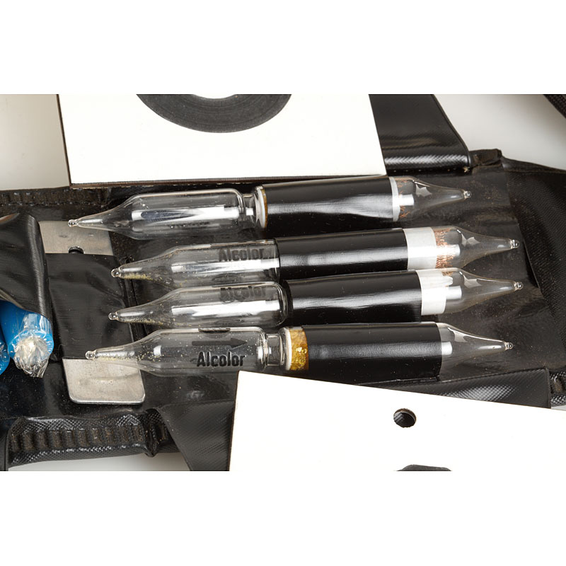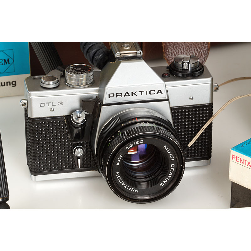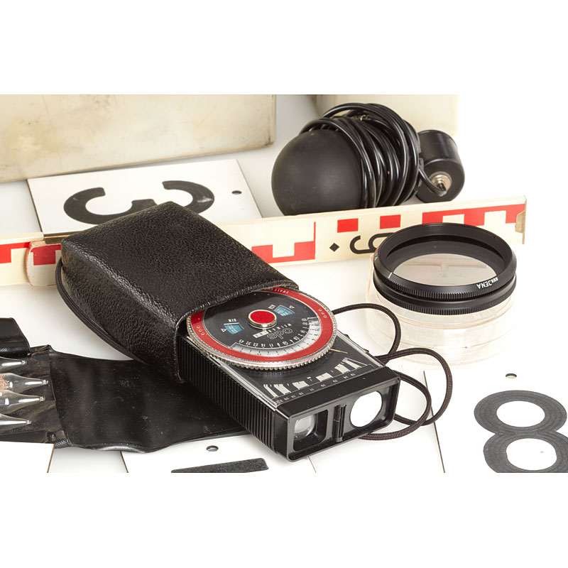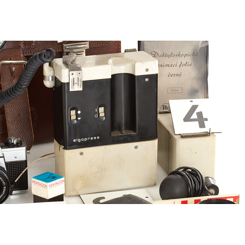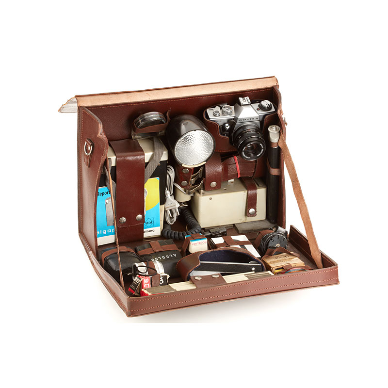very rare and fully authentic police outfit complete with Pentacon 1.8/50mm, flash, cables, scale and several accessories in matching leather outfit case