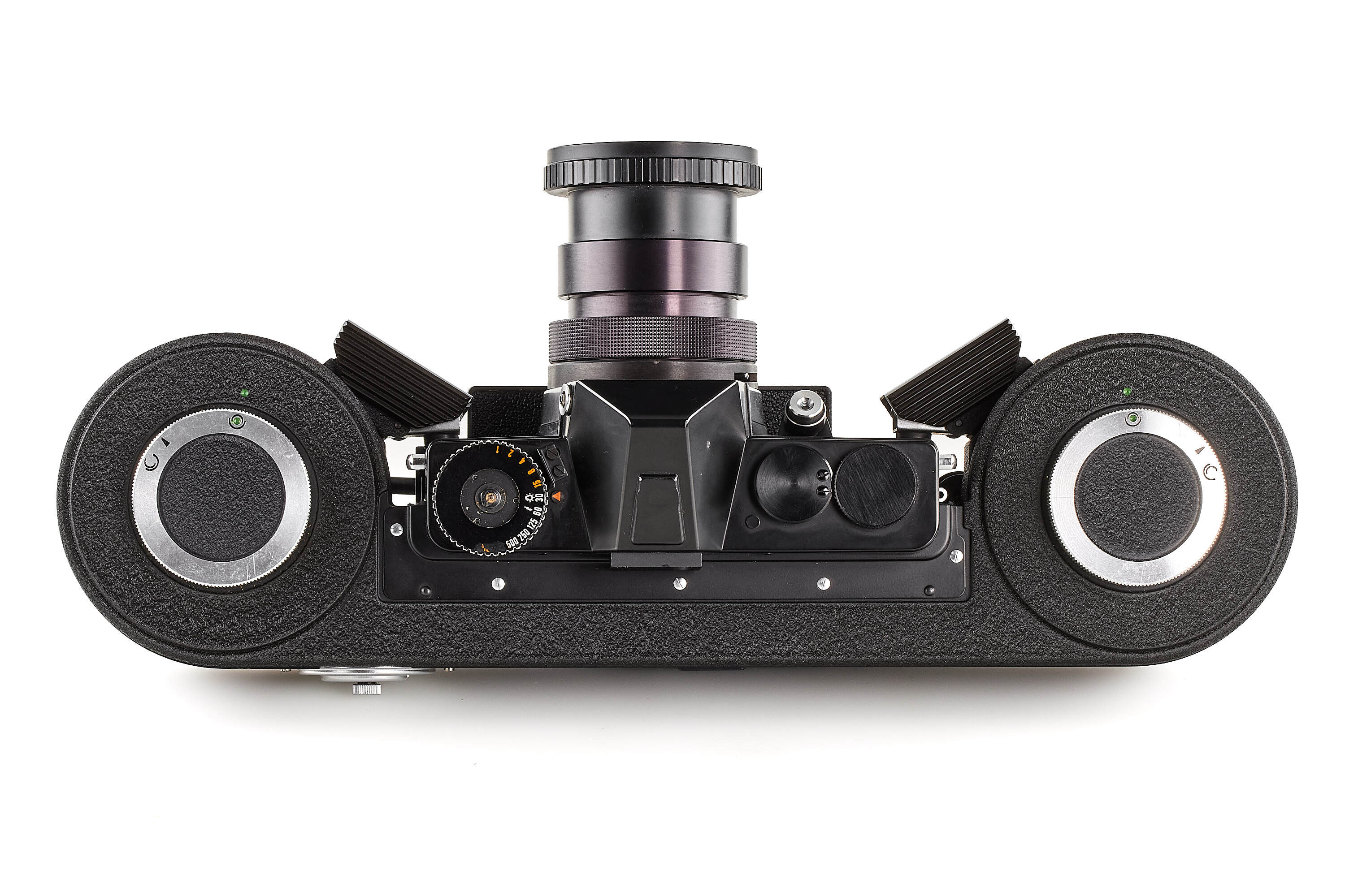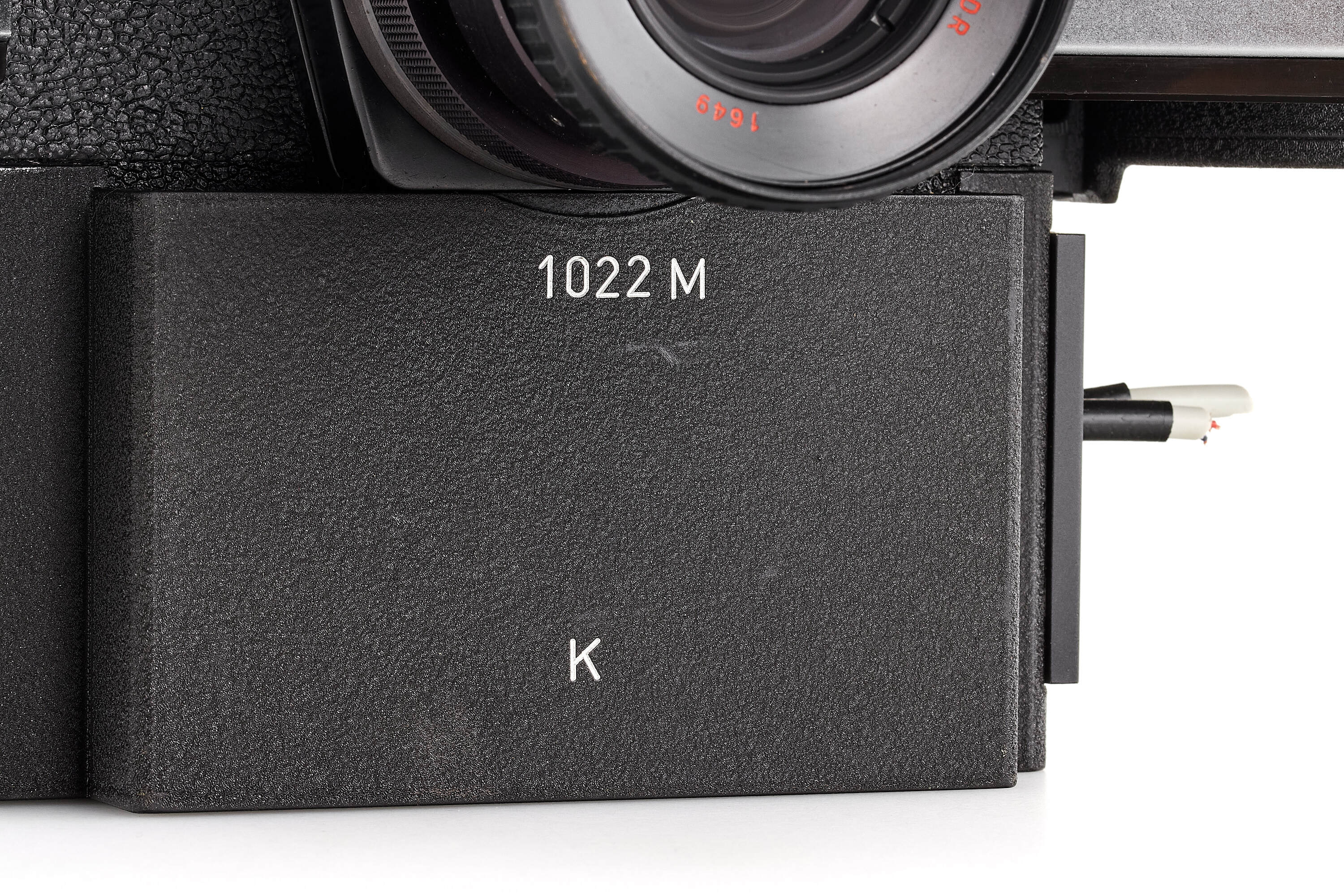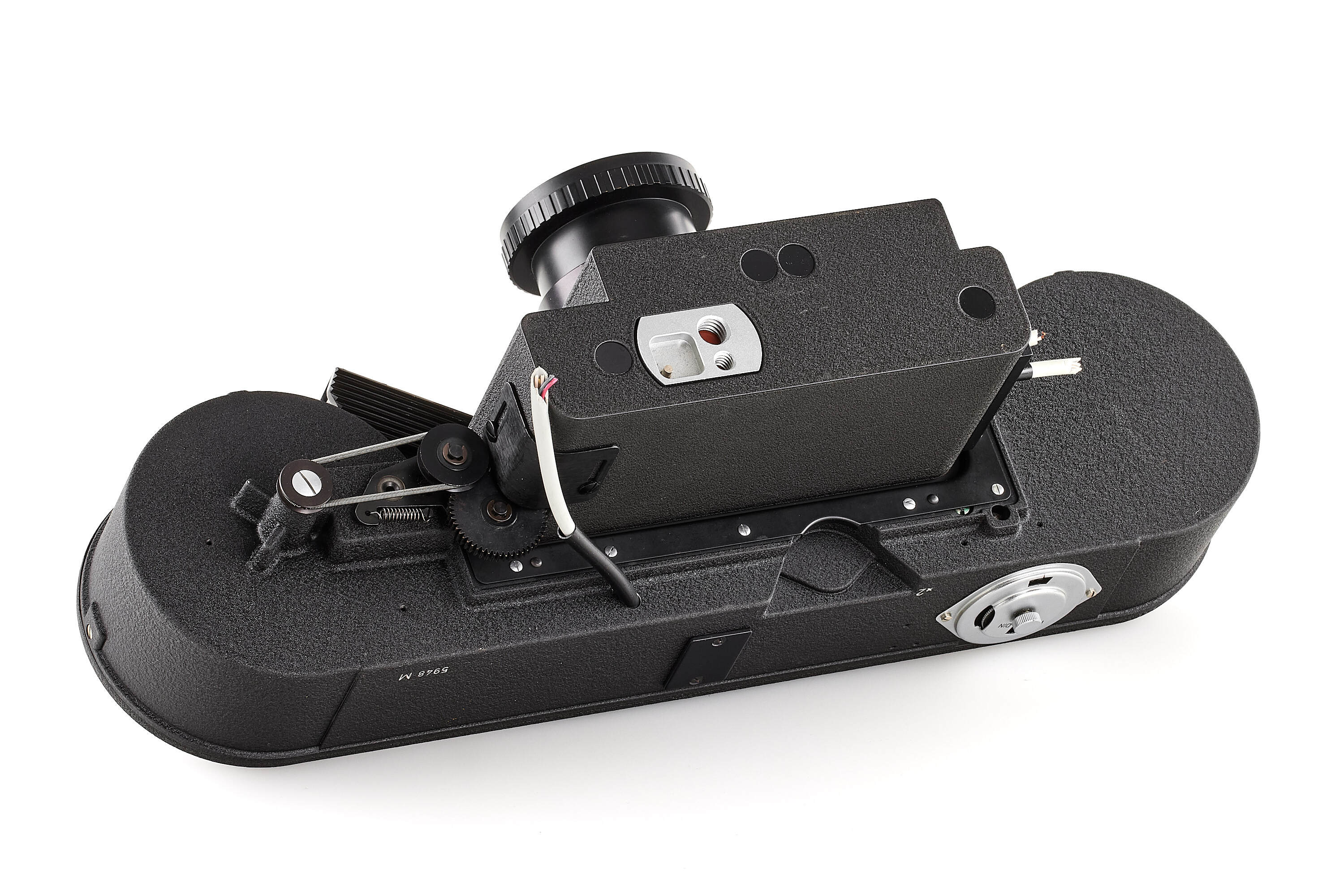 Very rare half format motorized camera developed by East German Secret Service 'STASI', based on a modified Praktica body, in almost mint condition, electric cables are cut off, with high resolution repro Zeiss Dokuma 5.6/47mm no.1649 (front cap), fixed focus and fixed aperture, clean and clear optics, with 450 exposure magazine no.5948, most probably used for reproduction of documents.