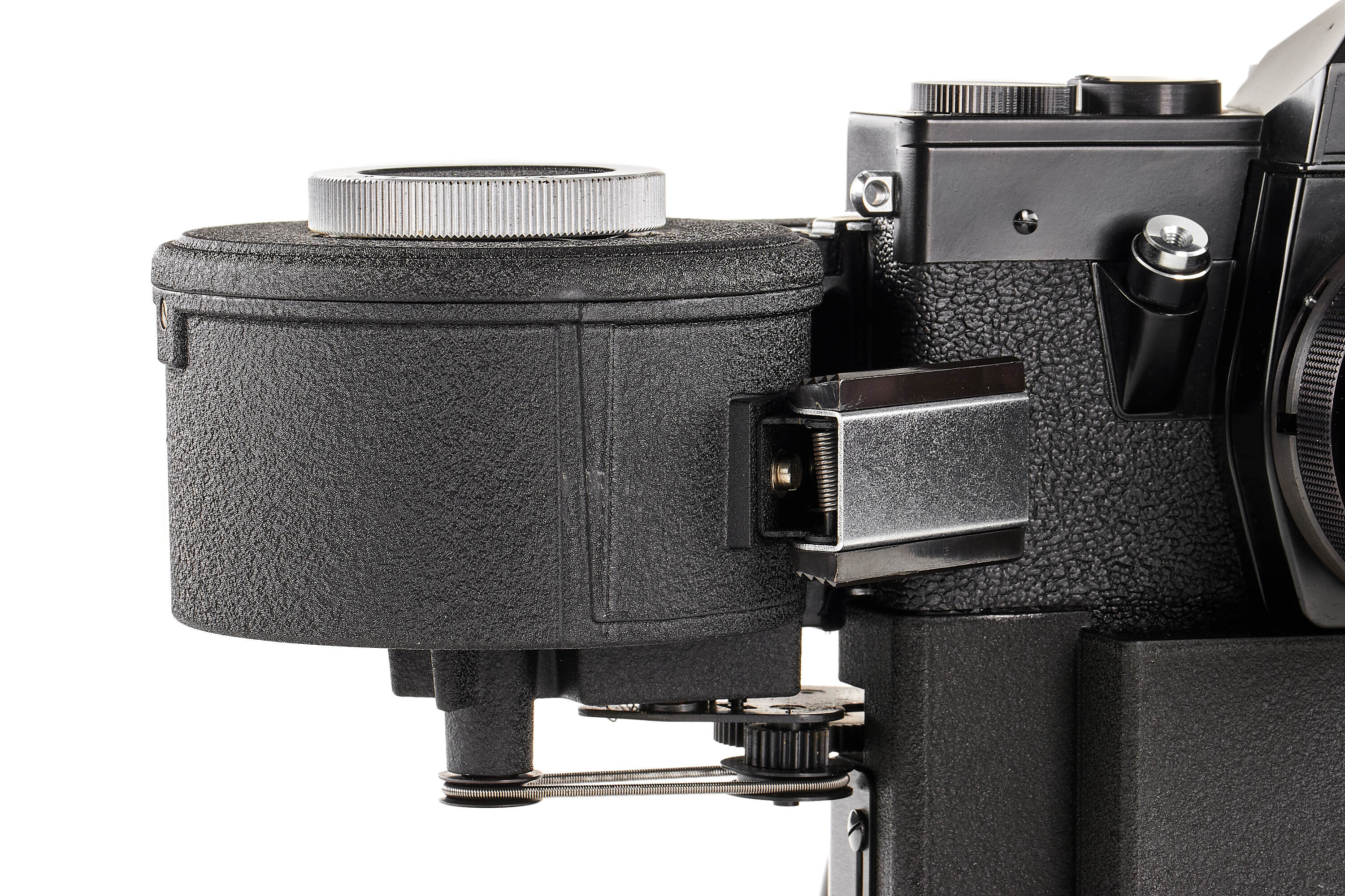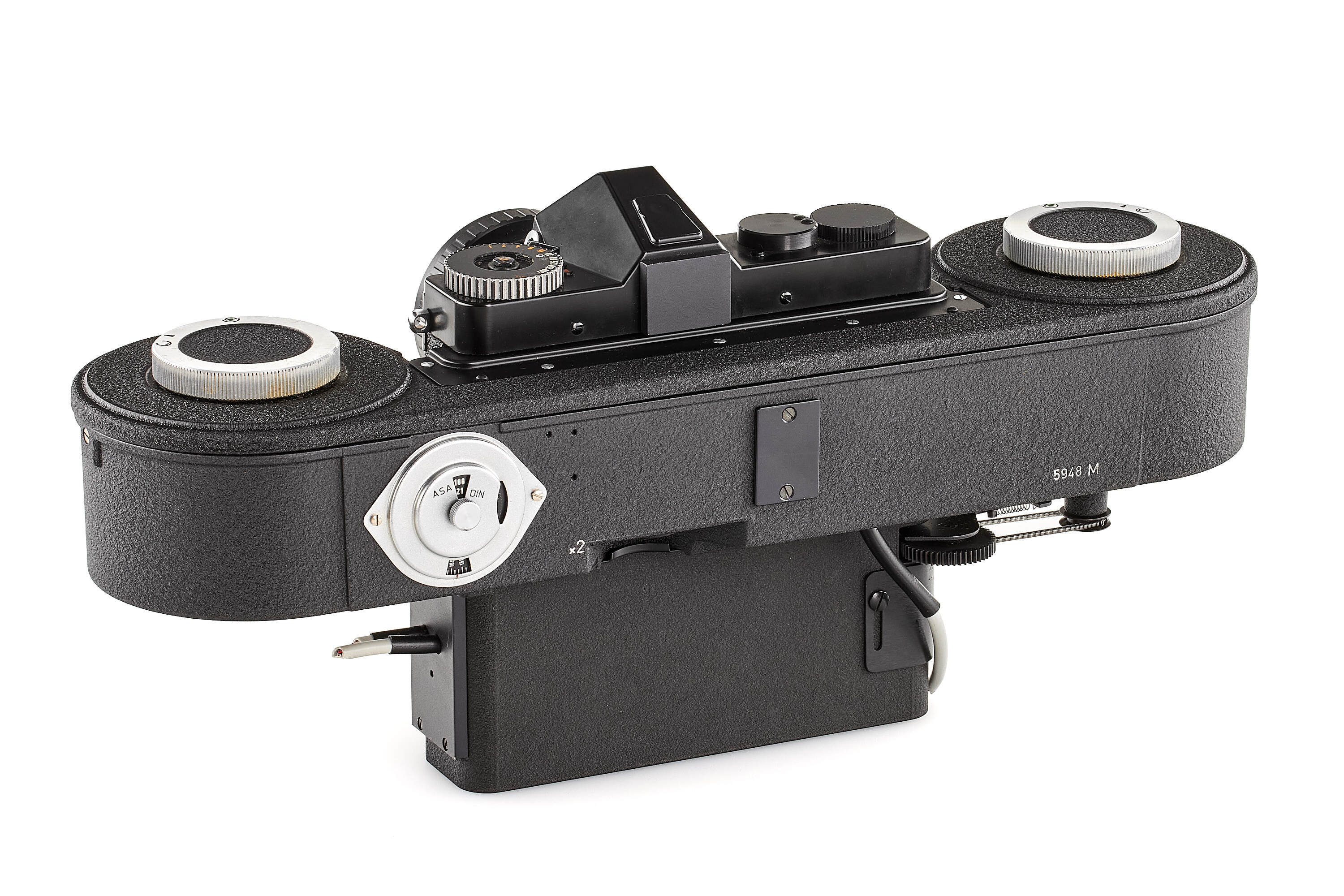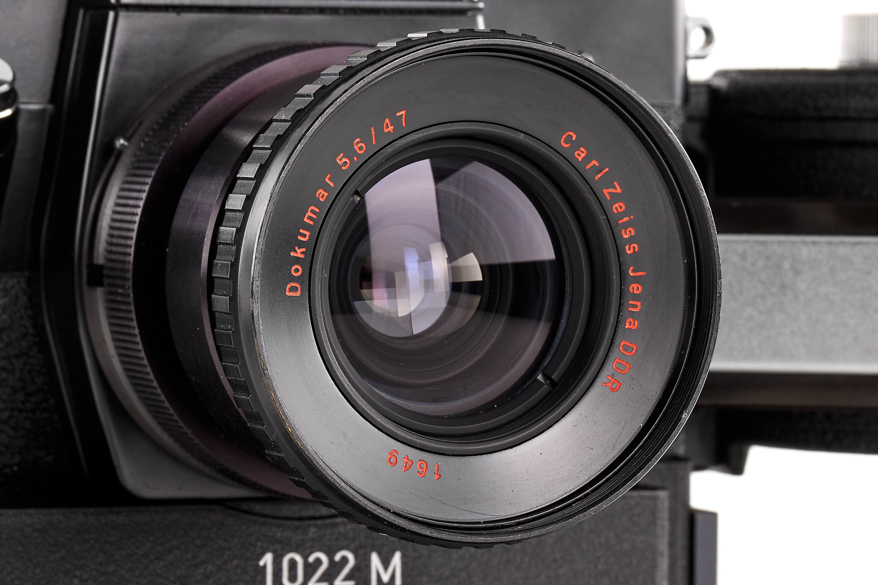 Very rare half format motorized camera developed by East German Secret Service 'STASI', based on a modified Praktica body, in almost mint condition, electric cables are cut off, with high resolution repro Zeiss Dokuma 5.6/47mm no.1649 (front cap), fixed focus and fixed aperture, clean and clear optics, with 450 exposure magazine no.5948, most probably used for reproduction of documents.